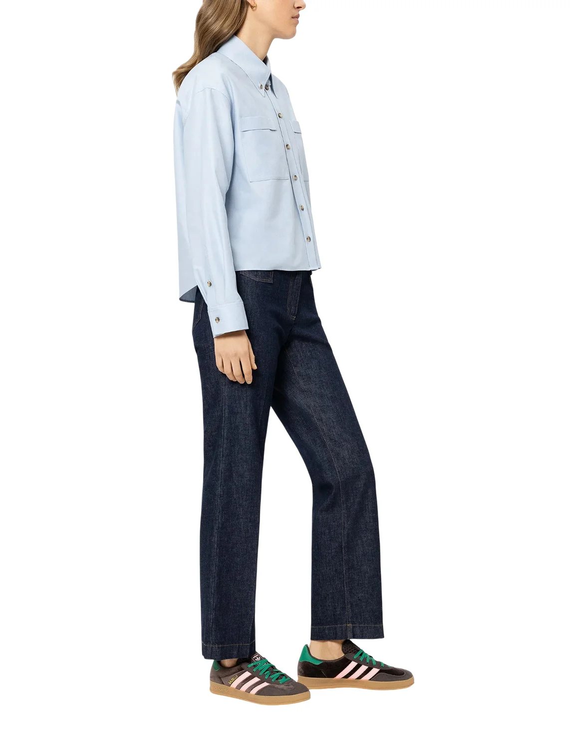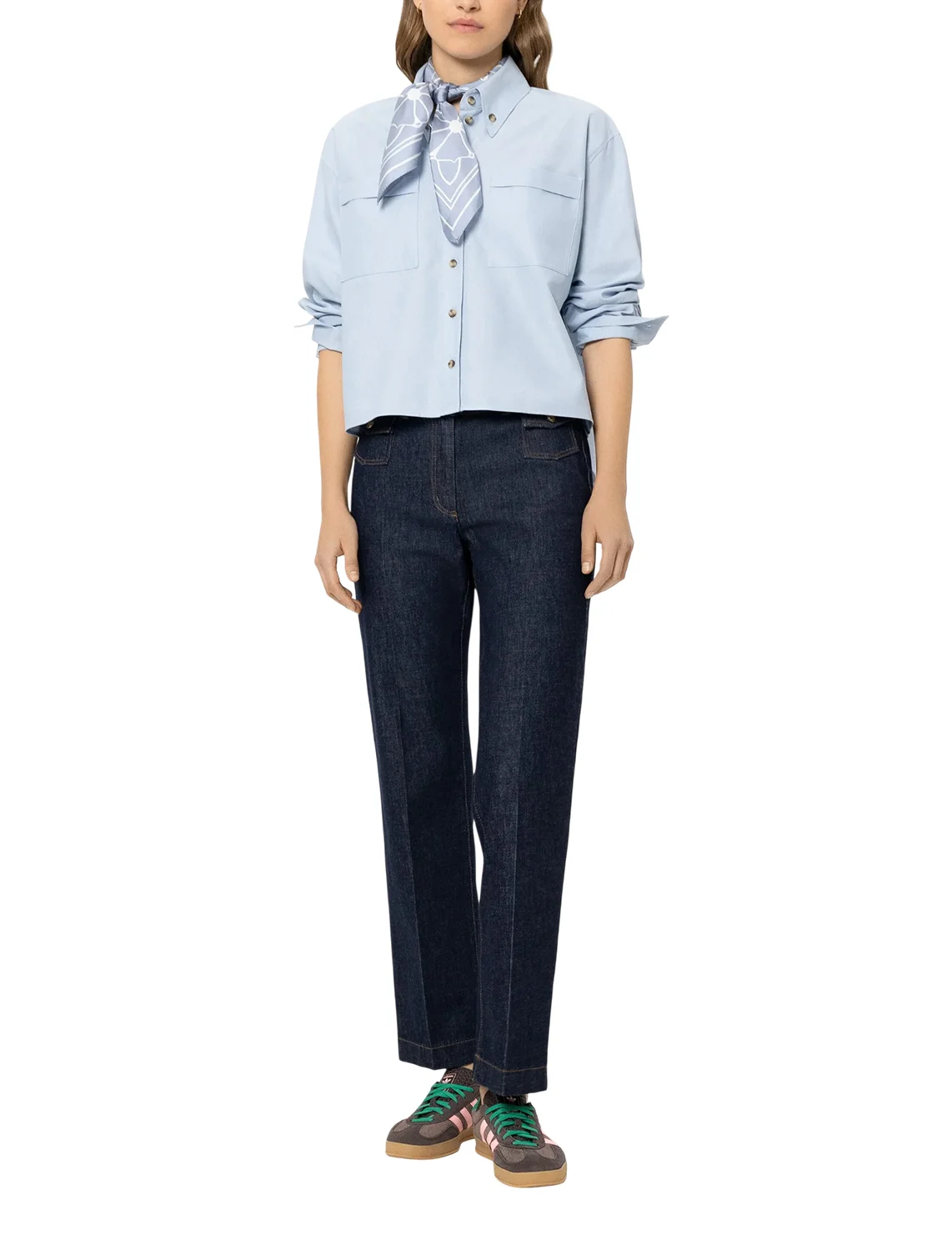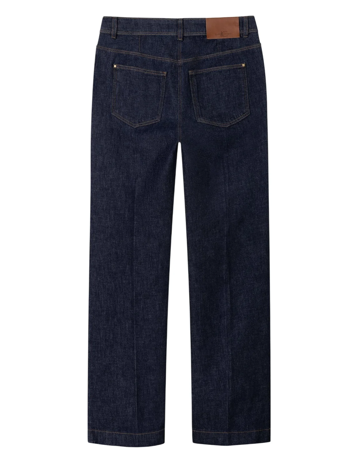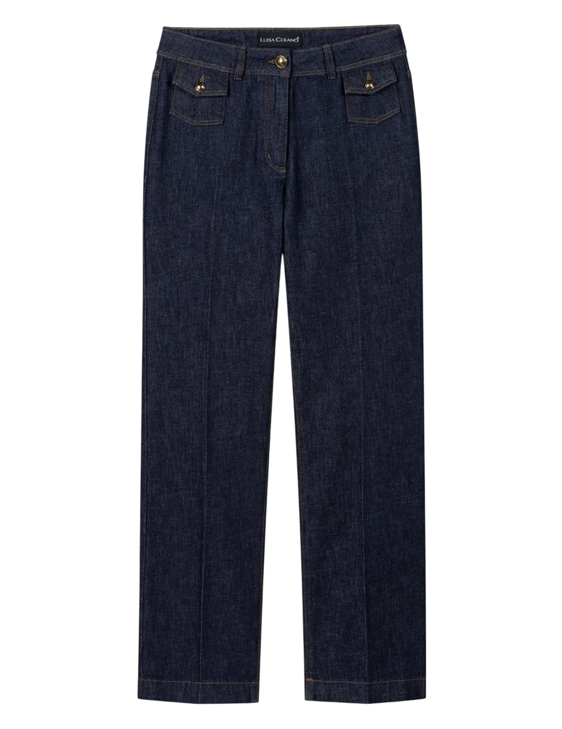 Джинсы изготовлены из хлопка и эластана. Модель выполнена в прямом крое. Имеет шлёвки для ремня, скрытую застежку-молнию с пуговицей, прессованные стрелки, а также пару передних накладных карманов с клапанами и пару задних накладных карманов.