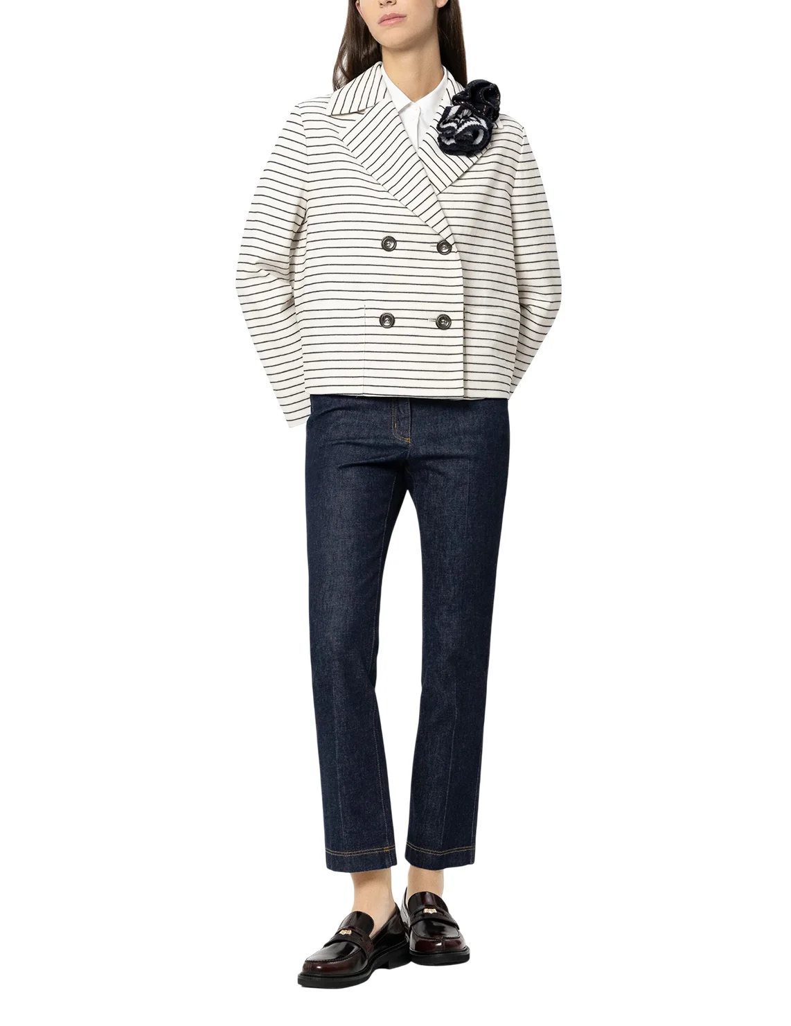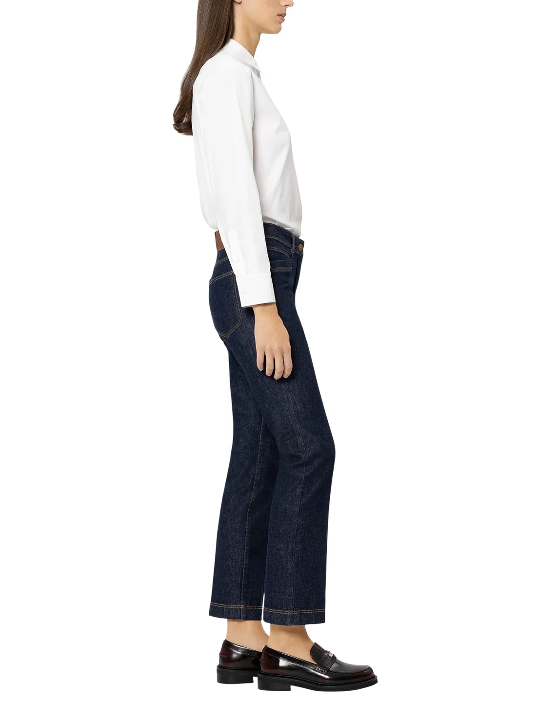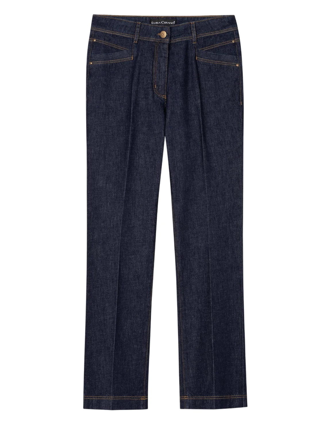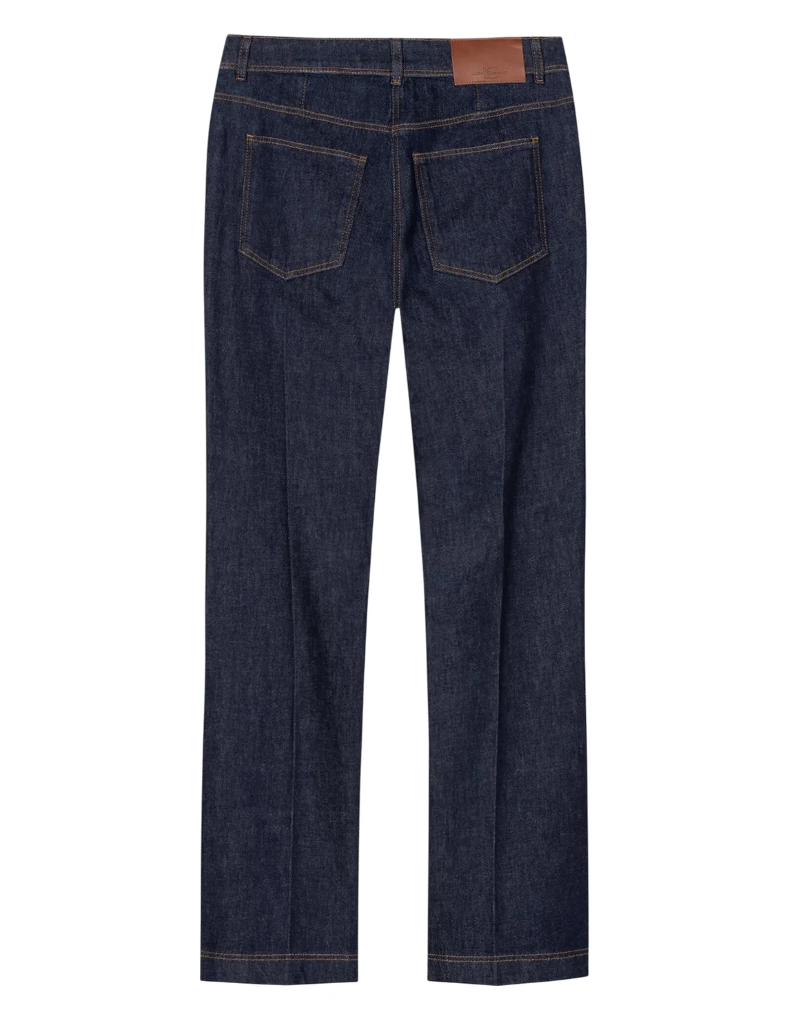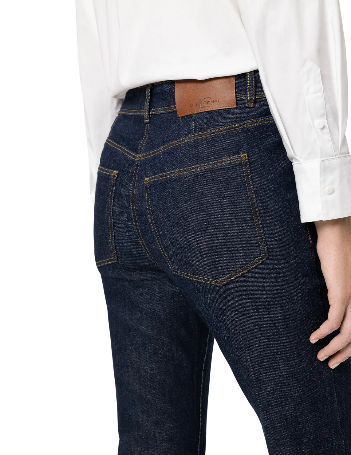 Джинсы изготовлены из хлопка и эластана. Модель выполнена в прямом крое. Имеет шлёвки для ремня, скрытую застежку-молнию с пуговицей, прессованные стрелки, а также пару передних прорезных и пару задних накладных карманов.