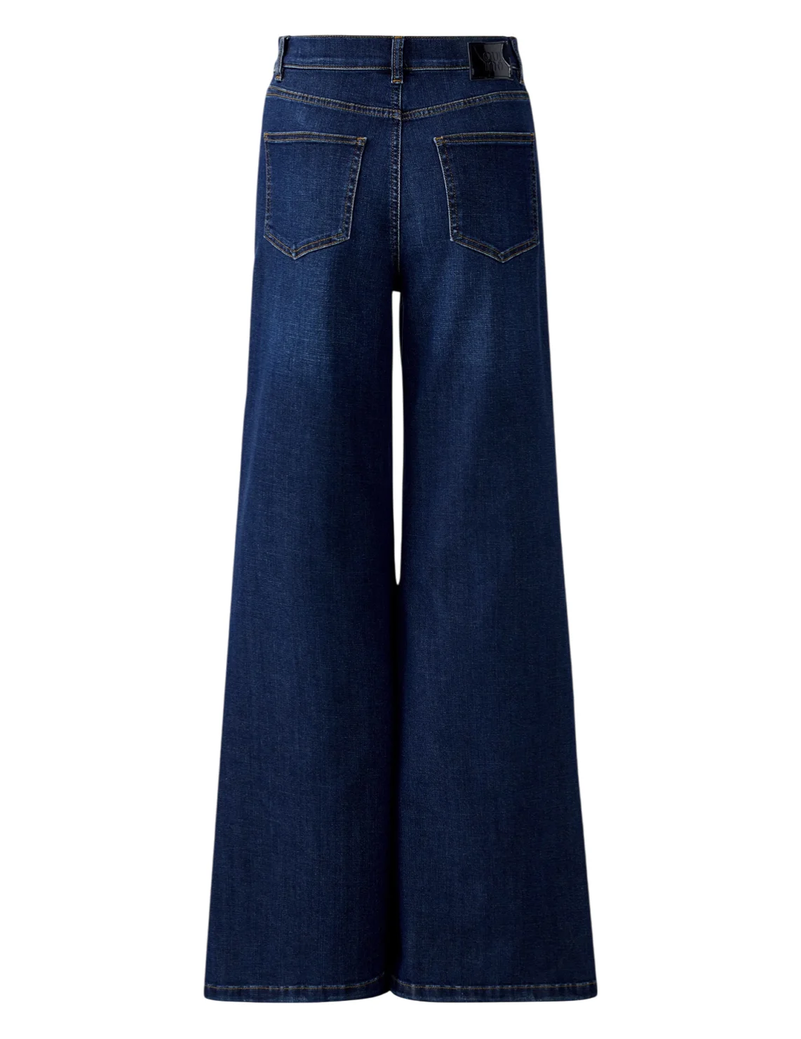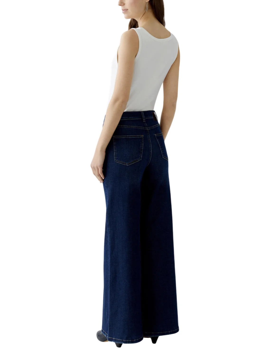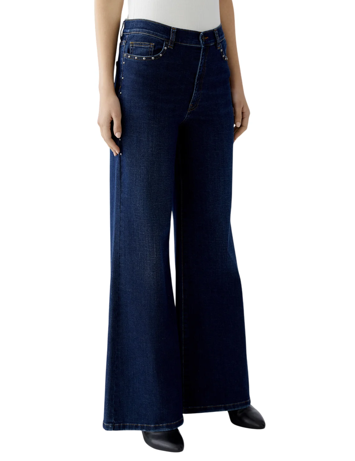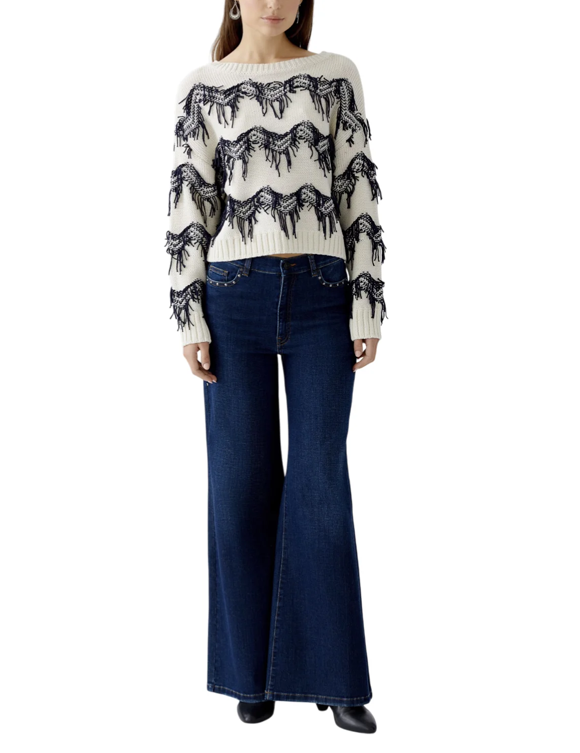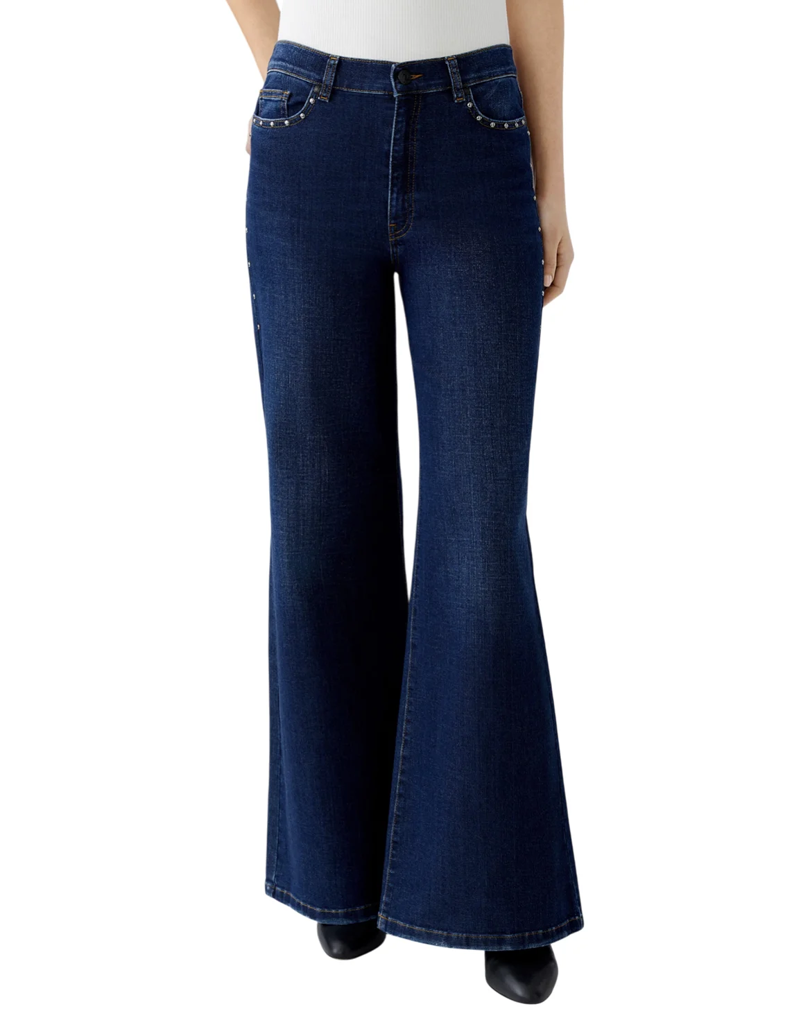 Джинсы изготовлены из хлопка, полиэстера и эластана. Модель выполнена в расклешенном крое. Имеет шлёвки для ремня, скрытую застежку-молнию с пуговицей, а также пару передних прорезных и пару задних накладных карманов. Декорированы металлическими заклепками.