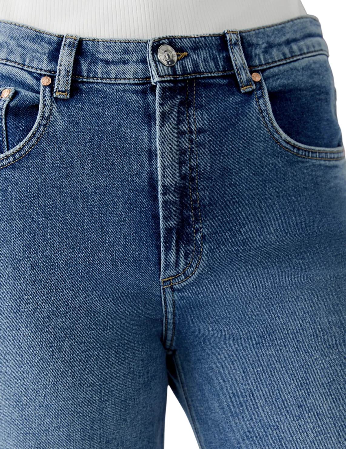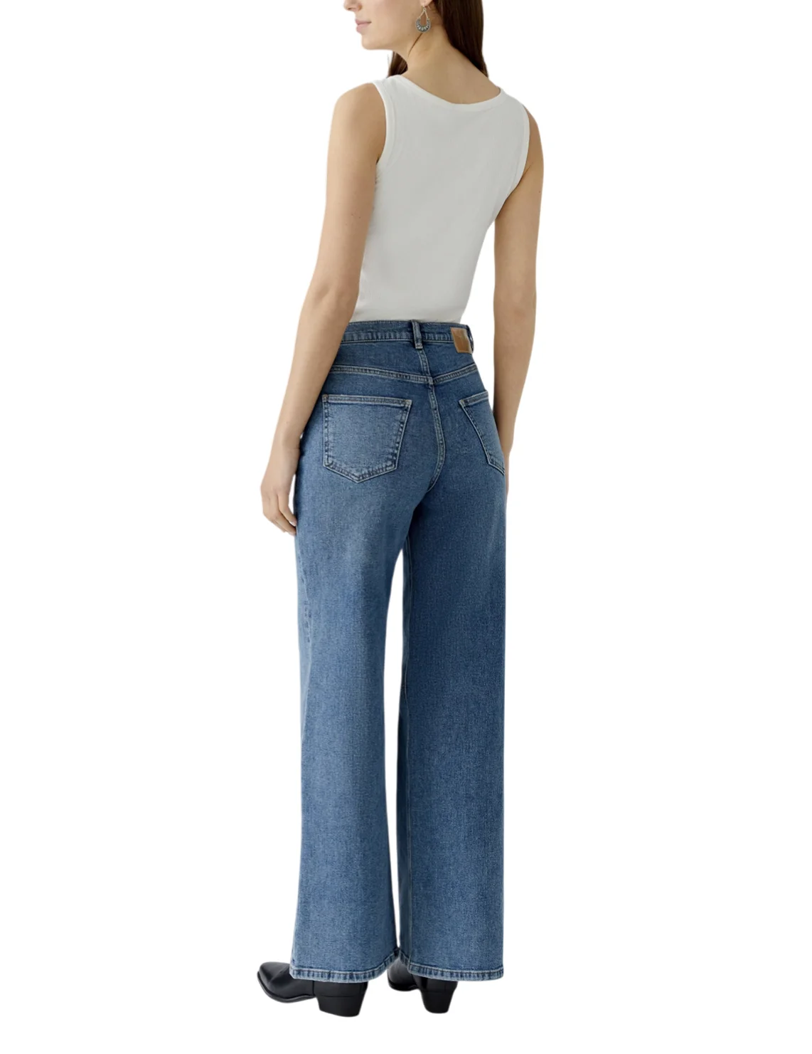 Джинсы изготовлены из хлопка и эластана. Модель выполнена в свободном крое. Имеет шлёвки для ремня, скрытую застежку-молнию с пуговицей, а также пару передних прорезных и пару задних накладных карманов.