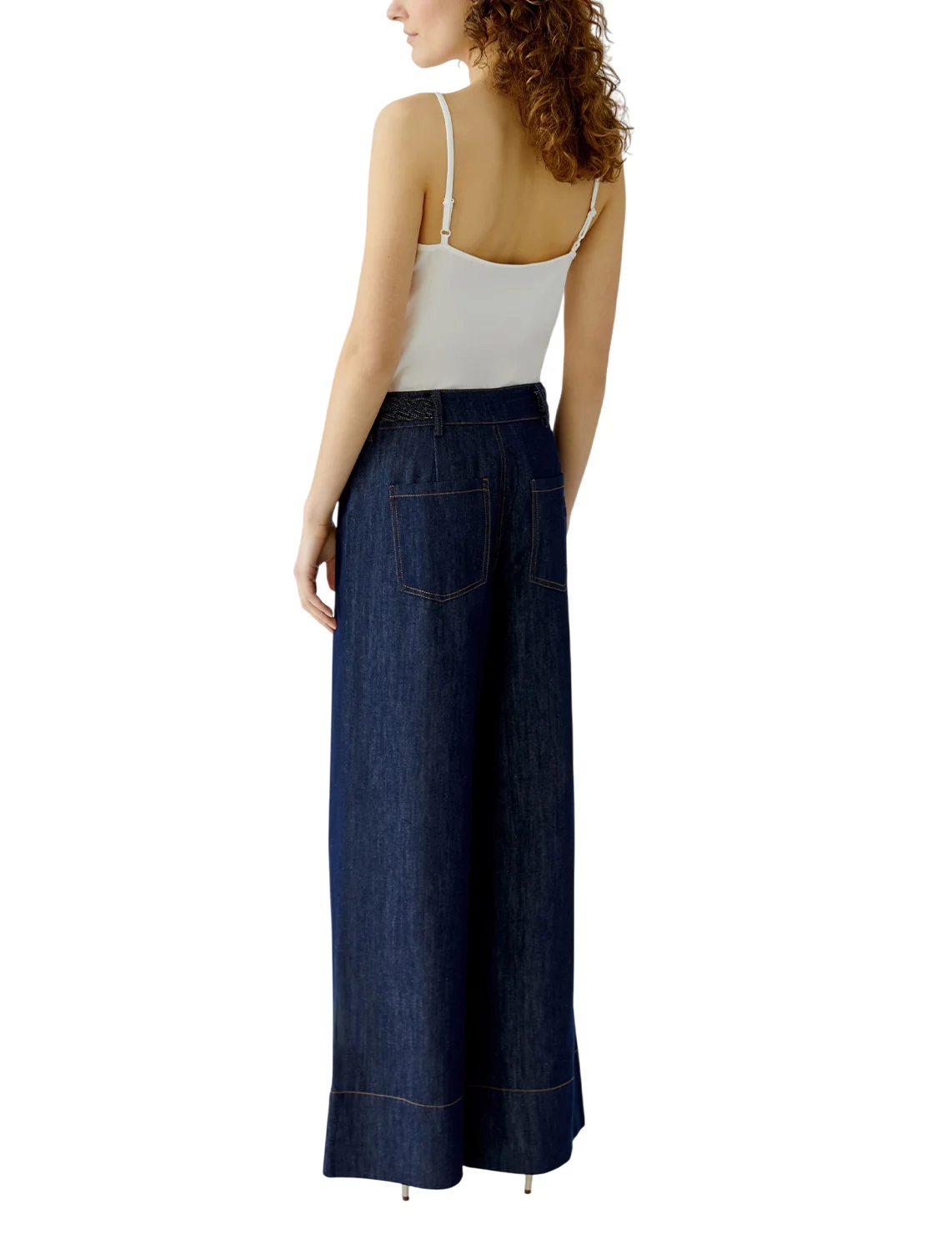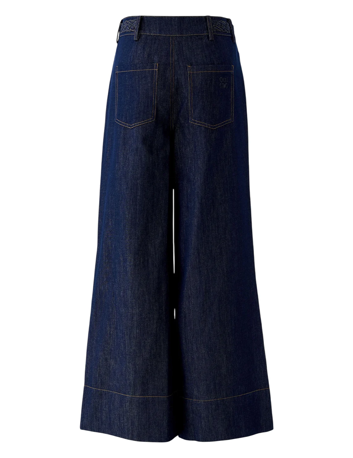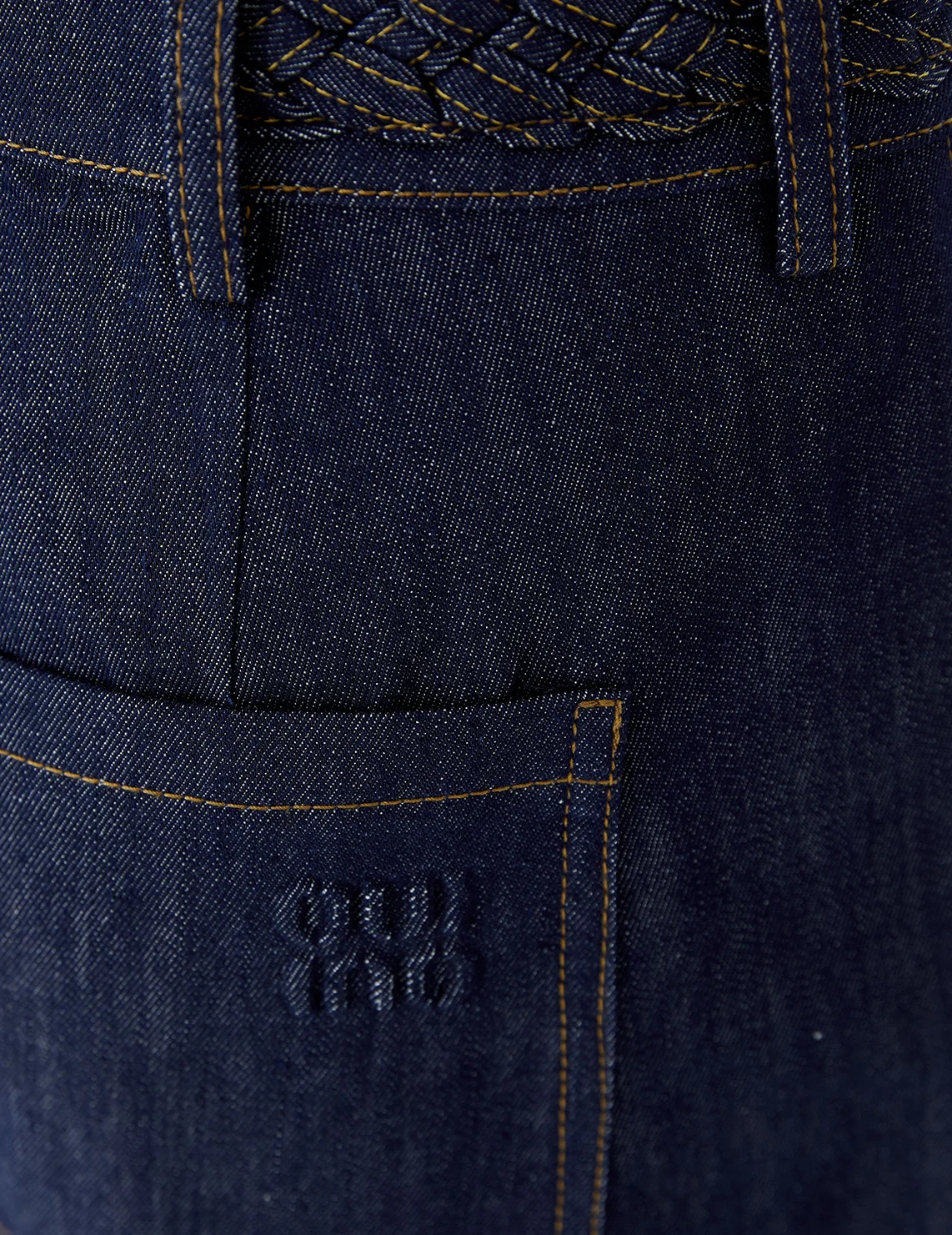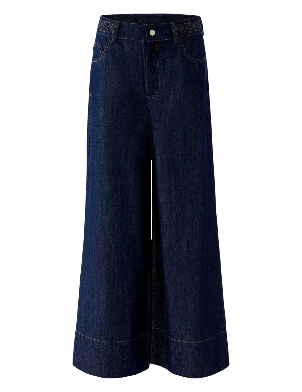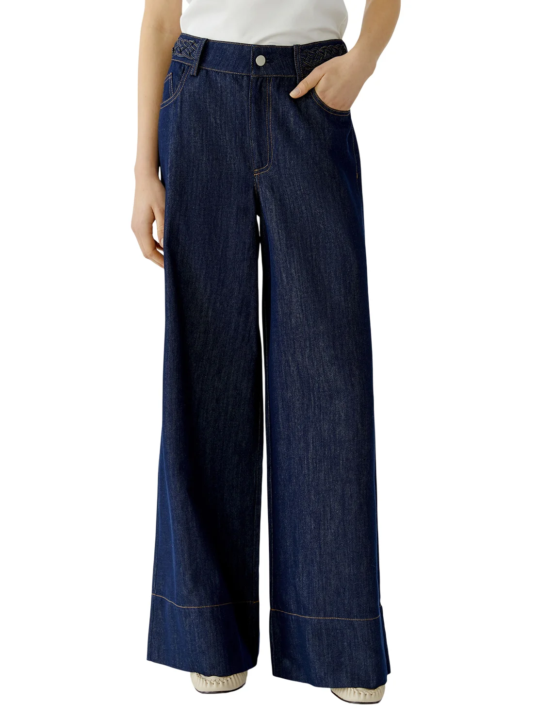Джинсы изготовлены из хлопка и полиэстера. Модель выполнена в свободном крое. Имеет шлёвки для ремня, скрытую застежку-молнию с пуговицей, а также пару передних прорезных и пару задних накладных карманов.
