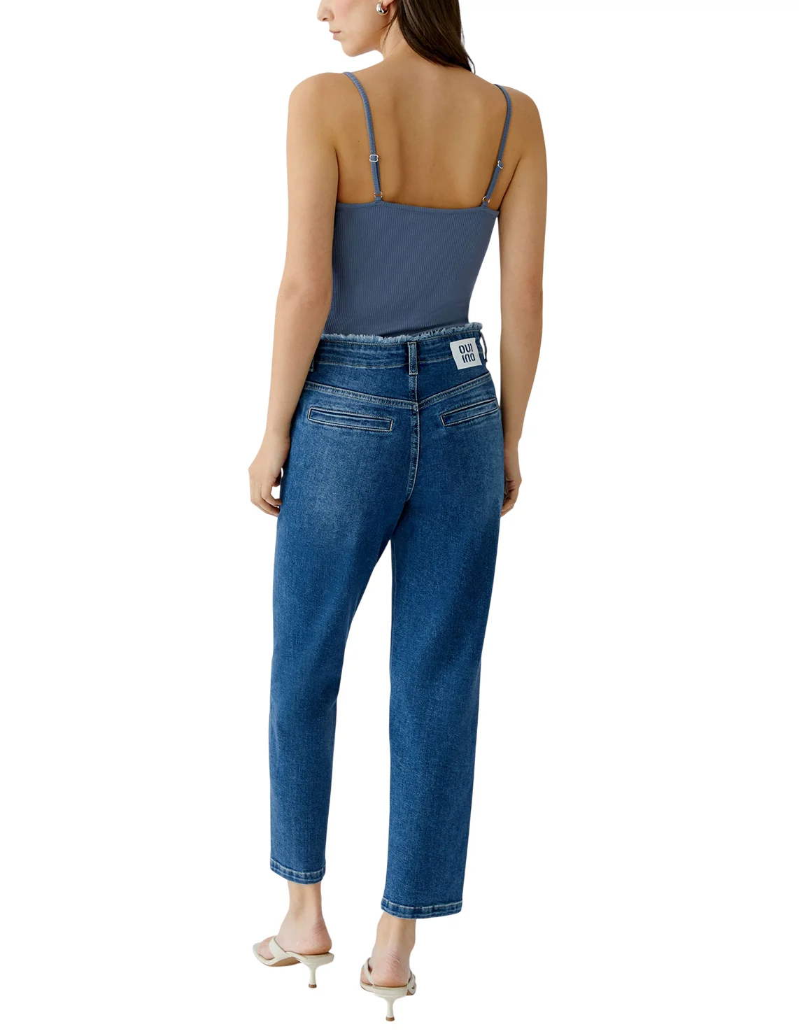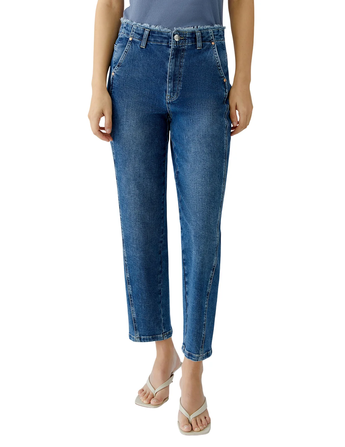 Джинсы изготовлены из хлопка, эластана и других волокон. Модель выполнена в прямом крое. Имеет шлёвки для ремня, скрытую застежку-молнию с пуговицей, прорезные боковые и декоративные задние карманы. Декорированы бахромой.