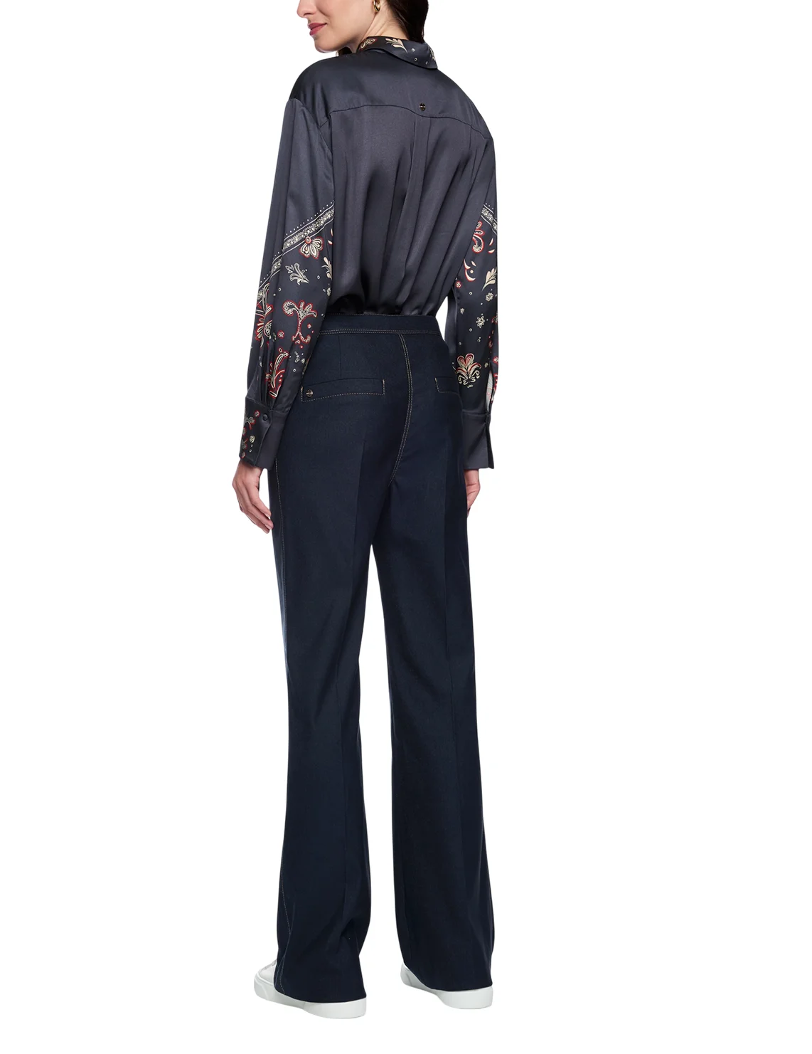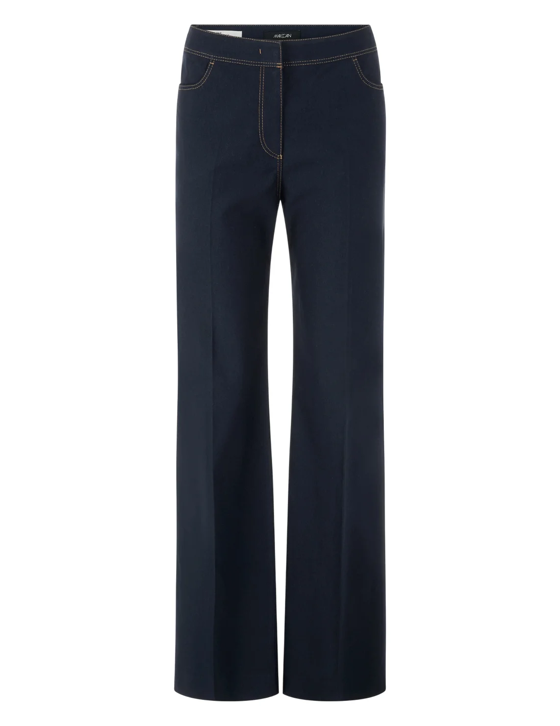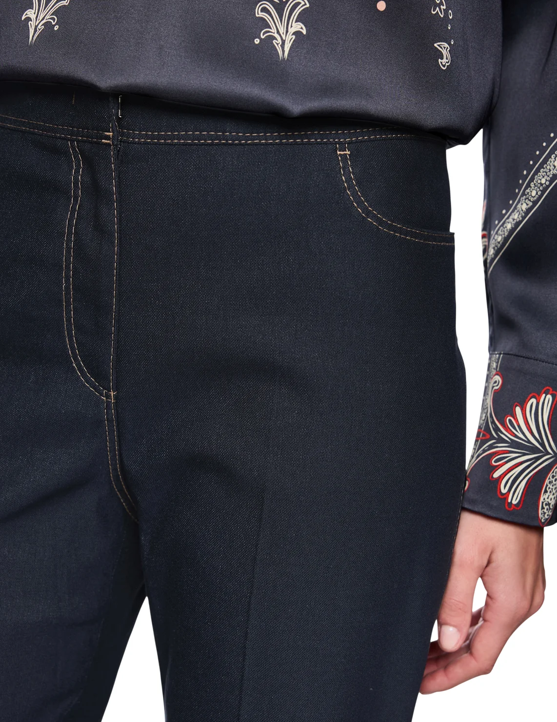 Джинсы изготовлены из хлопка, полиэстера, вискозы и эластана. Модель выполнена в прямом крое. Имеет скрытую застежку-молнию с крючком, прессованные стрелки, а также пару передних и пару задних прорезных карманов. Декорированы контрастными швами.