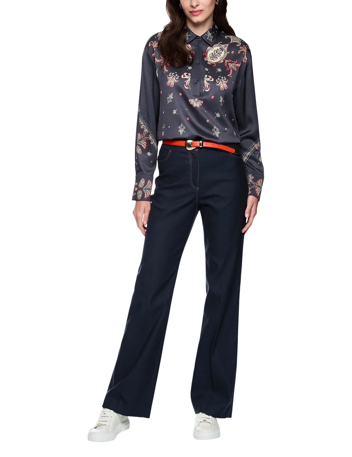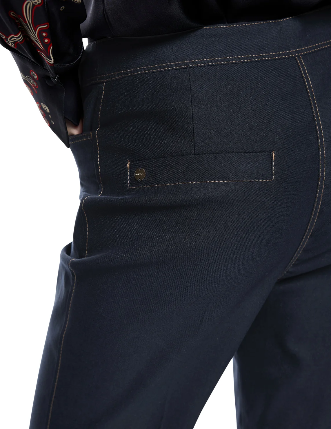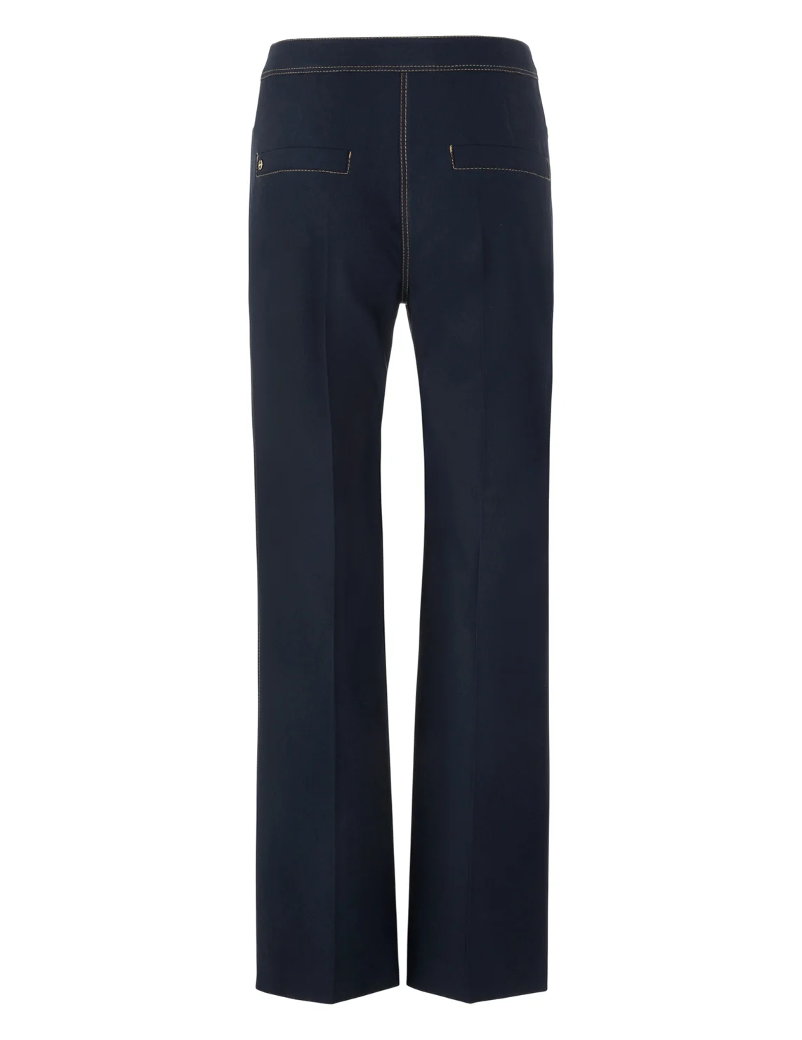 Джинсы изготовлены из хлопка, полиэстера, вискозы и эластана. Модель выполнена в прямом крое. Имеет скрытую застежку-молнию с крючком, прессованные стрелки, а также пару передних и пару задних прорезных карманов. Декорированы контрастными швами.