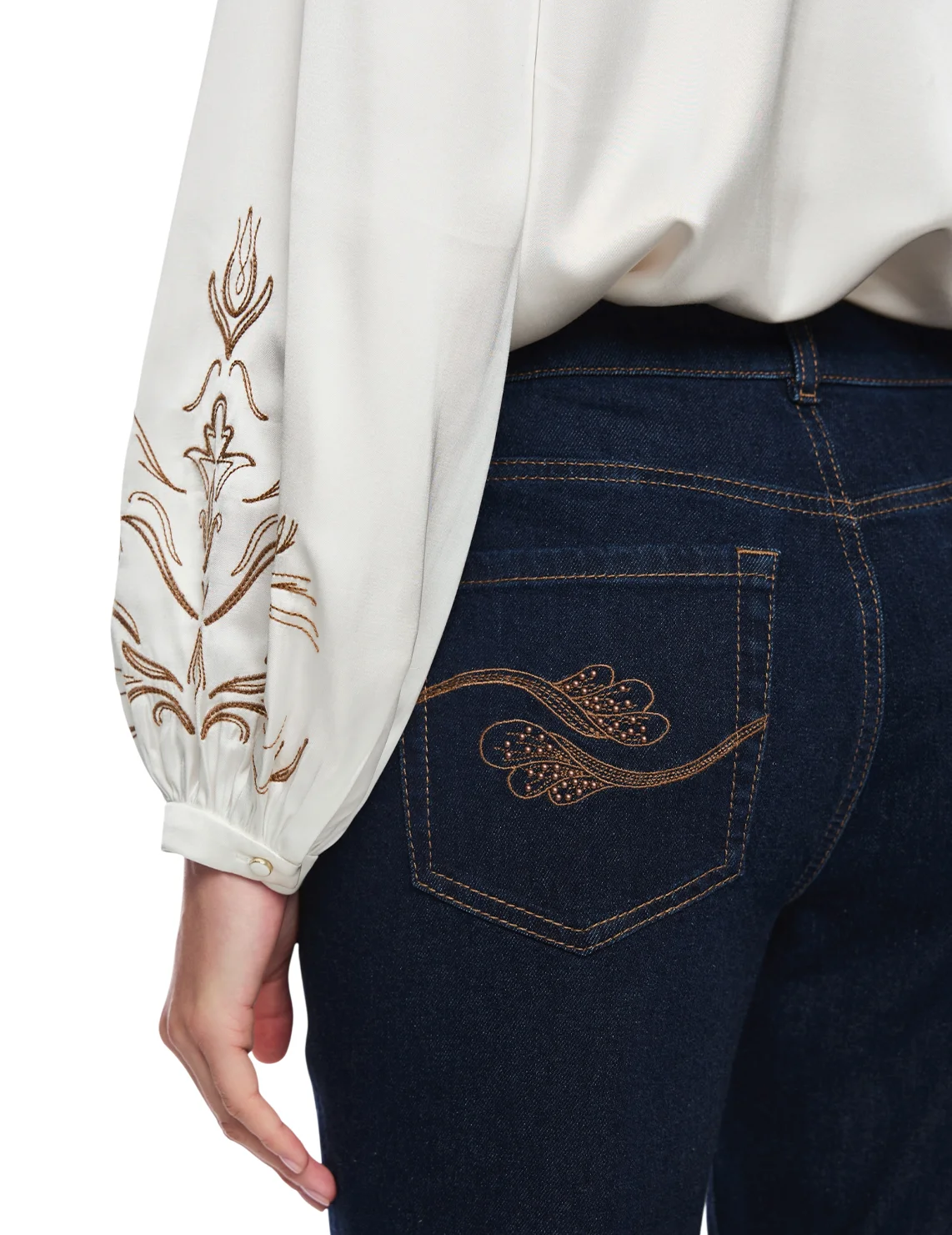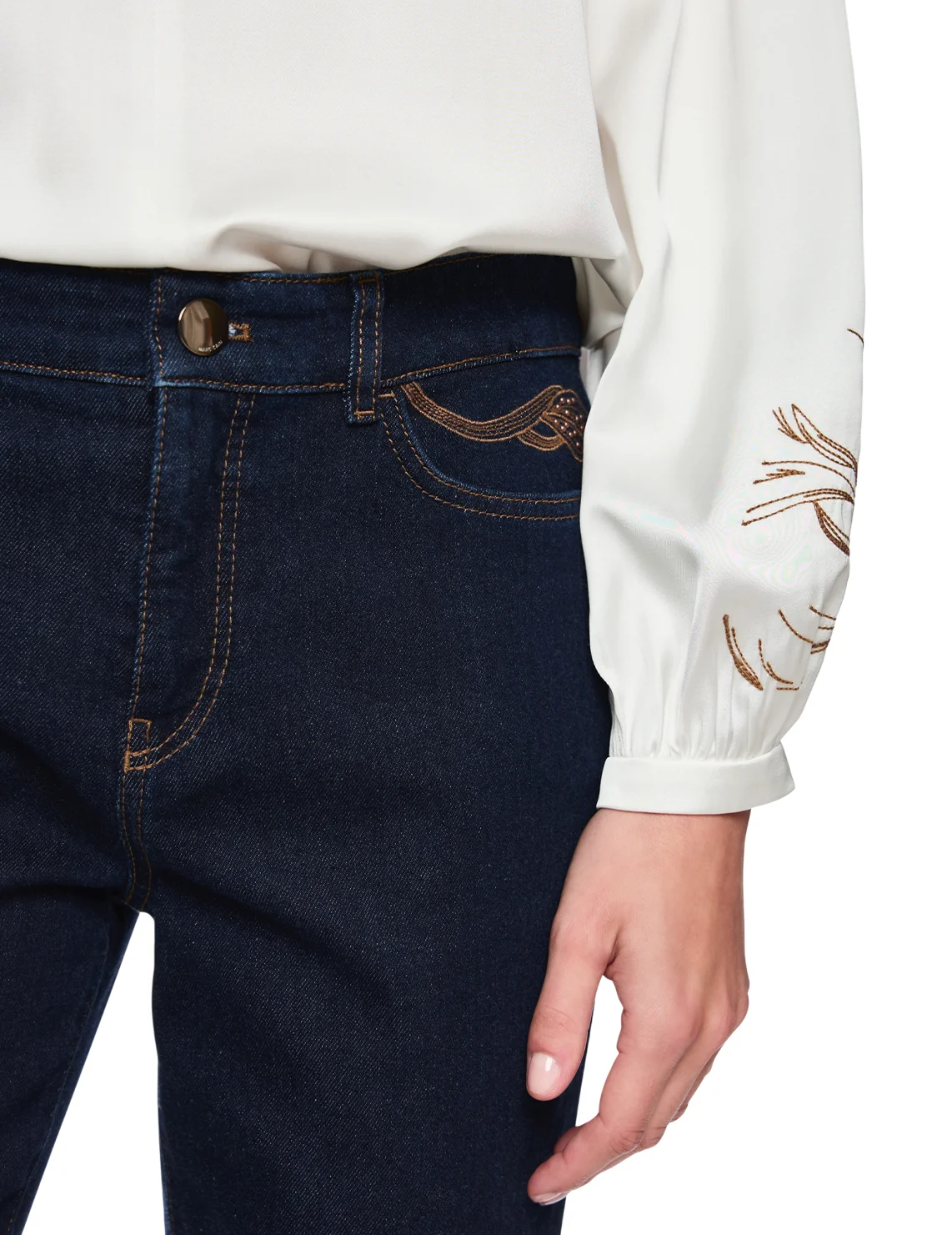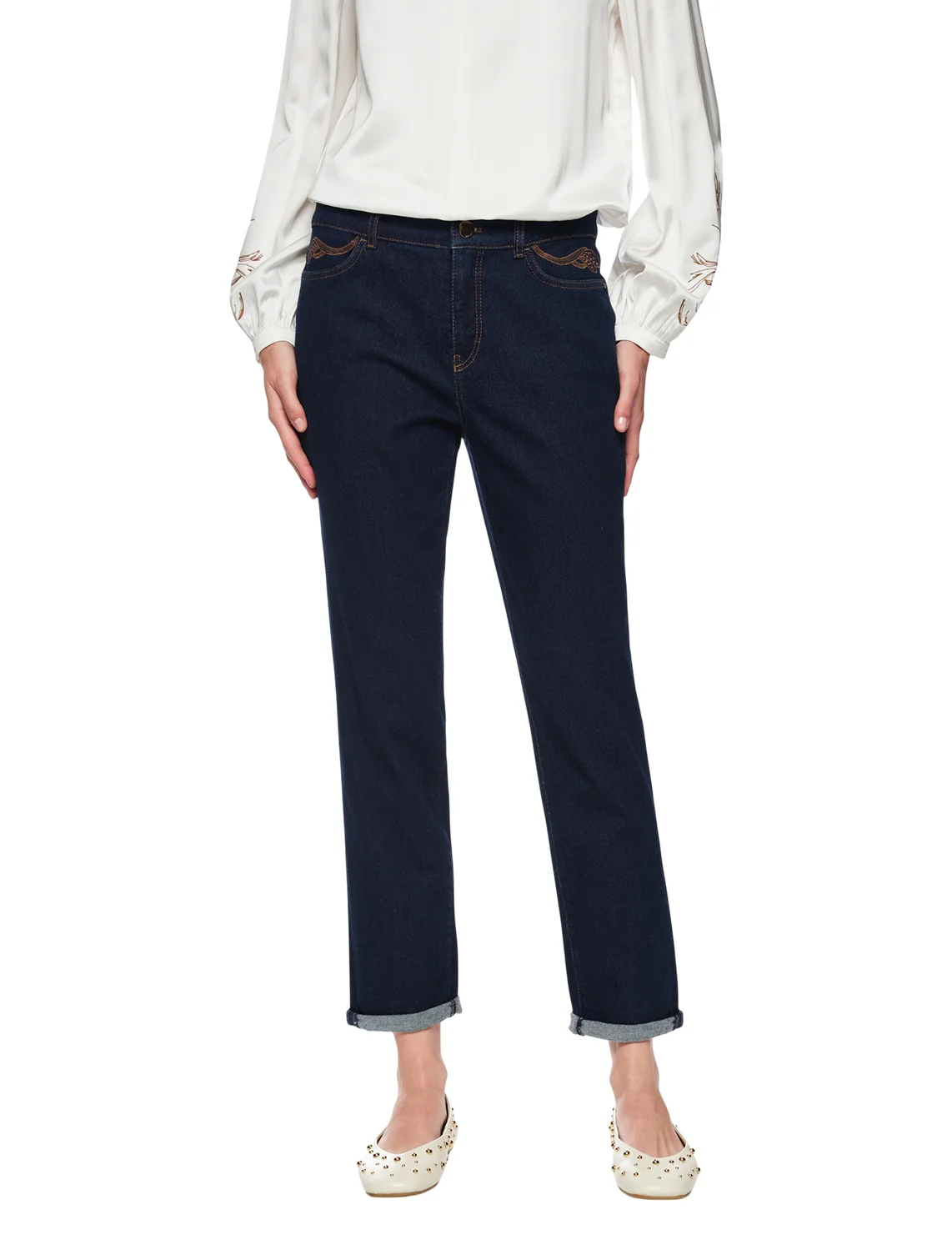 Джинсы изготовлены из хлопка и эластана. Модель выполнена в прямом крое. Имеет скрытую застежку-молнию с пуговицей, отвороты, а также пару передних прорезных и пару задних накладных карманов. Декорированы вышивкой.