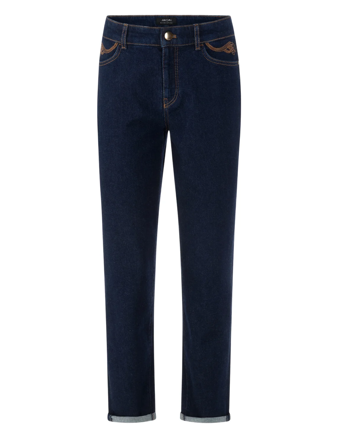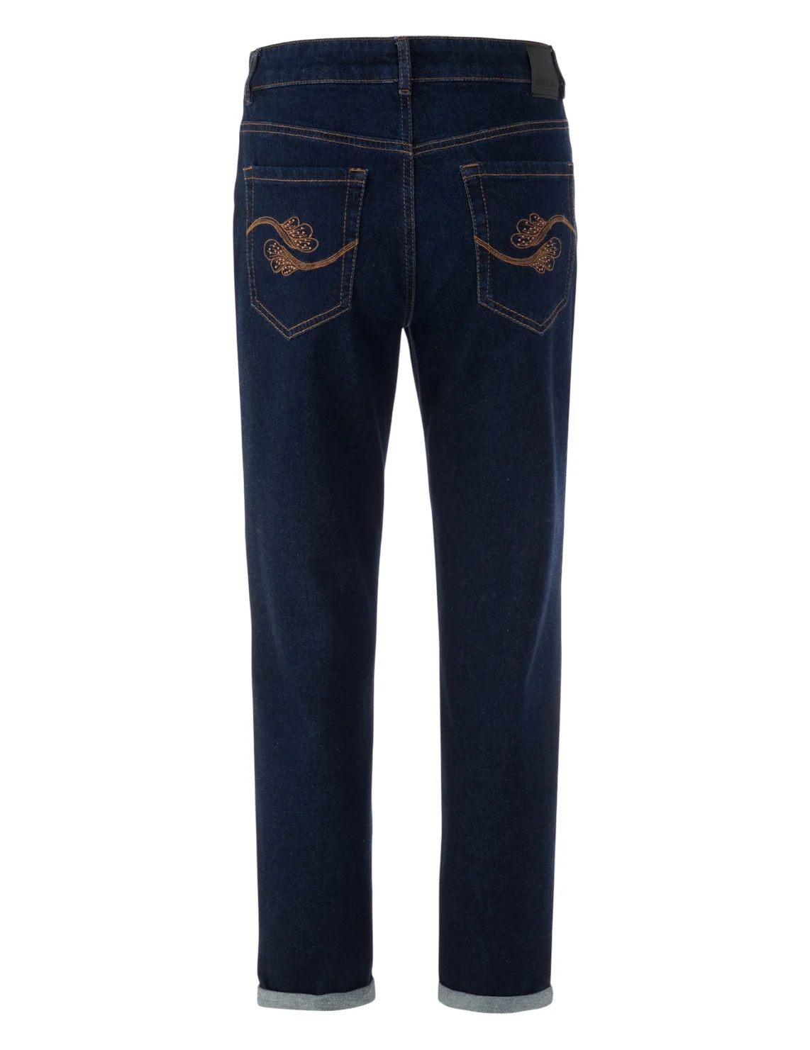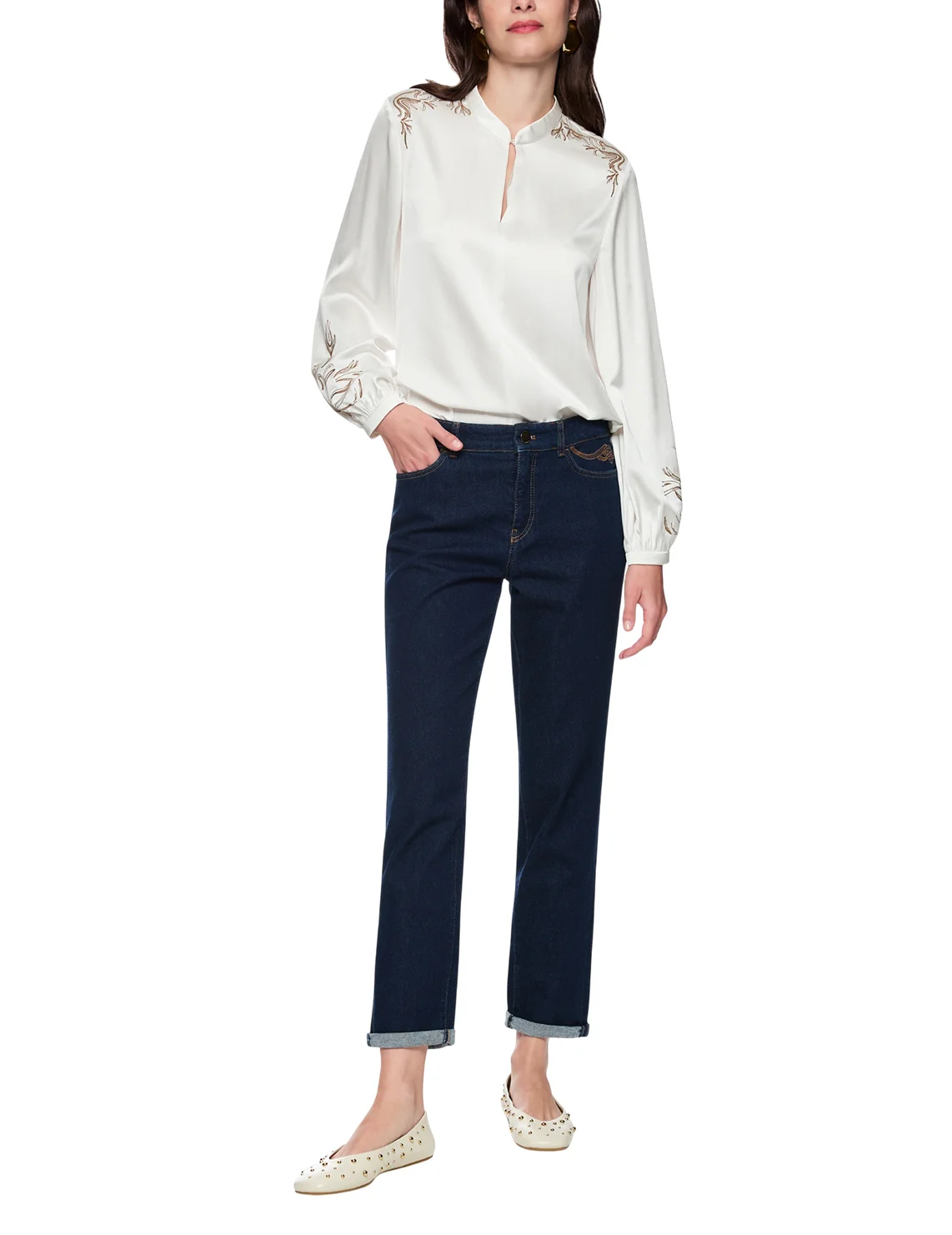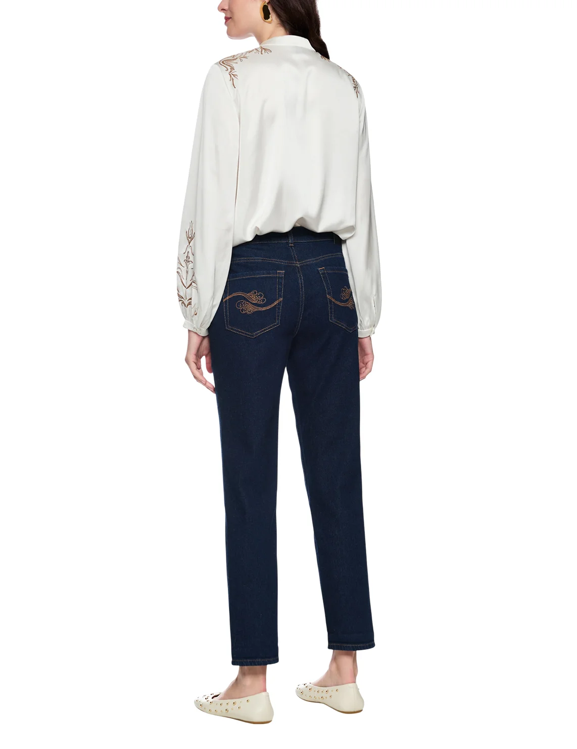 Джинсы изготовлены из хлопка и эластана. Модель выполнена в прямом крое. Имеет скрытую застежку-молнию с пуговицей, отвороты, а также пару передних прорезных и пару задних накладных карманов. Декорированы вышивкой.
