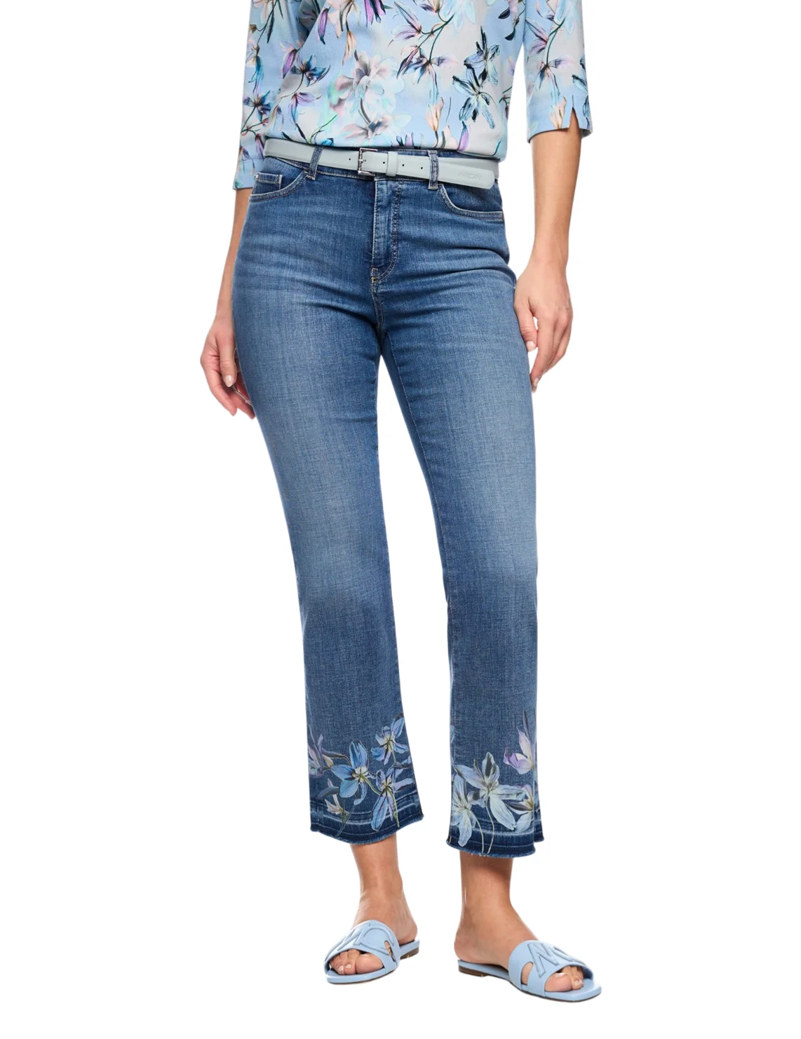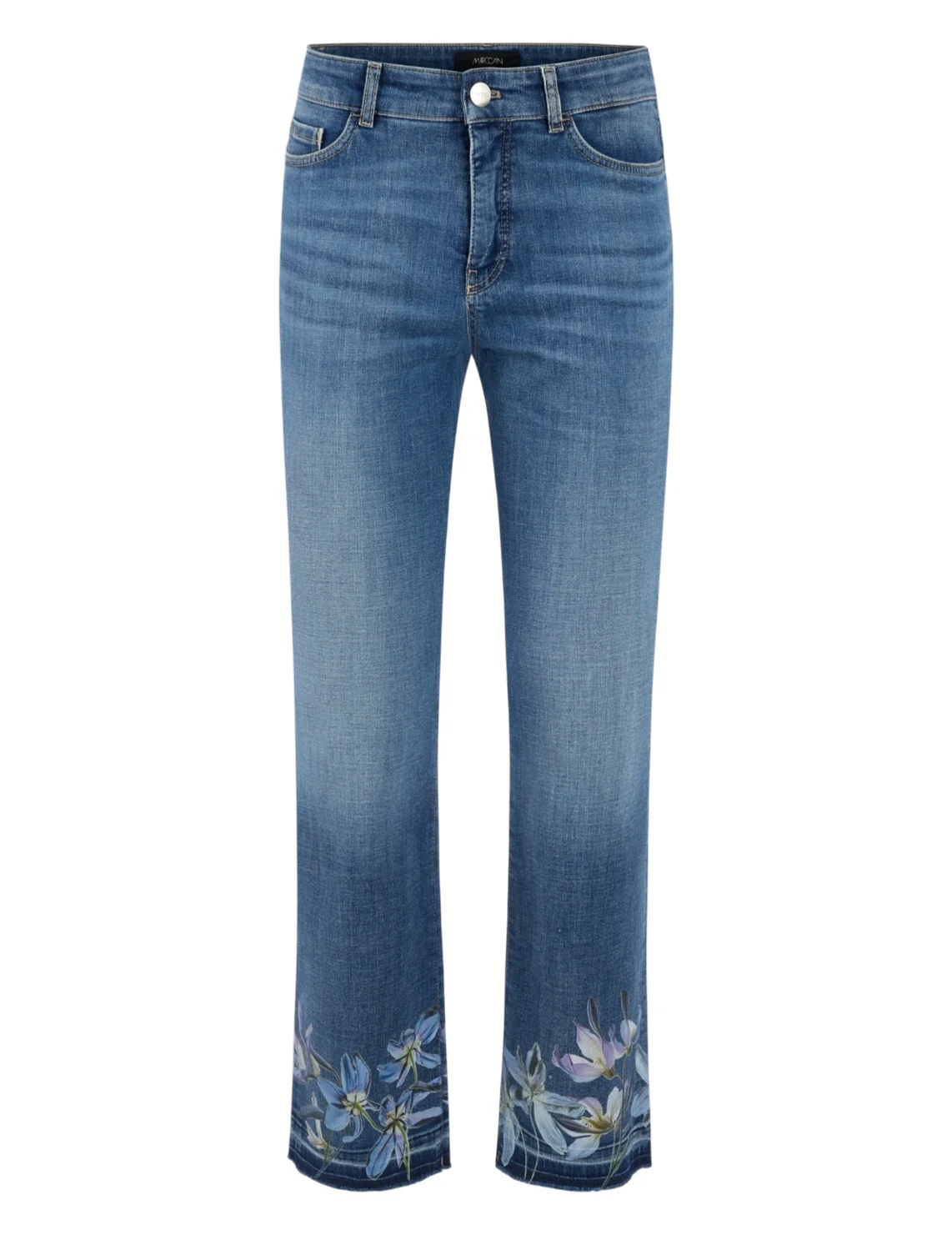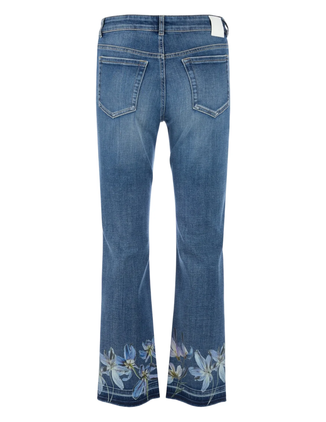 Джинсы изготовлены из хлопка и эластана. Модель выполнена в прямом крое. Имеет петли для ремня, скрытую застежку на молнии и пуговице, два передних прорезных и два задних накладных кармана. Изделие декорировано цветочным принтом на подоле брюк.