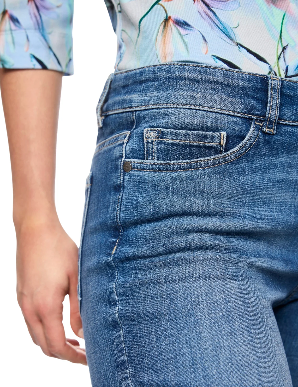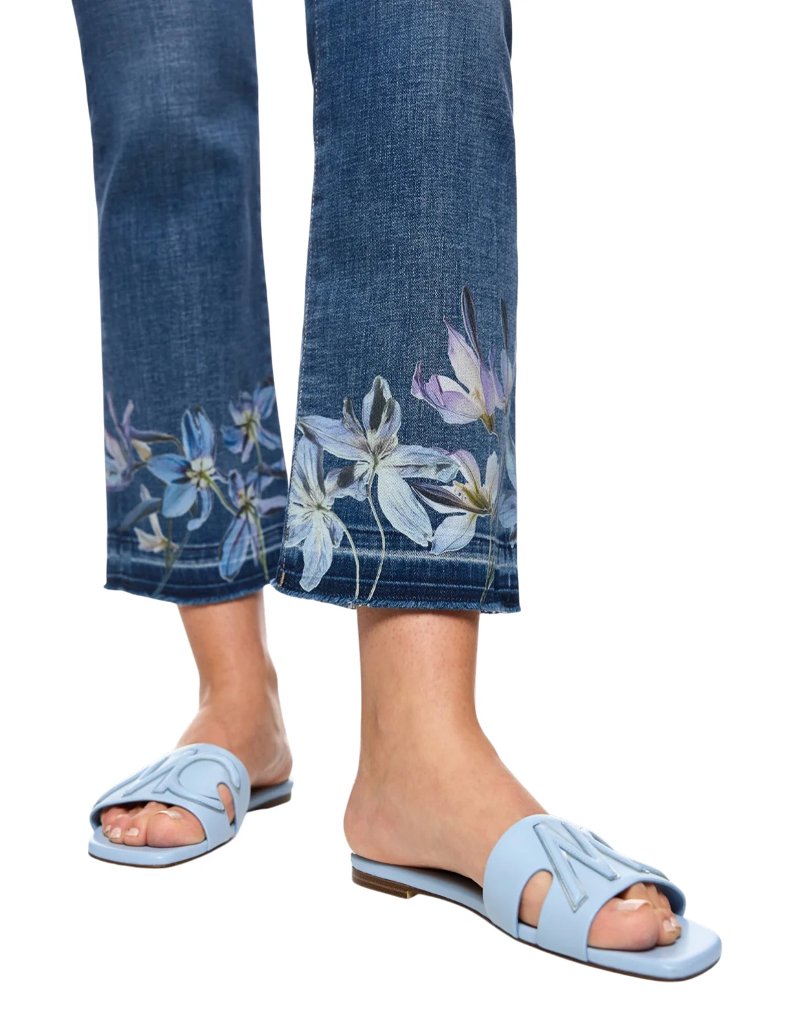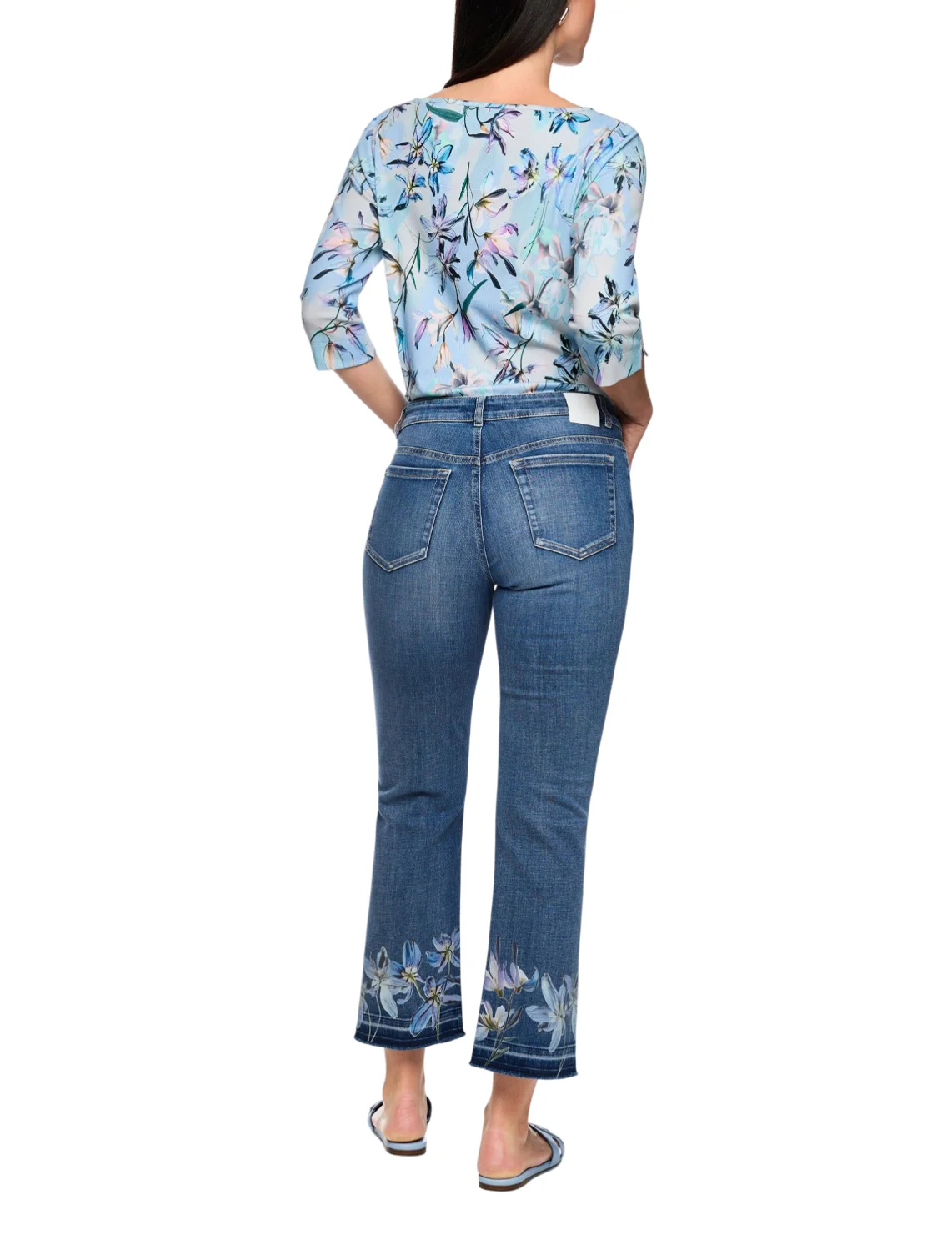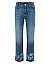 Джинсы изготовлены из хлопка и эластана. Модель выполнена в прямом крое. Имеет петли для ремня, скрытую застежку на молнии и пуговице, два передних прорезных и два задних накладных кармана. Изделие декорировано цветочным принтом на подоле брюк.