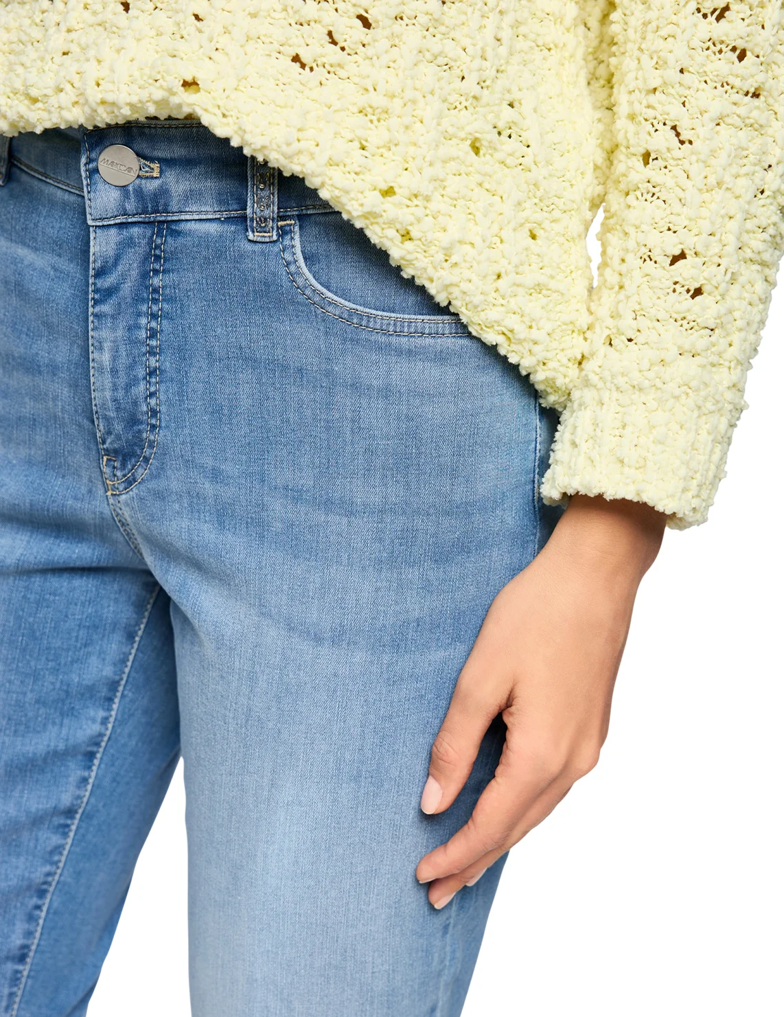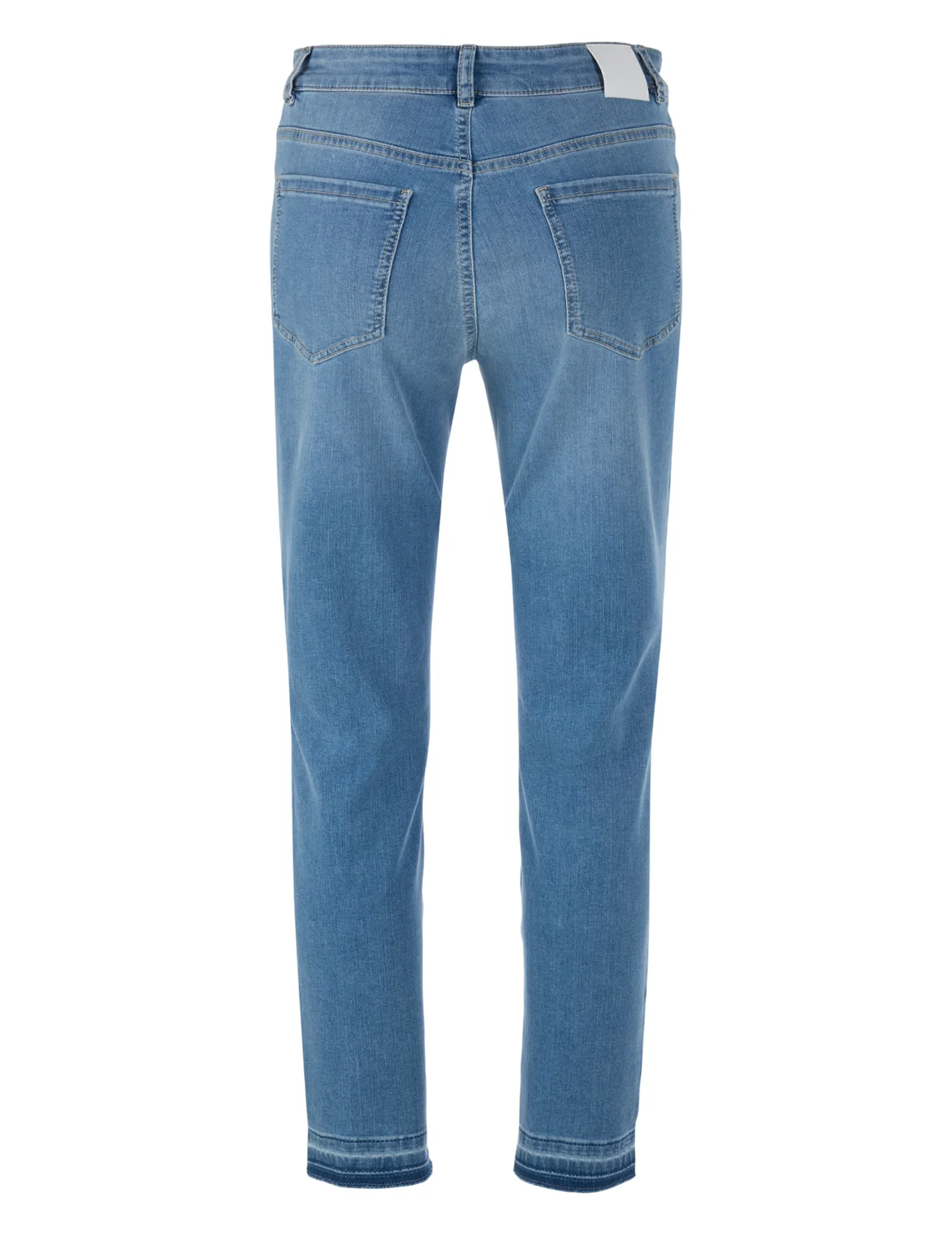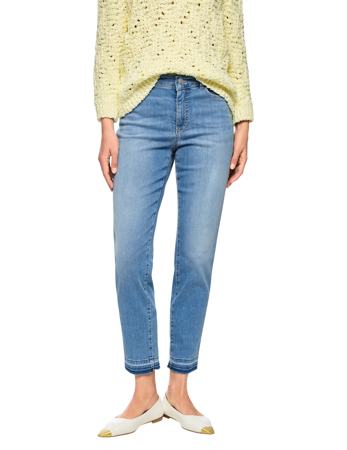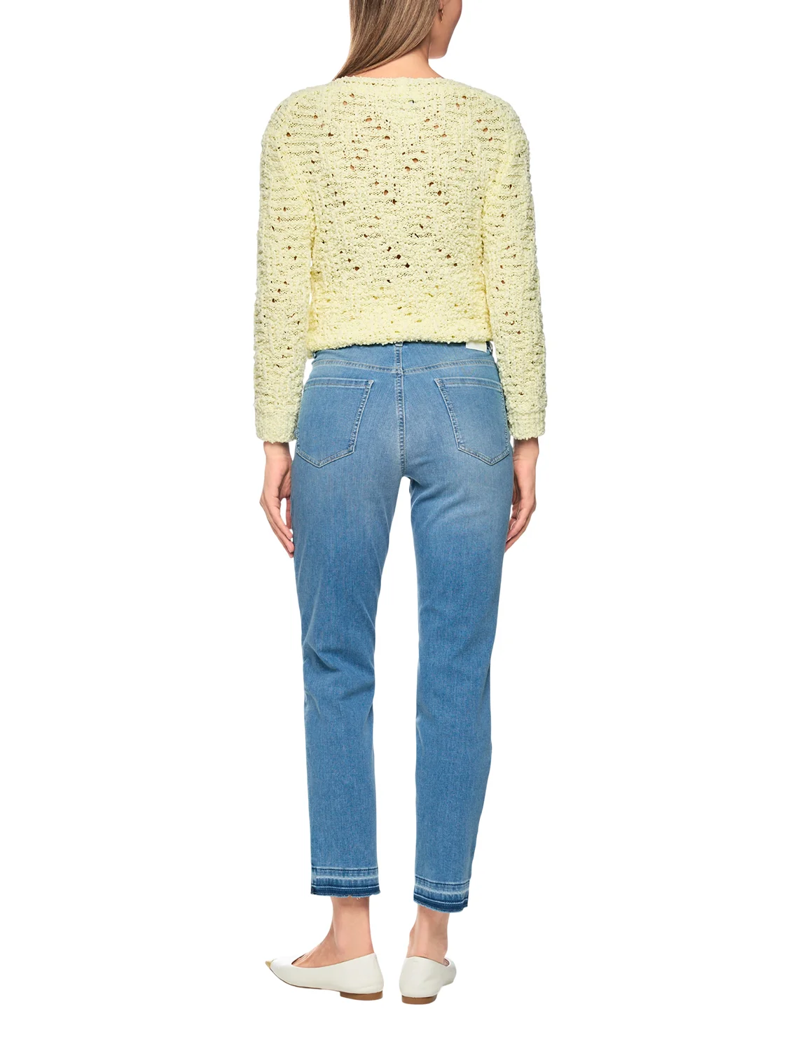 Джинсы изготовлены из хлопка, полиэстера и эластана. Модель выполнена в зауженном крое. Имеет петли для ремня, скрытую застежку-молнию с пуговицей, бахрому на подоле штанин, два боковых прорезных и два задних накладных кармана.