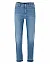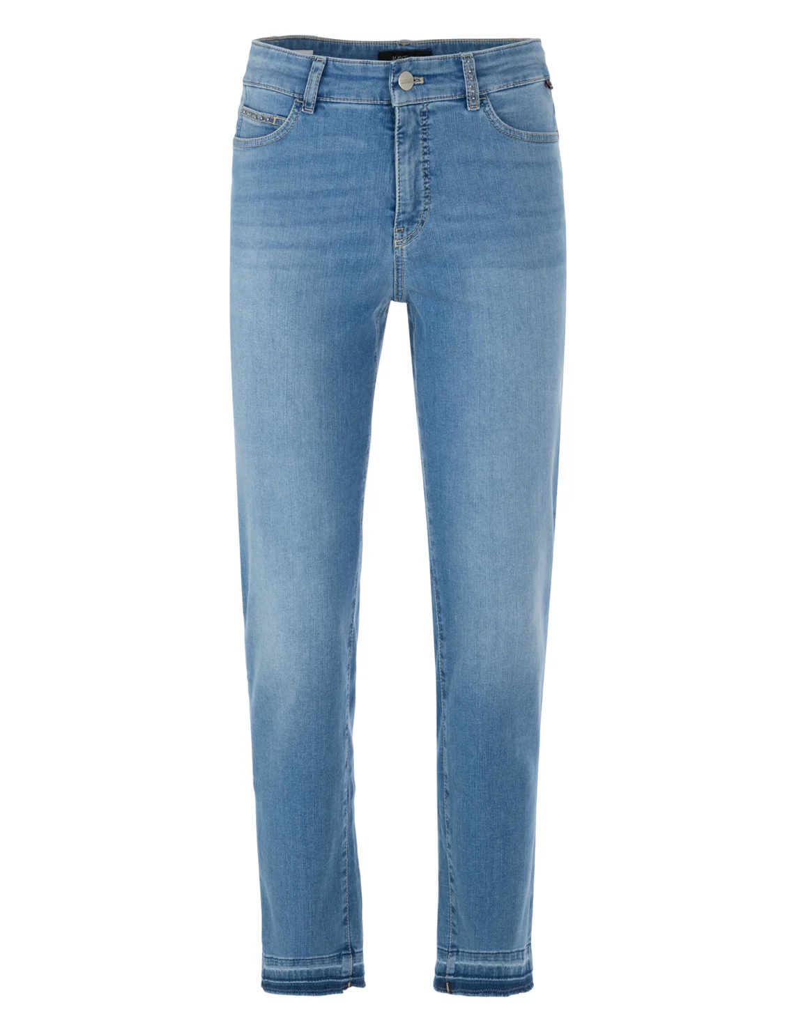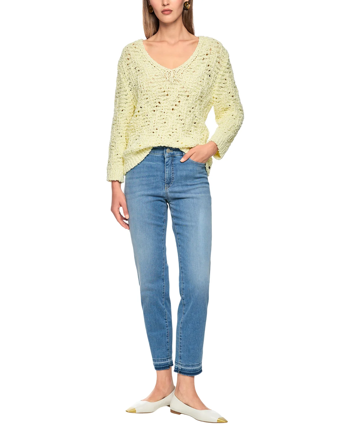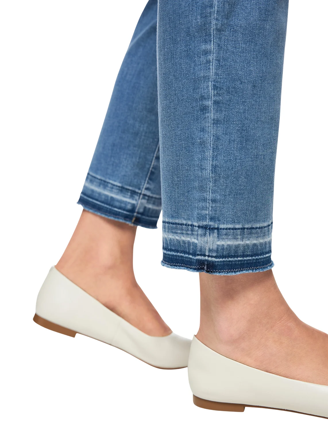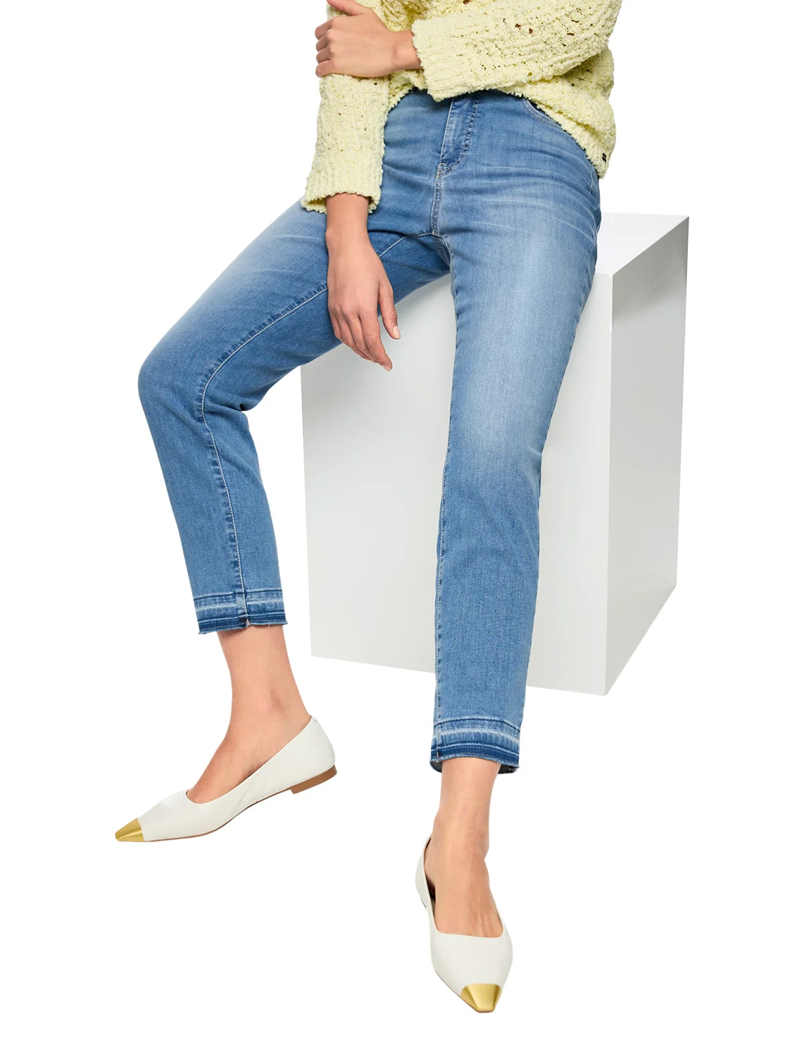 Джинсы изготовлены из хлопка, полиэстера и эластана. Модель выполнена в зауженном крое. Имеет петли для ремня, скрытую застежку-молнию с пуговицей, бахрому на подоле штанин, два боковых прорезных и два задних накладных кармана.