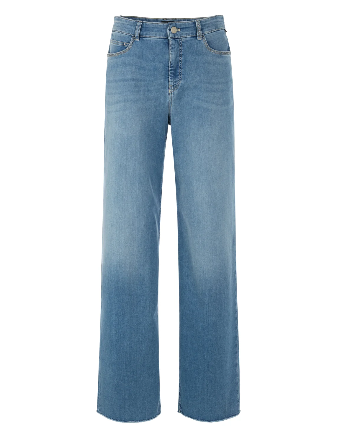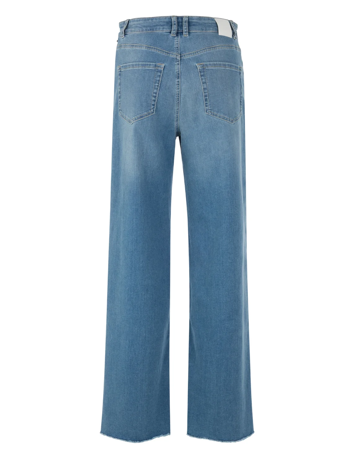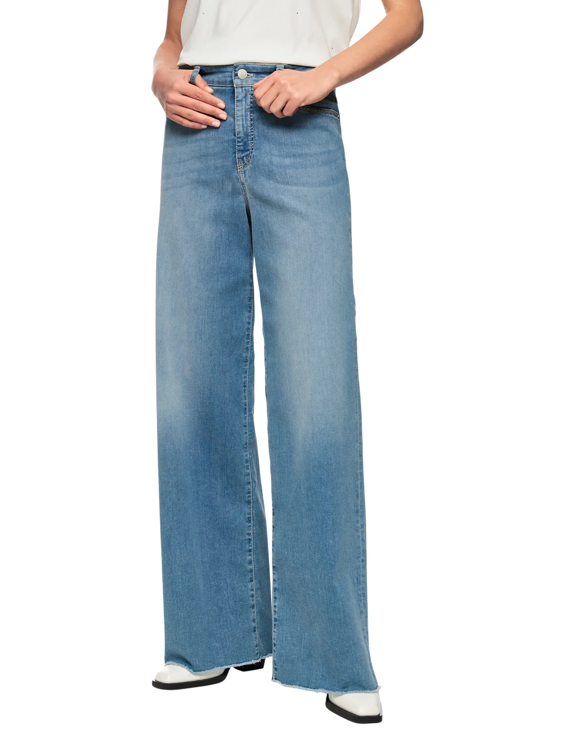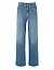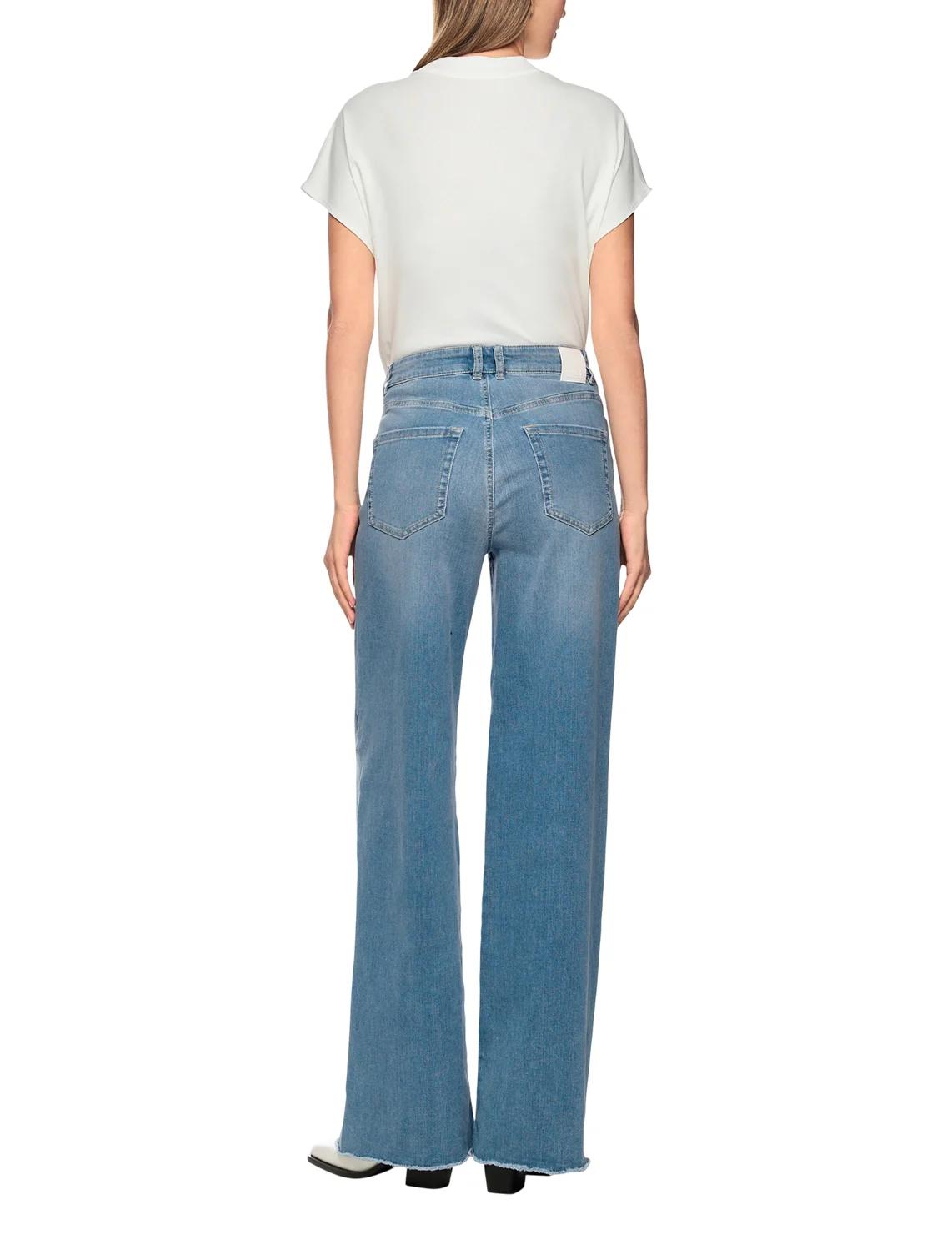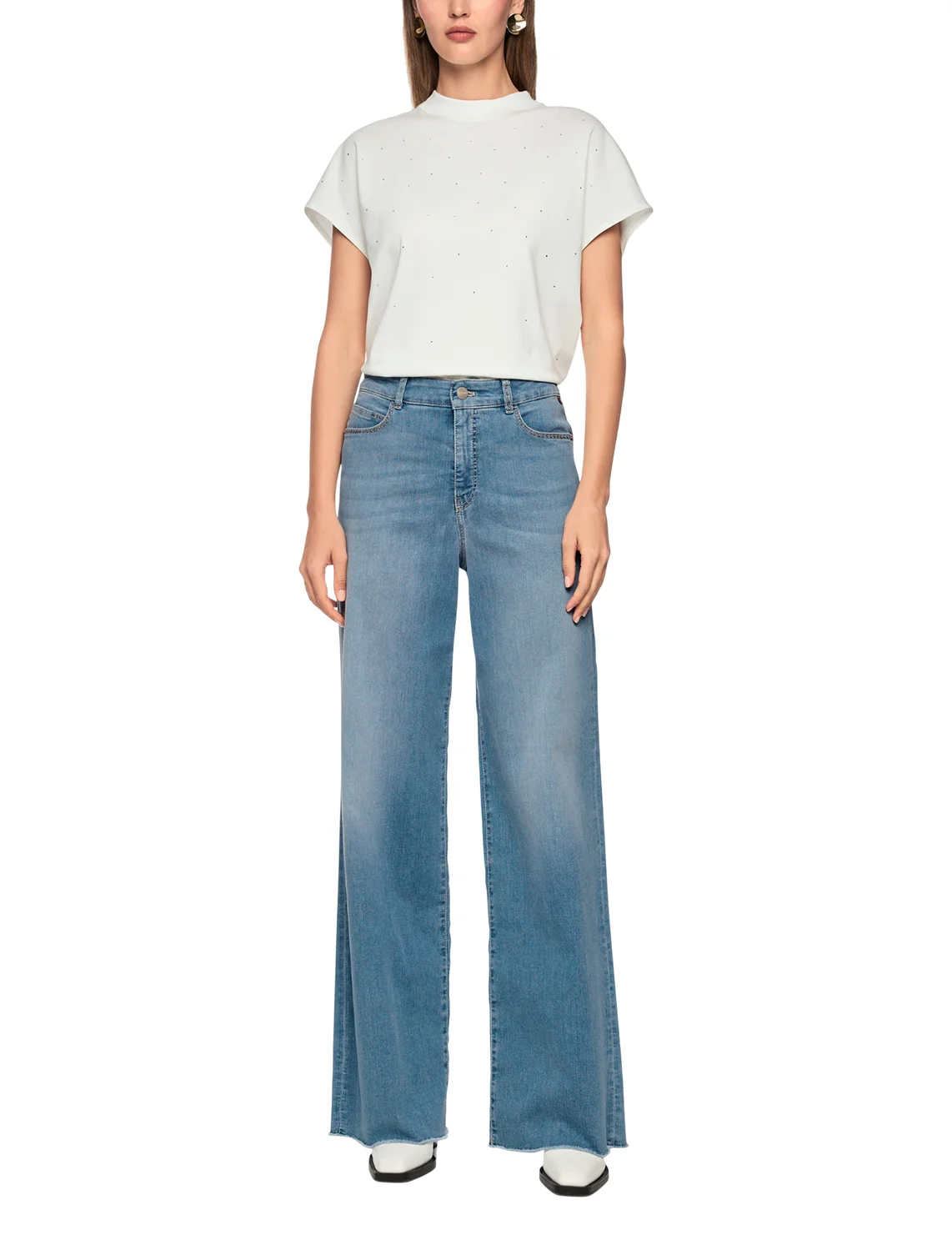 Джинсы изготовлены из хлопка, полиэстера и эластана. Модель выполнена в свободном крое. Имеет петли для ремня, скрытую застежку-молнию с пуговицей, бахрому на подоле штанин, два боковых прорезных и два задних накладных кармана. Декорированы бусинами.