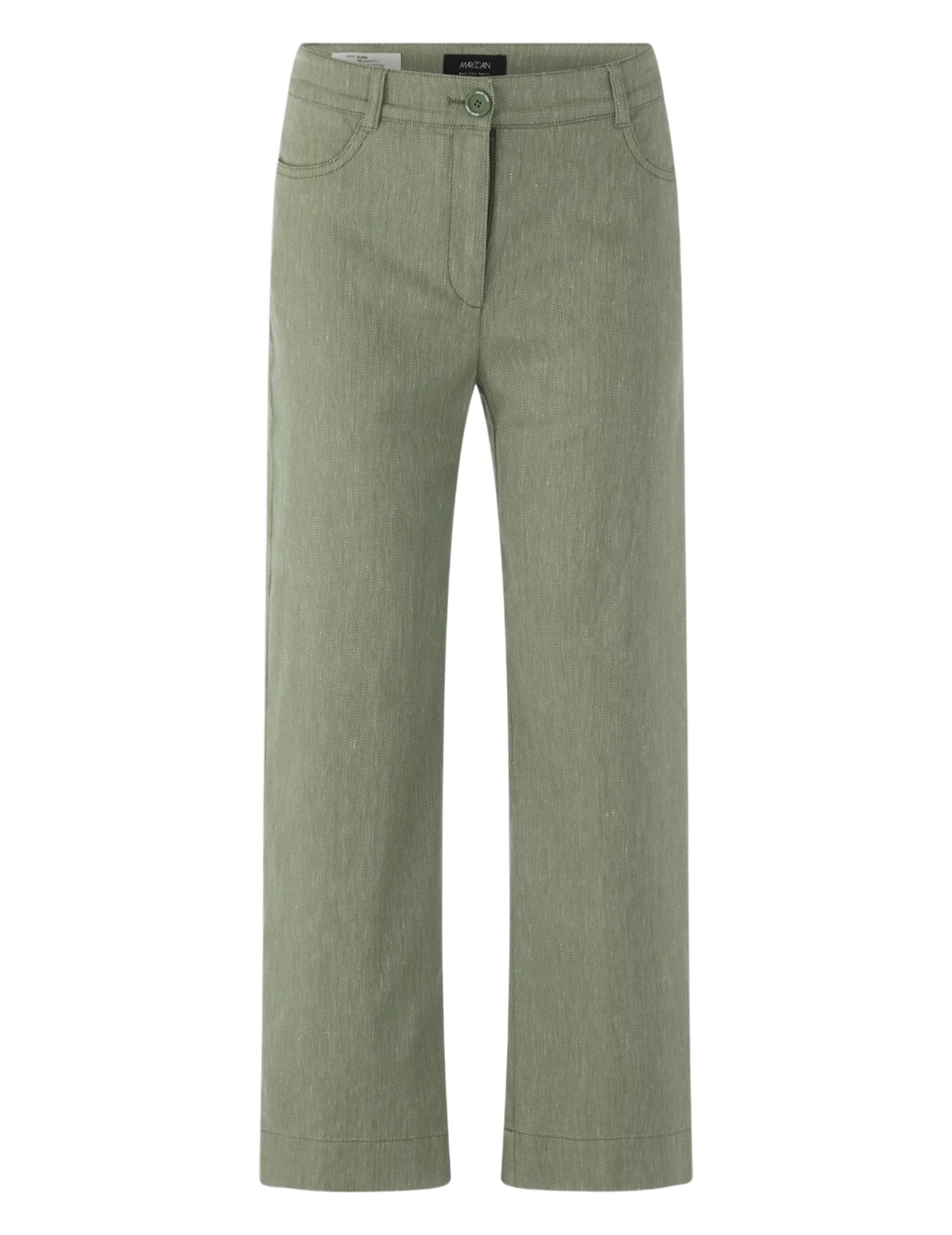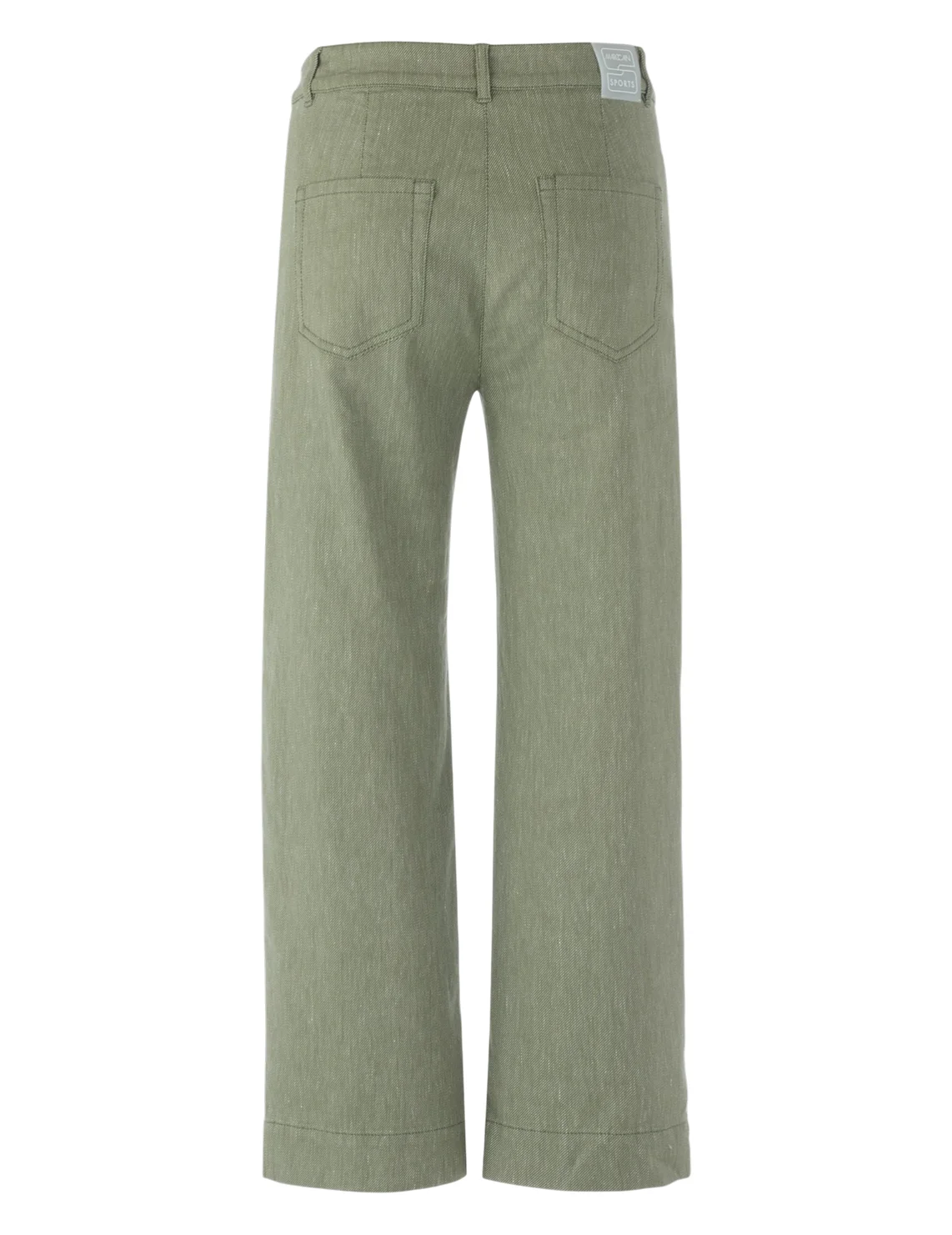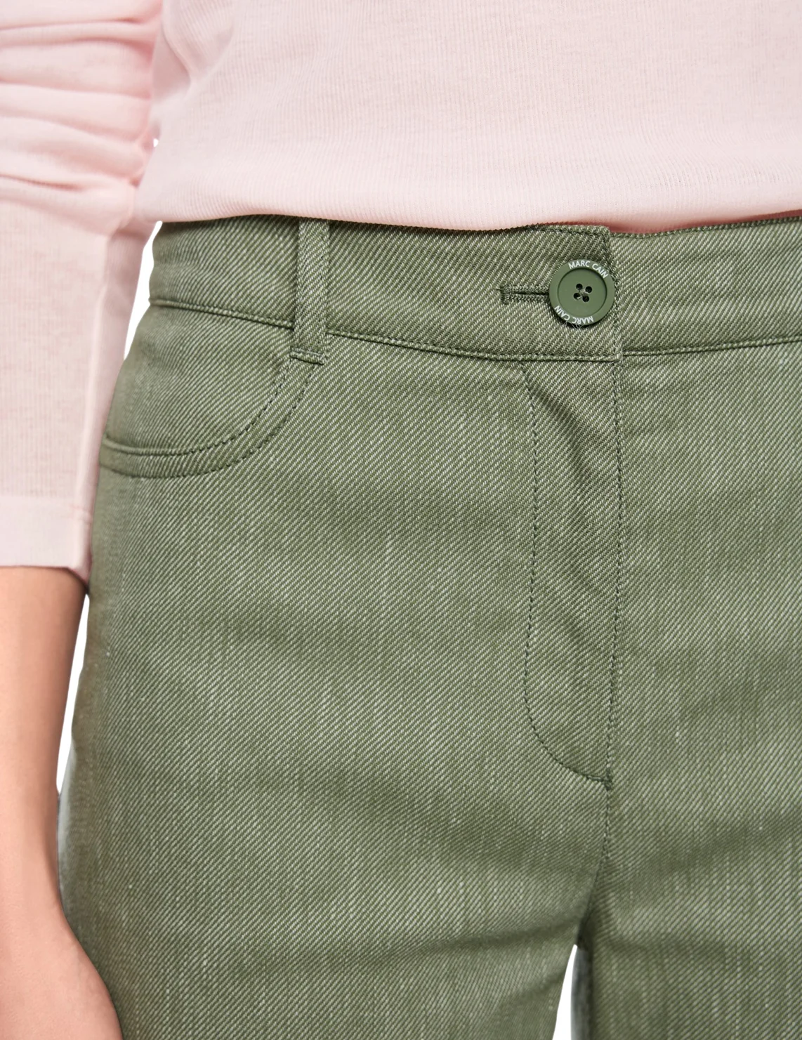 Джинсы изготовлены из хлопка, льна и эластана. Модель выполнена в свободном крое. Имеет петли для ремня, скрытую застежку-молнию с пуговицей, два боковых прорезных и два задних накладных кармана.