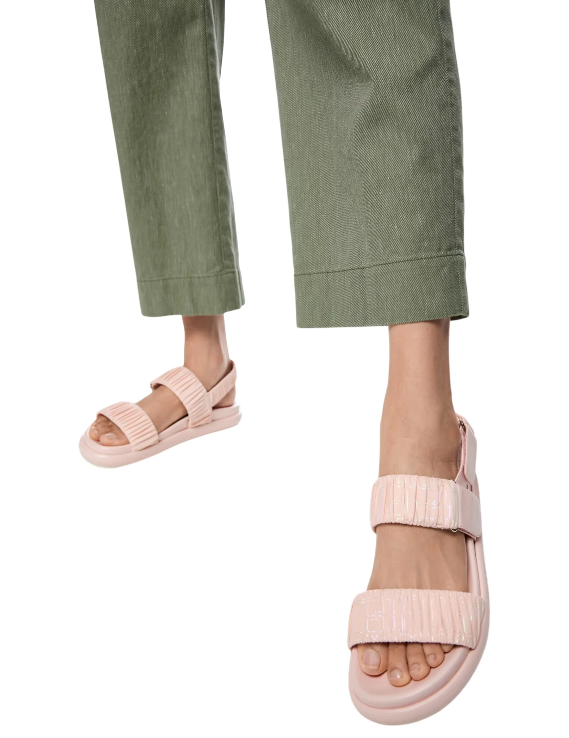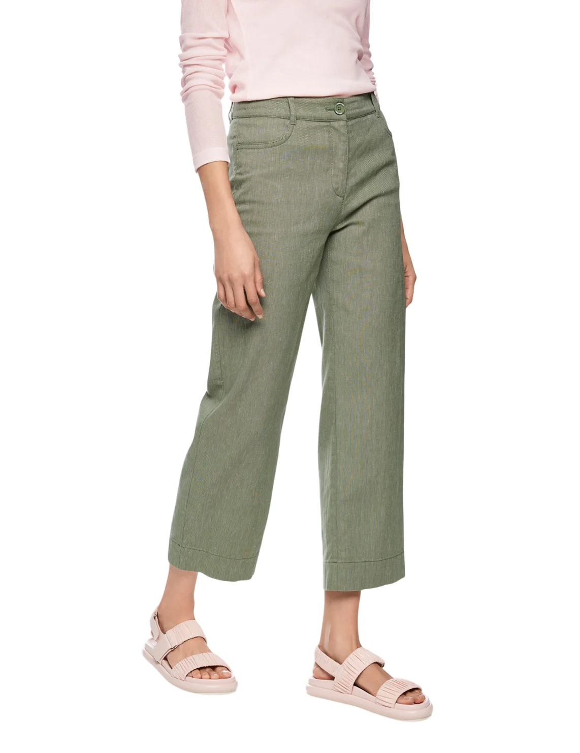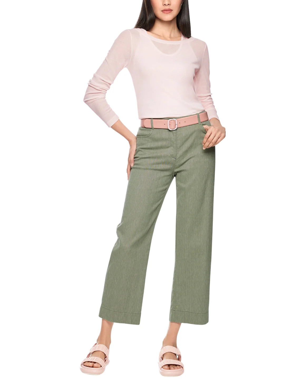 Джинсы изготовлены из хлопка, льна и эластана. Модель выполнена в свободном крое. Имеет петли для ремня, скрытую застежку-молнию с пуговицей, два боковых прорезных и два задних накладных кармана.