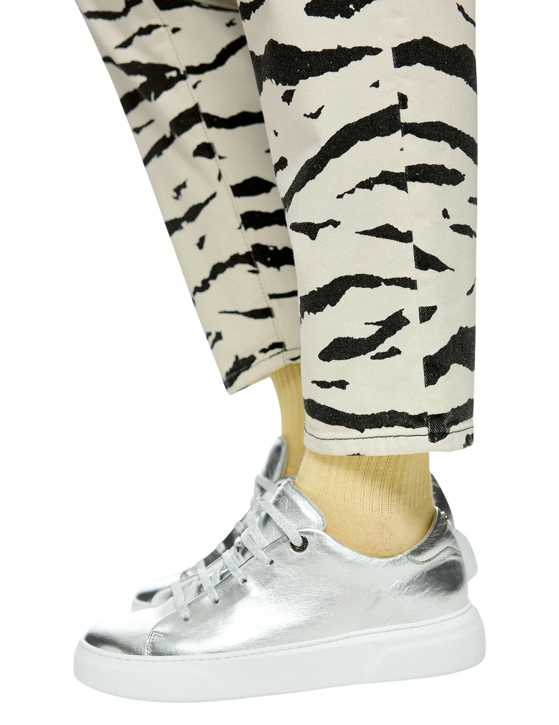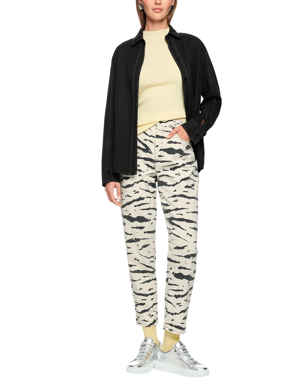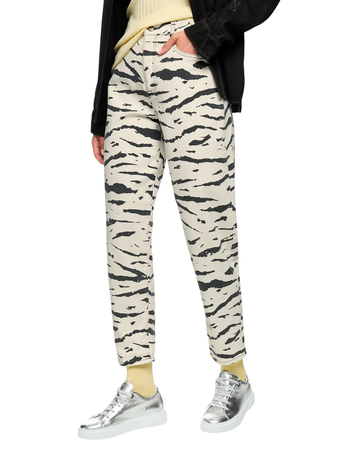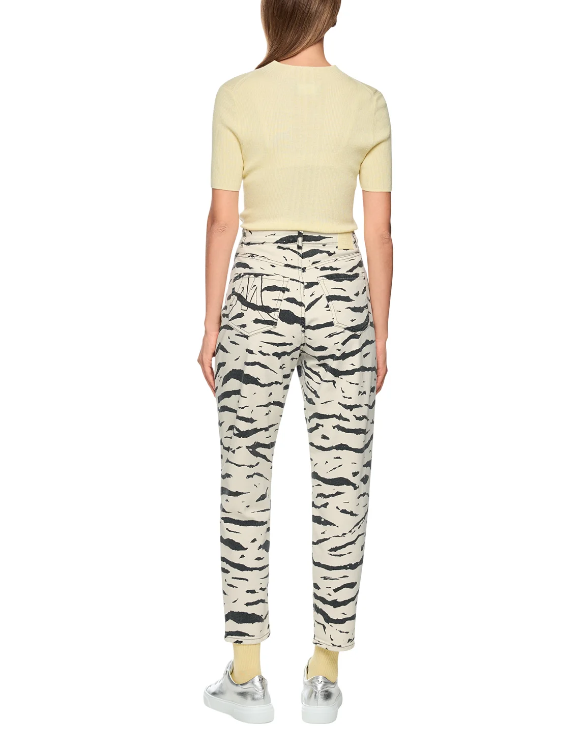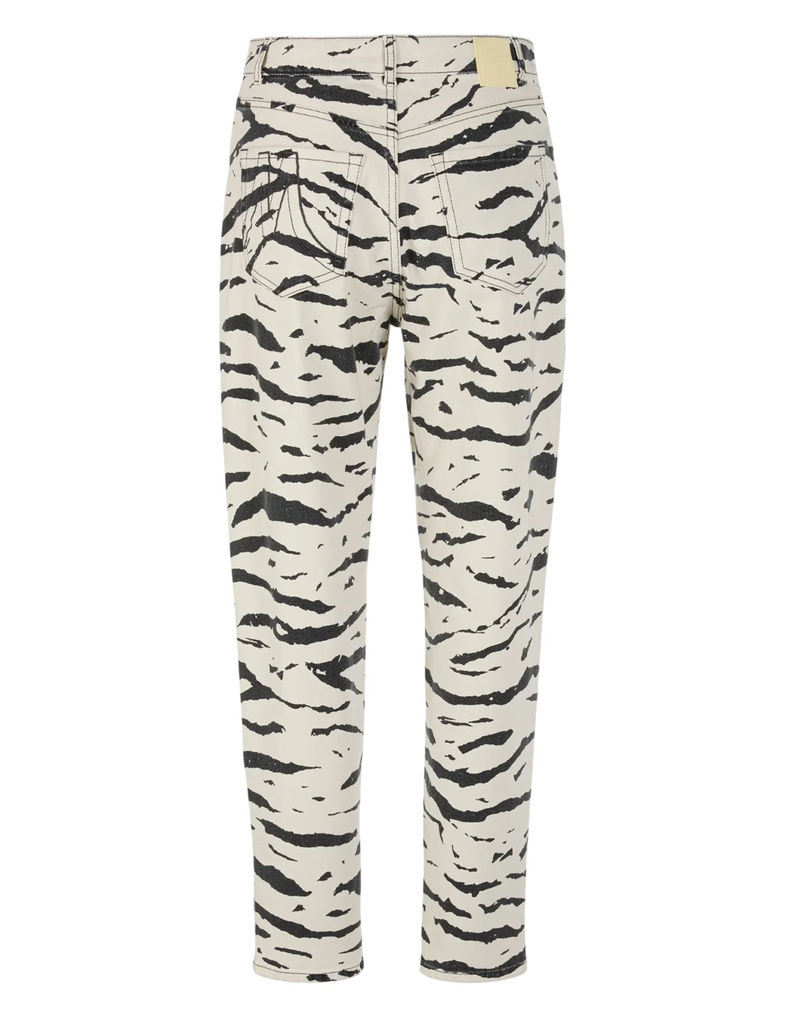 Джинсы изготовлены из хлопка и эластана. Модель выполнена в прямом крое. Имеет петли для ремня, скрытую застежку-молнию с пуговицей, а также пару передних прорезных и пару задних накладных карманов. Декорированы анималистичным принтом.