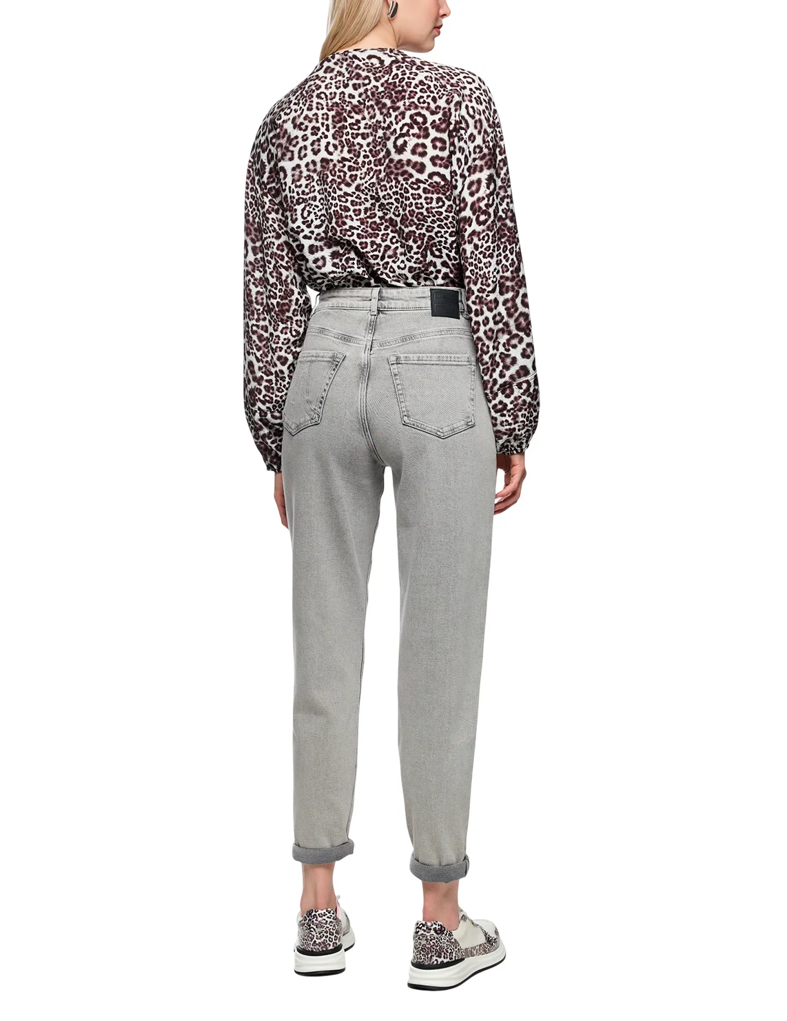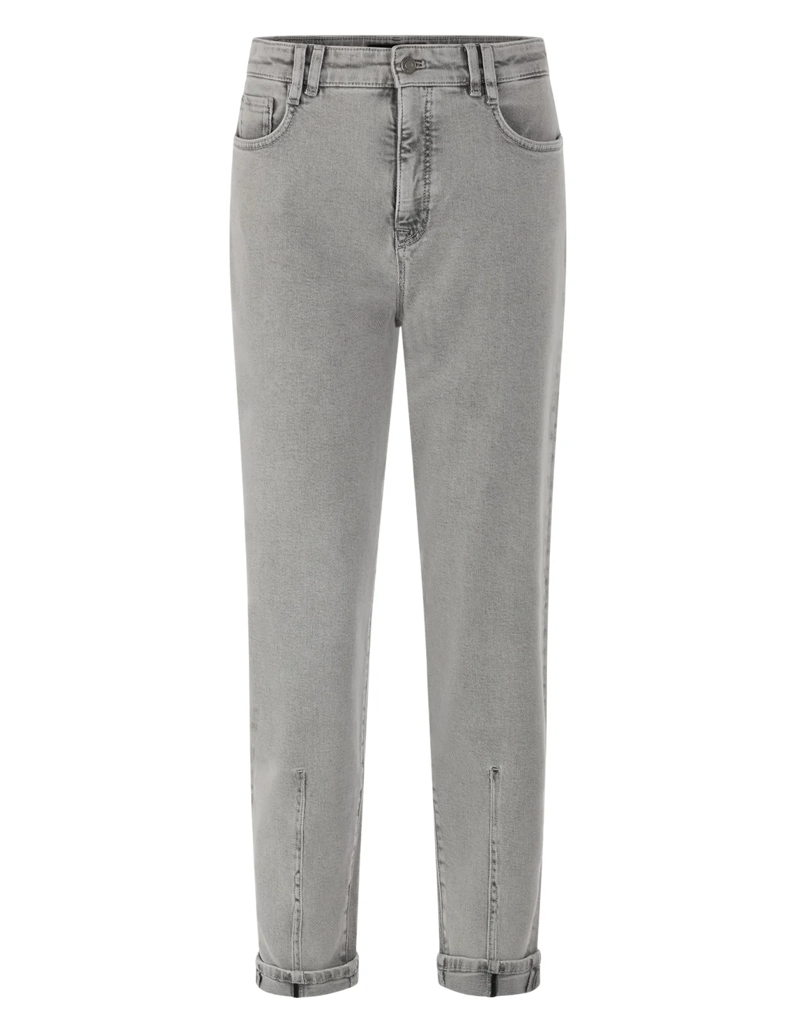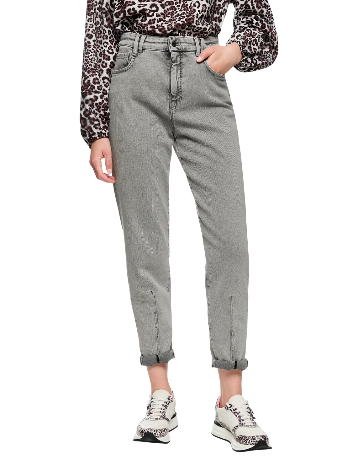 Джинсы изготовлены из хлопка и эластана. Модель выполнена в зауженном крое. Имеет петли для ремня, скрытую застежку-молнию с пуговицей, отвороты на подоле штанин, два боковых прорезных и два задних накладных кармана.