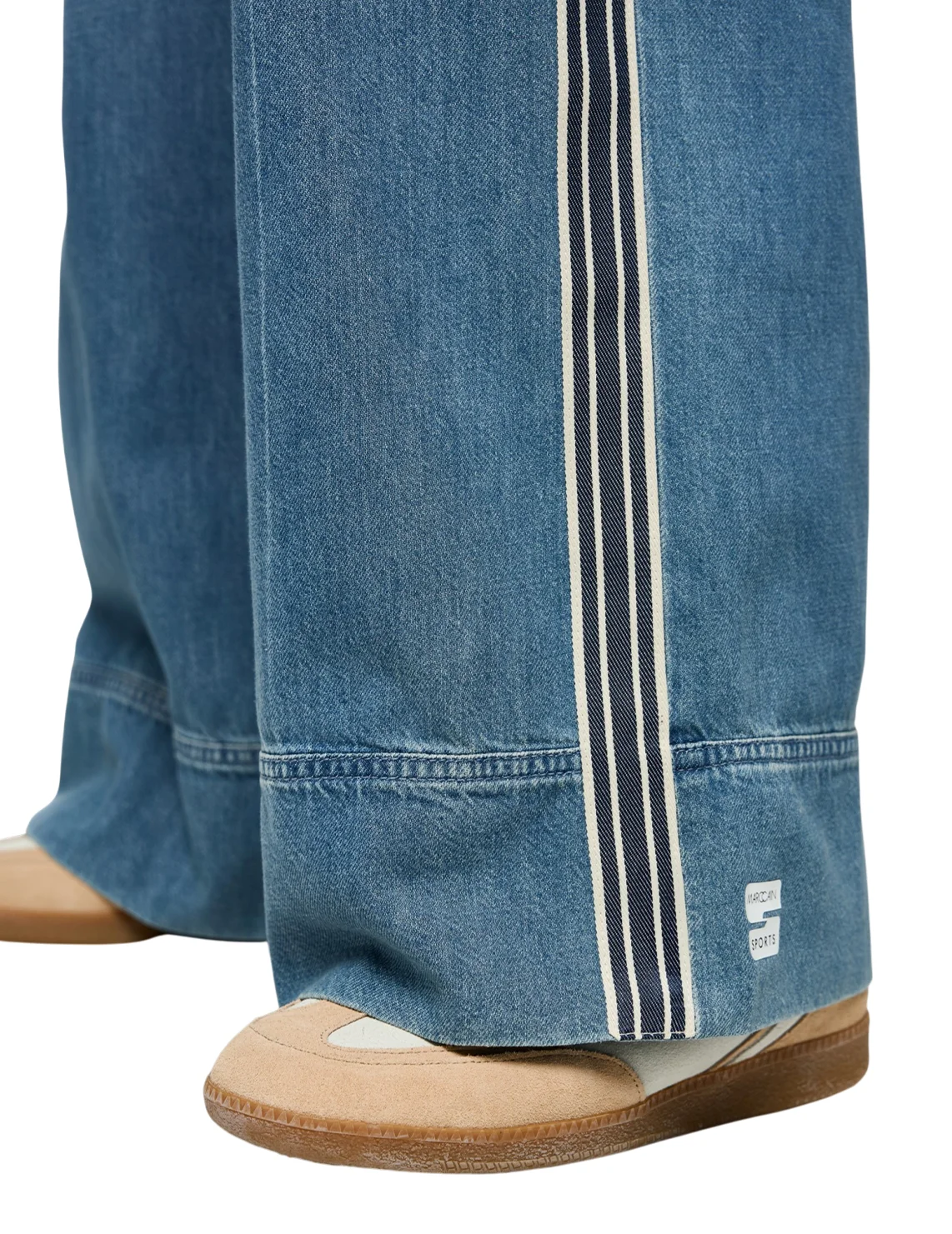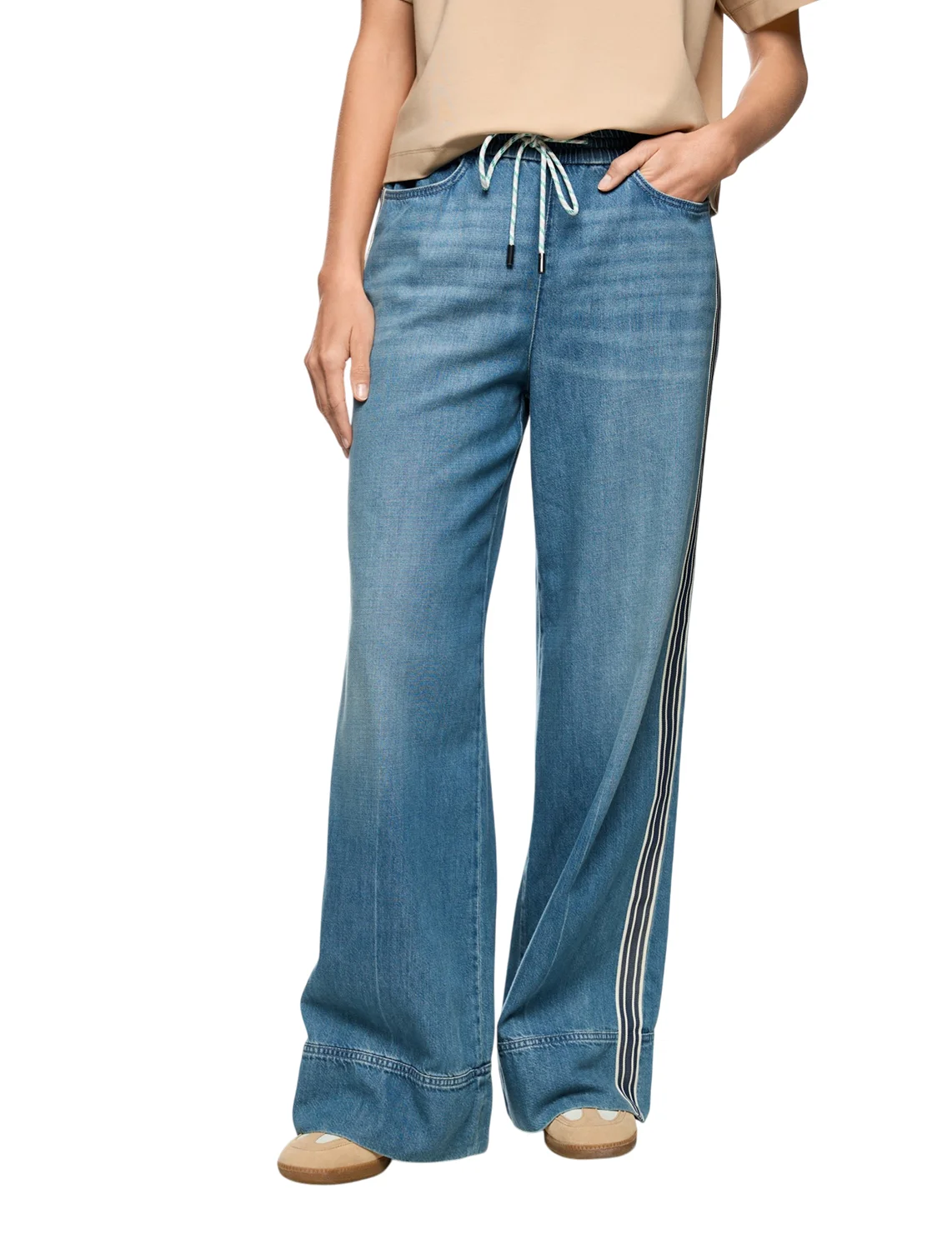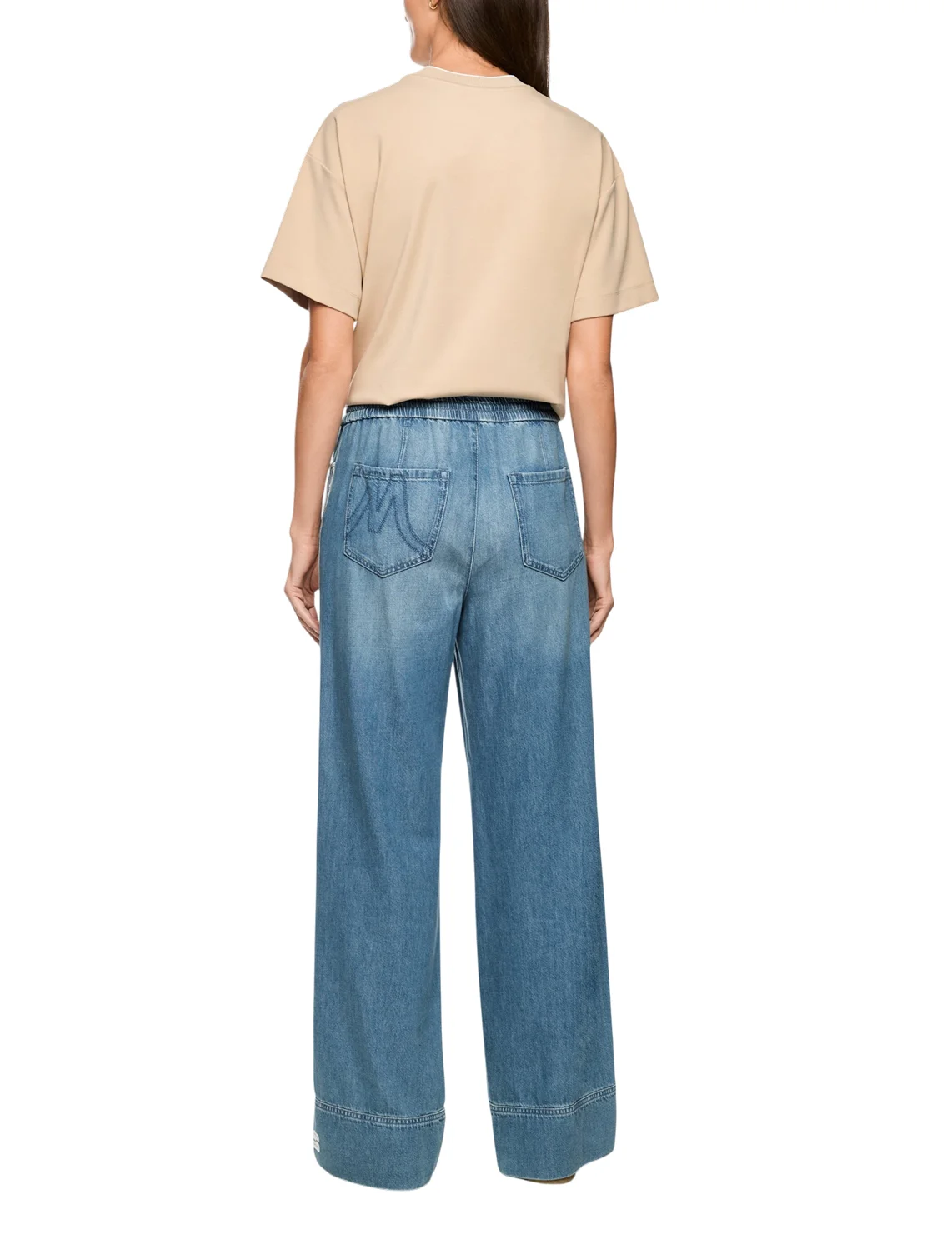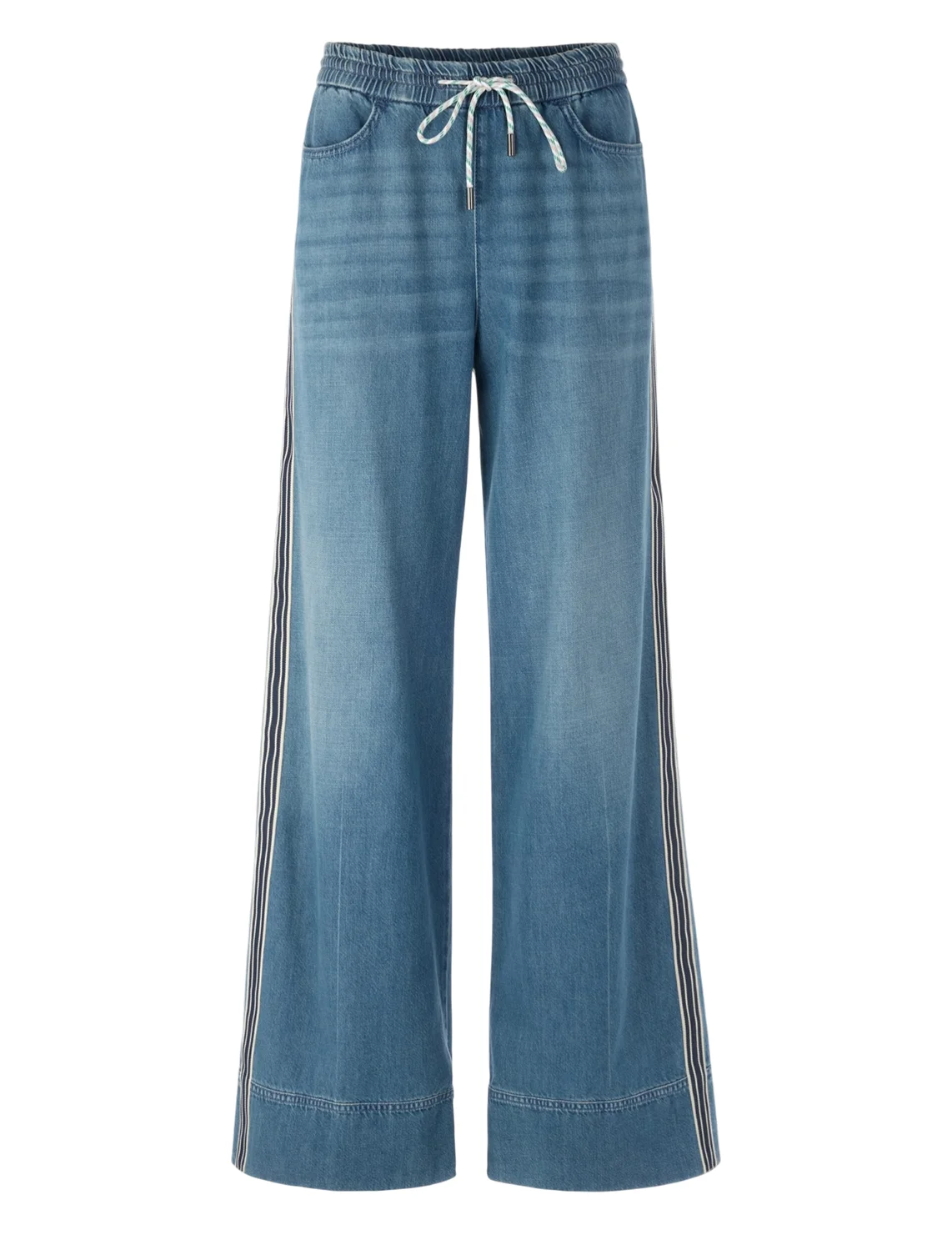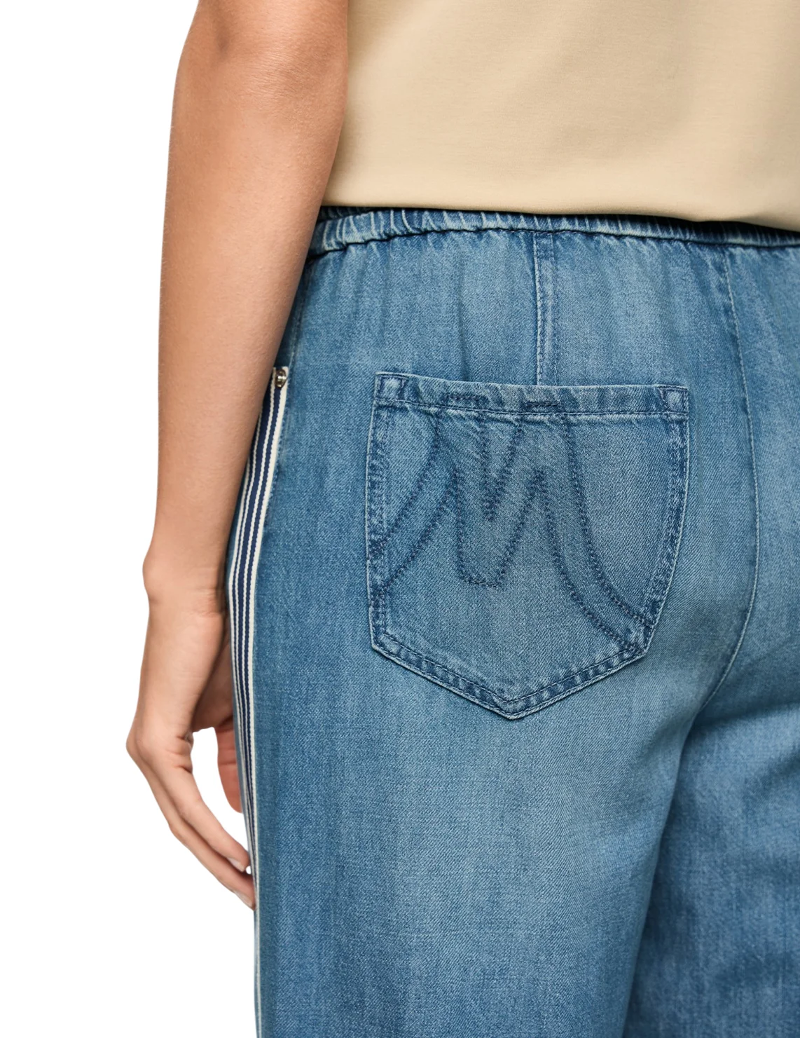 Джинсы изготовлены из хлопка и лиоцелла. Модель выполнена в свободном крое. Имеет эластичный пояс с кулиской, лампасы, а также пару передних прорезных и пару задних накладных карманов.