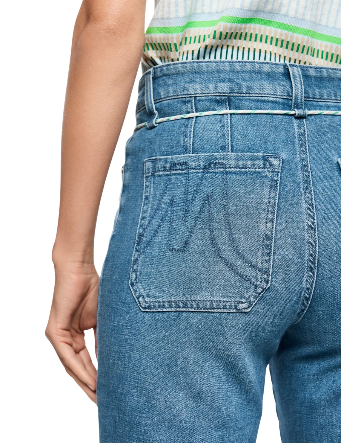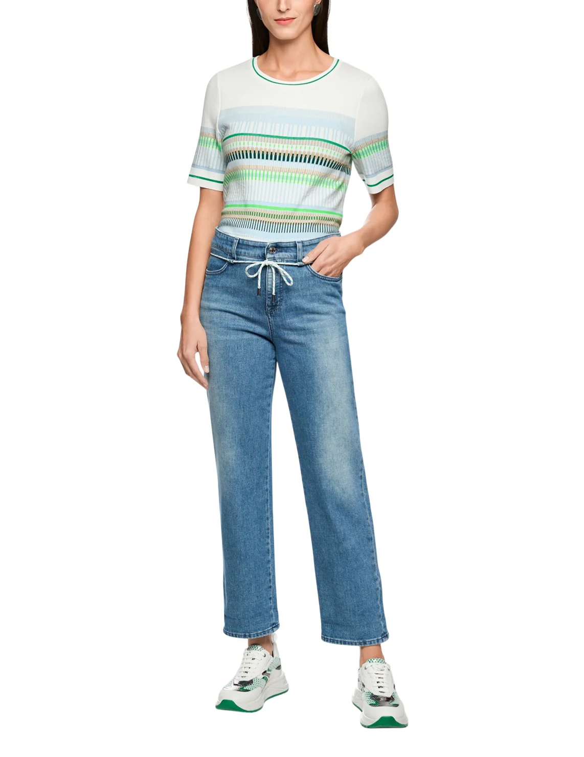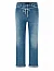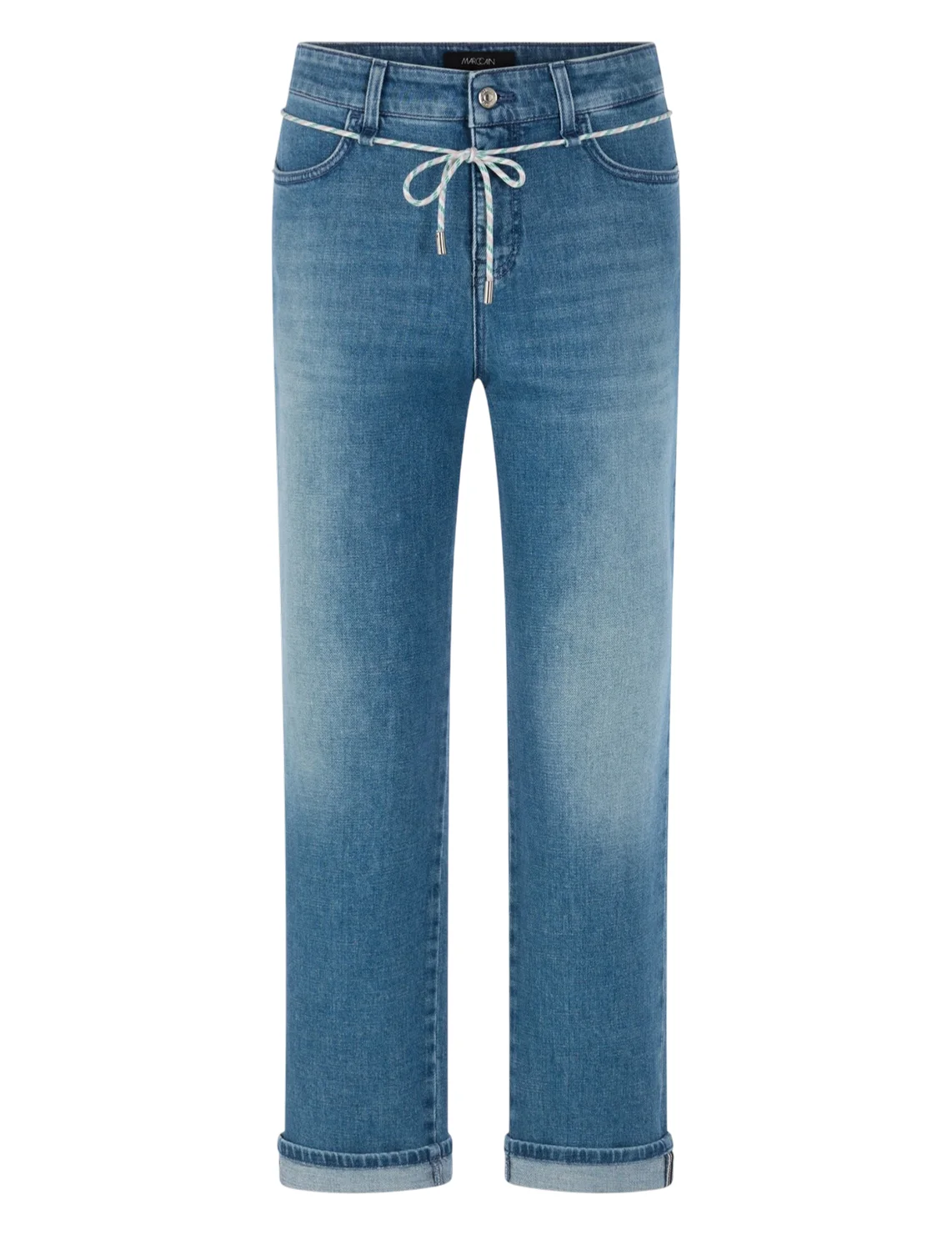 Джинсы изготовлены из хлопка и эластана. Модель выполнена в прямом крое. Имеет петли для ремня, скрытую застежку-молнию с пуговицей, пояс-шнур, отвороты, а также пару передних прорезных и пару задних накладных карманов.
