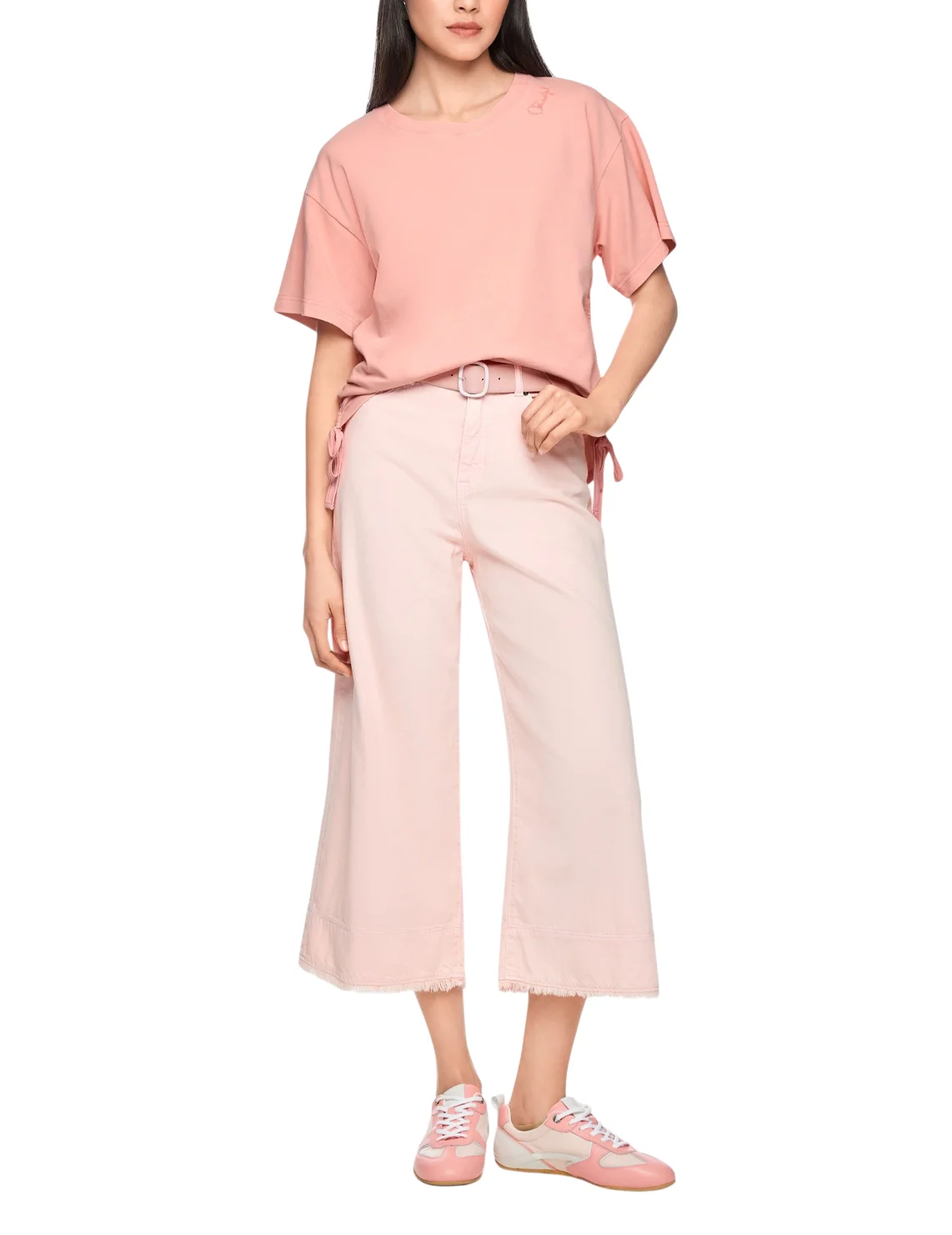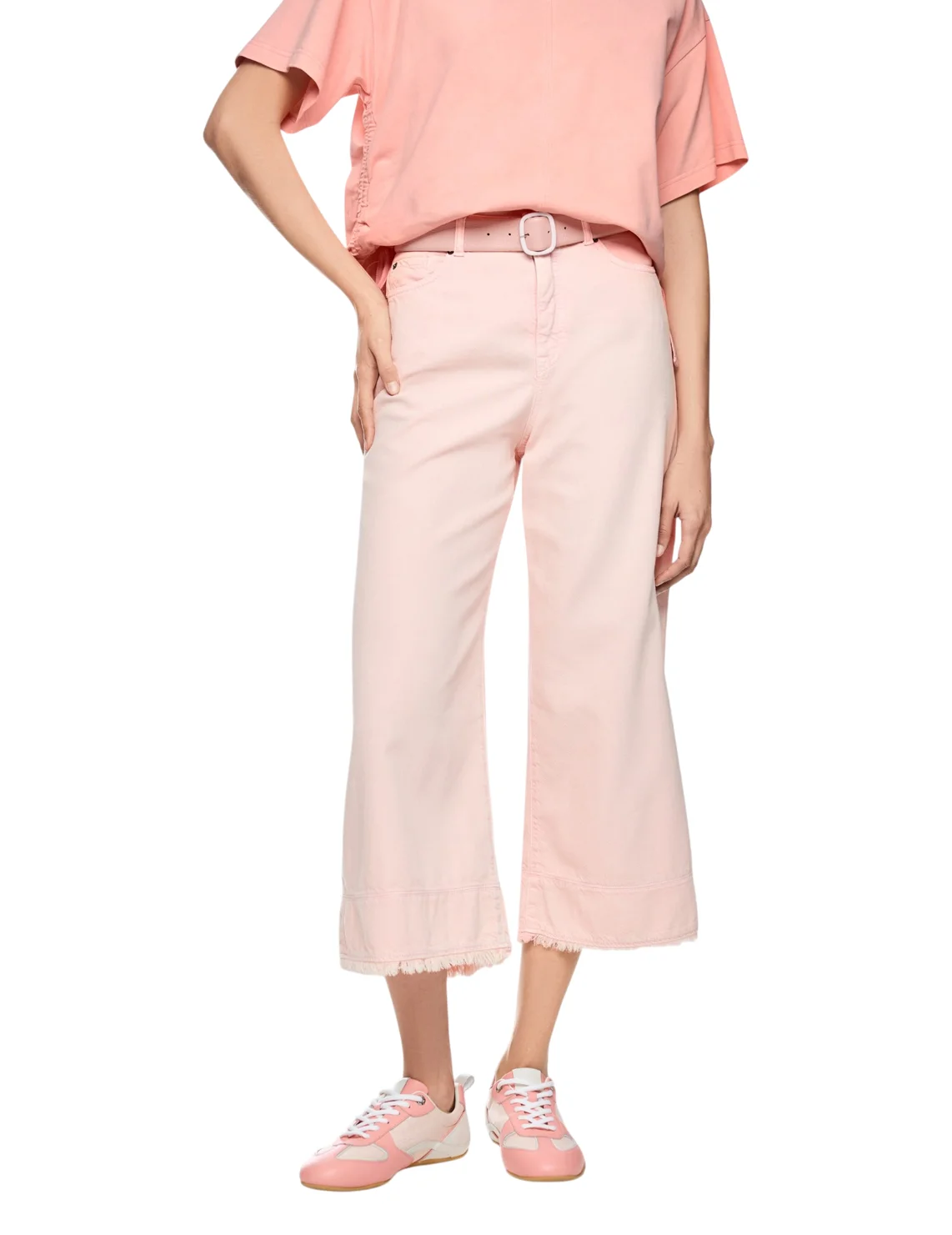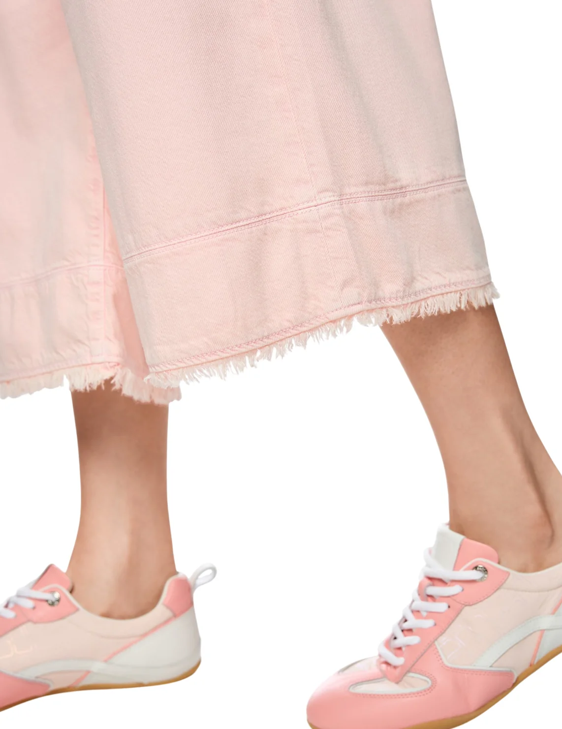 Джинсы изготовлены из хлопка и лиоцелла. Укороченная модель выполнена в свободном крое. Имеет передние карманы, застежку на пуговицу и скрытую молнию. Подол декорирован бахромой.