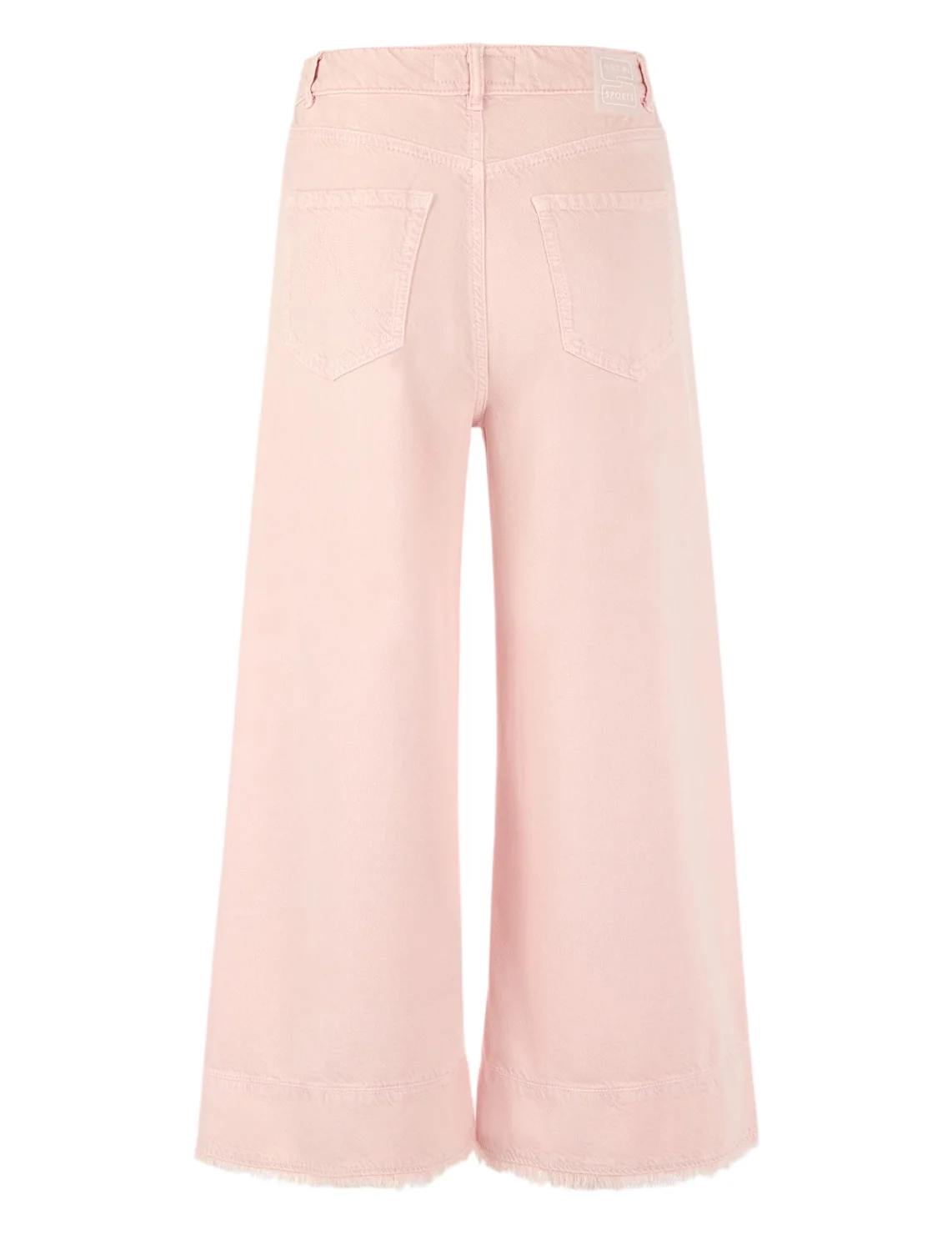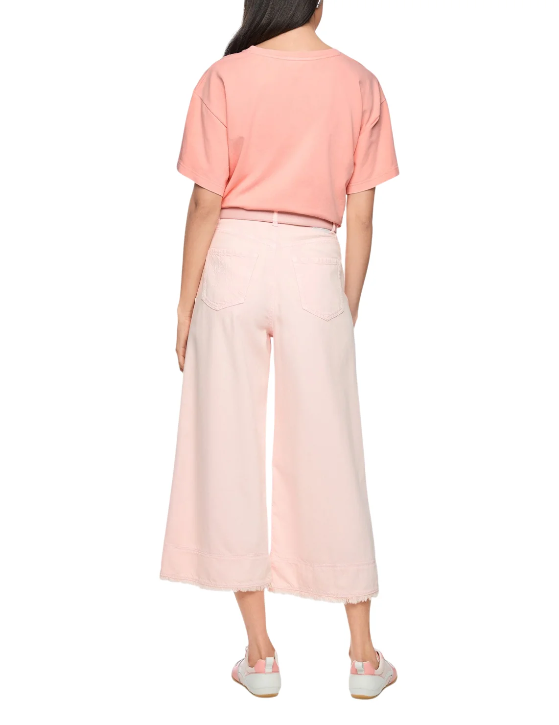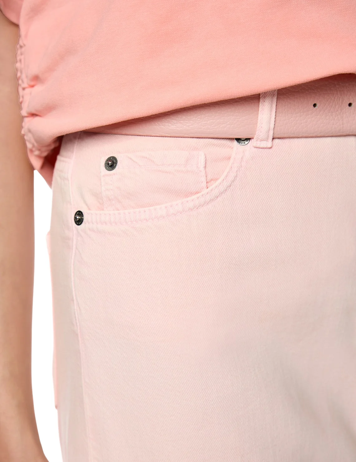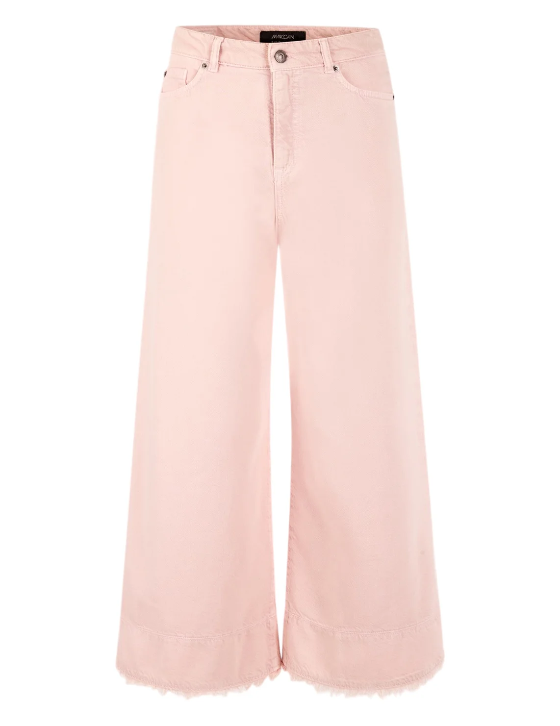 Джинсы изготовлены из хлопка и лиоцелла. Укороченная модель выполнена в свободном крое. Имеет передние карманы, застежку на пуговицу и скрытую молнию. Подол декорирован бахромой.