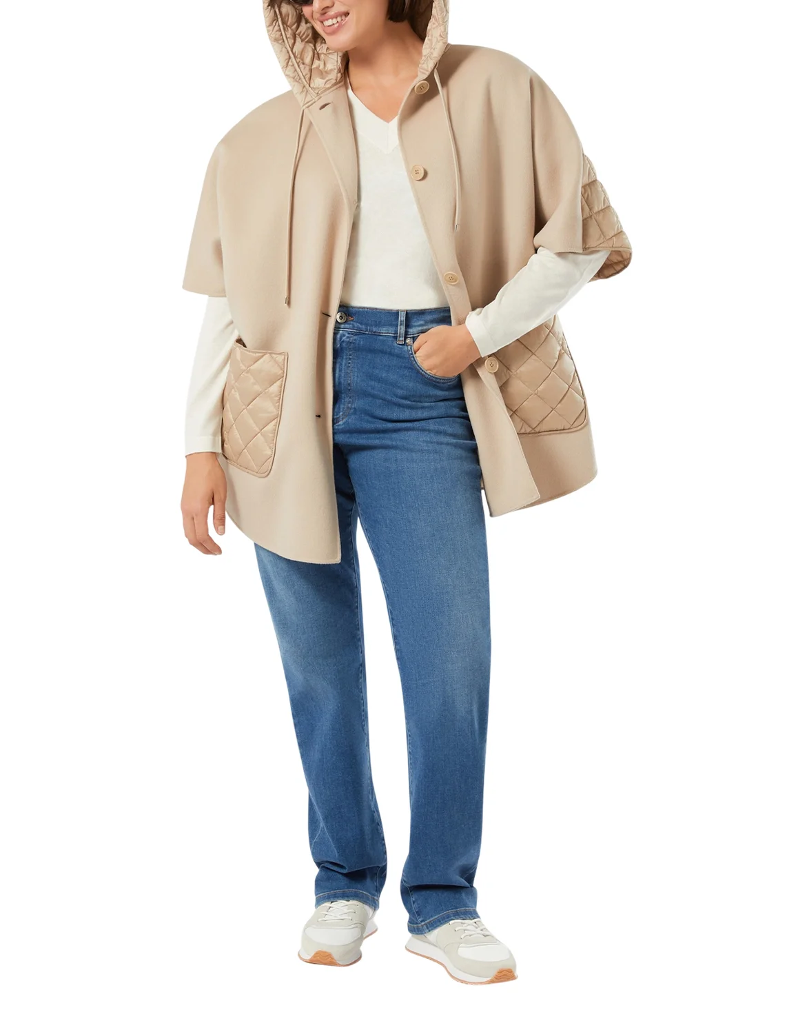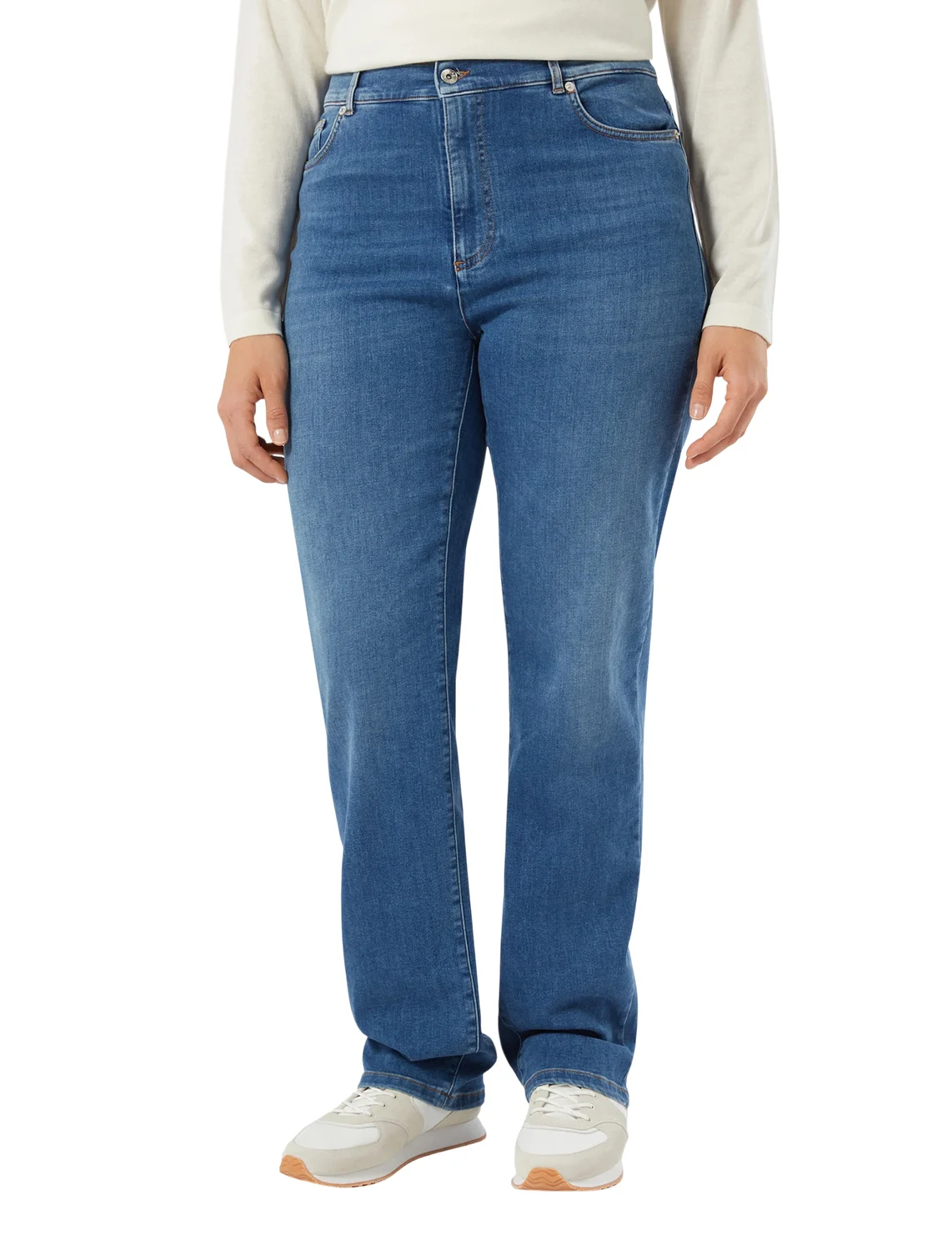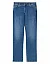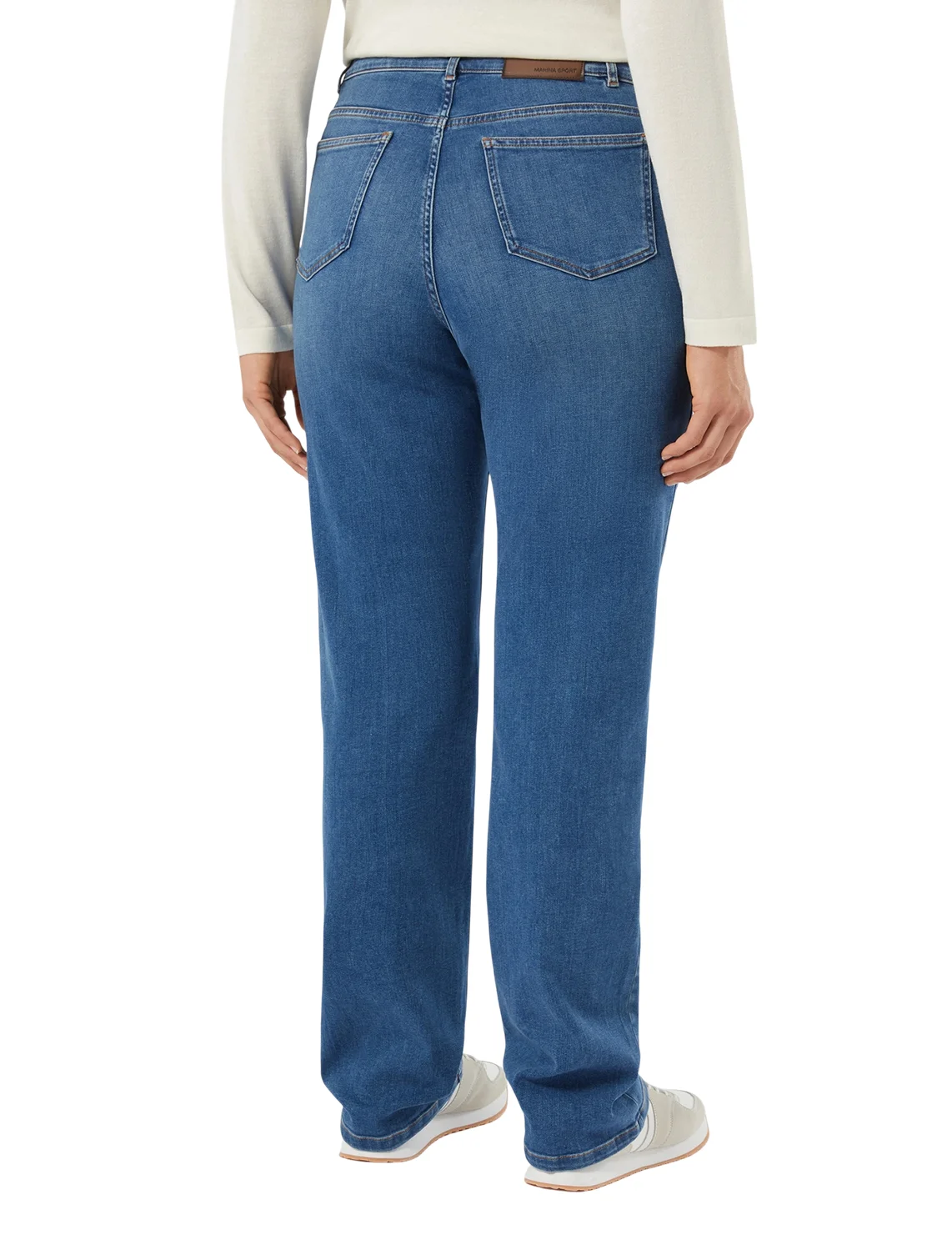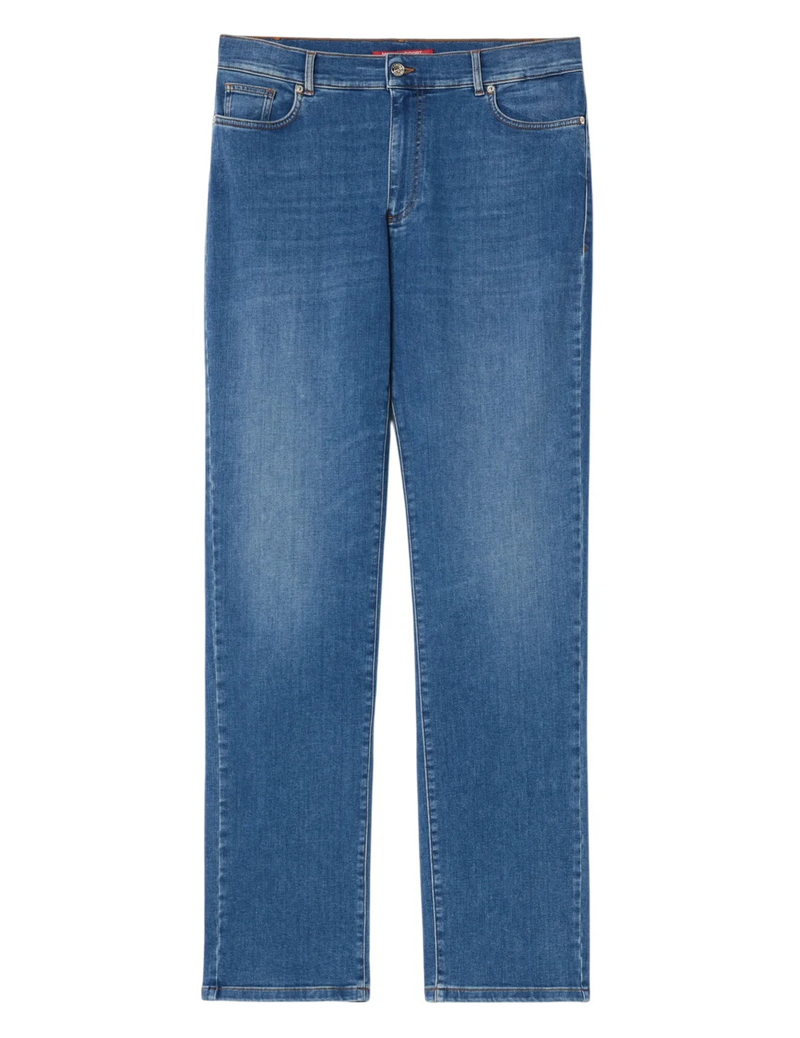 Джинсы изготовлены из хлопка, полиэстера и эластана. Модель выполнена в прямом крое. Имеет шлёвки для ремня, скрытую застежку-молнию с пуговицей, а также пару передних прорезных и пару задних накладных карманов.