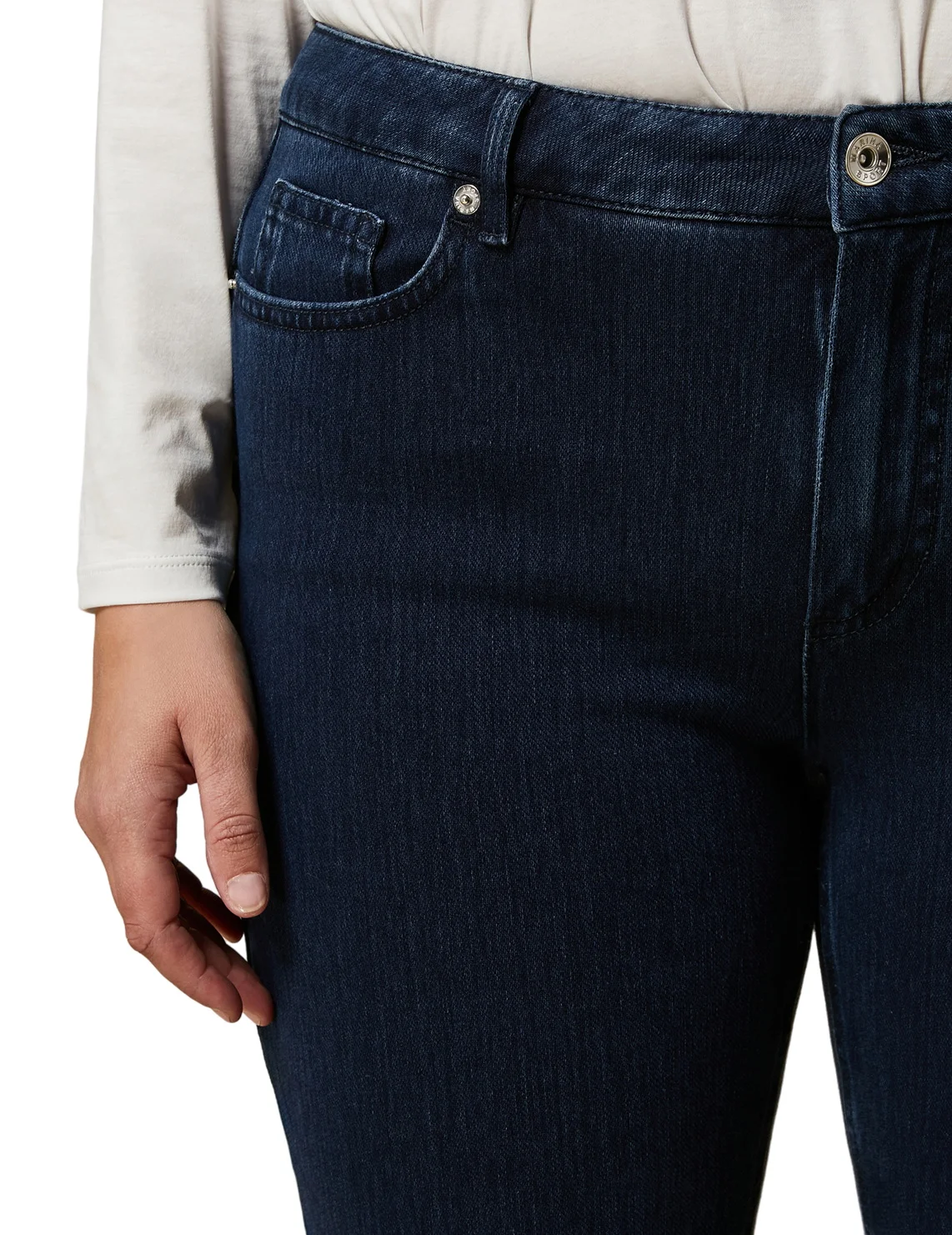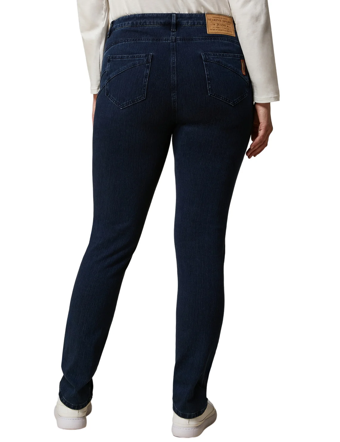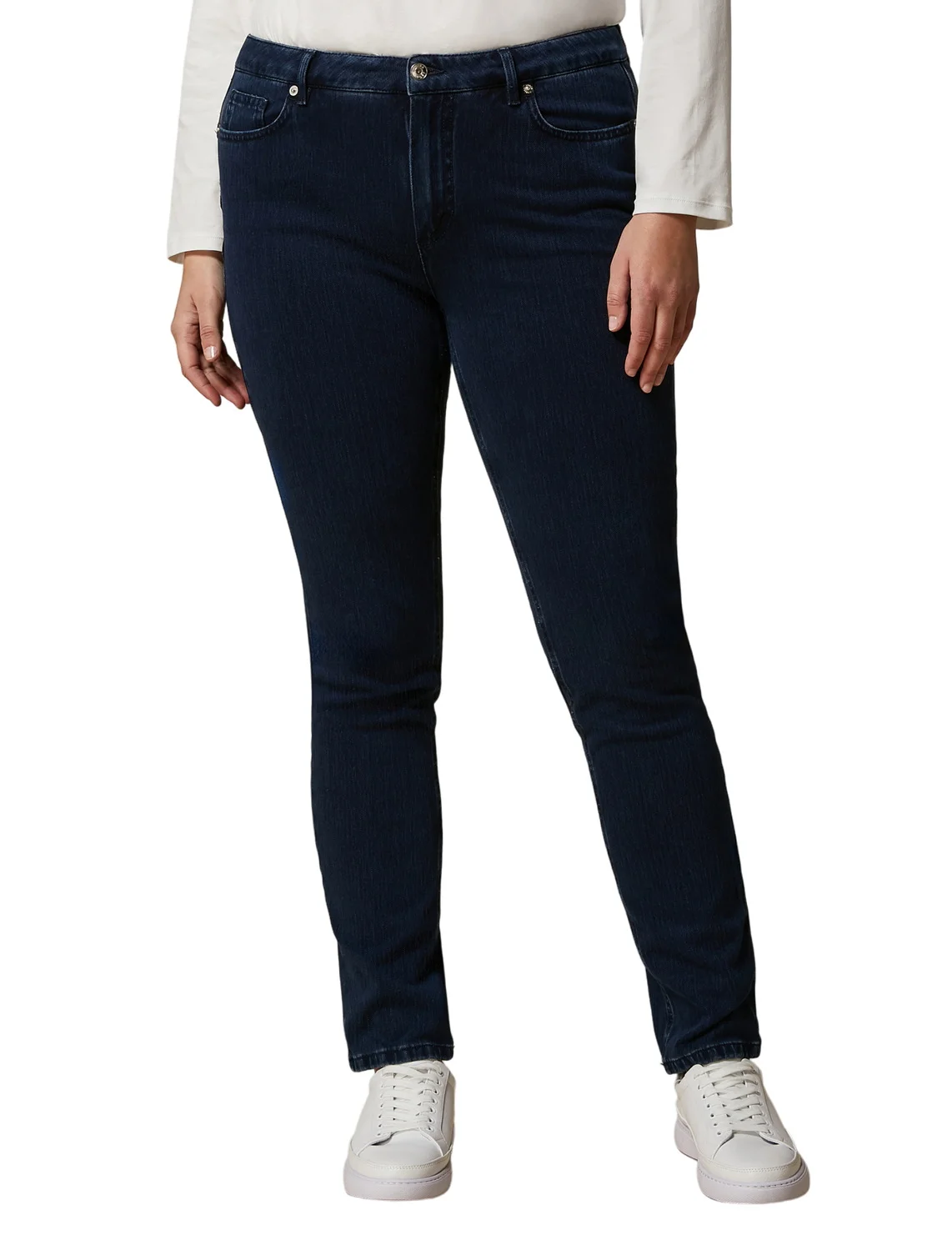 Джинсы Idaldo от бренда Marina Rinaldi изготовлены из хлопка и эластана. Модель выполнена в зауженном крое. Имеет шлёвки для ремня, скрытую застежку-молнию с пуговицей, а также пару передних и пару задних накладных карманов.