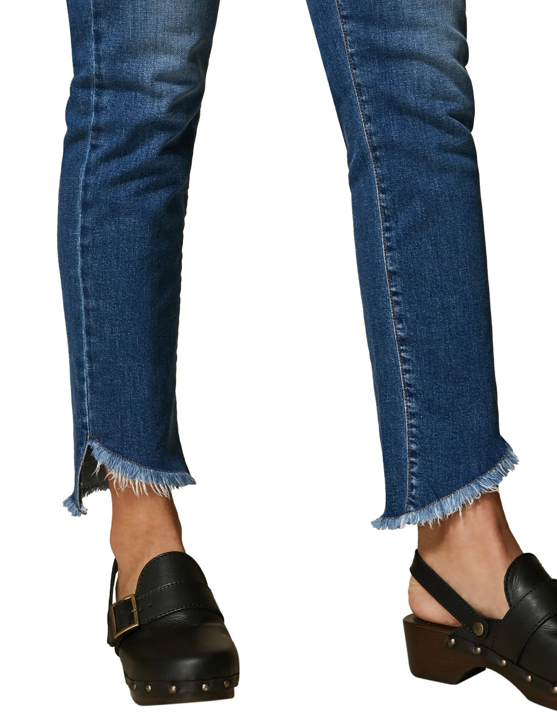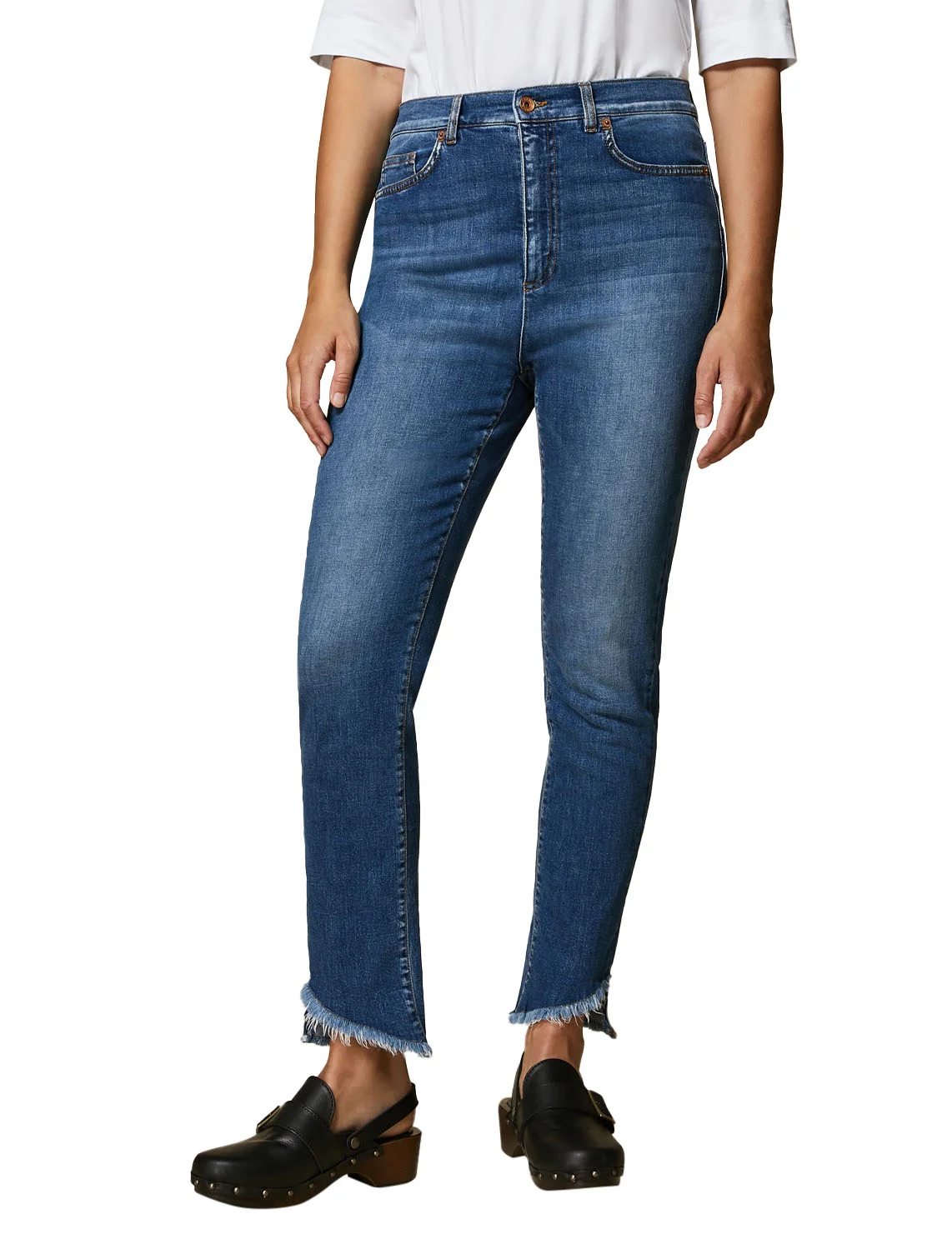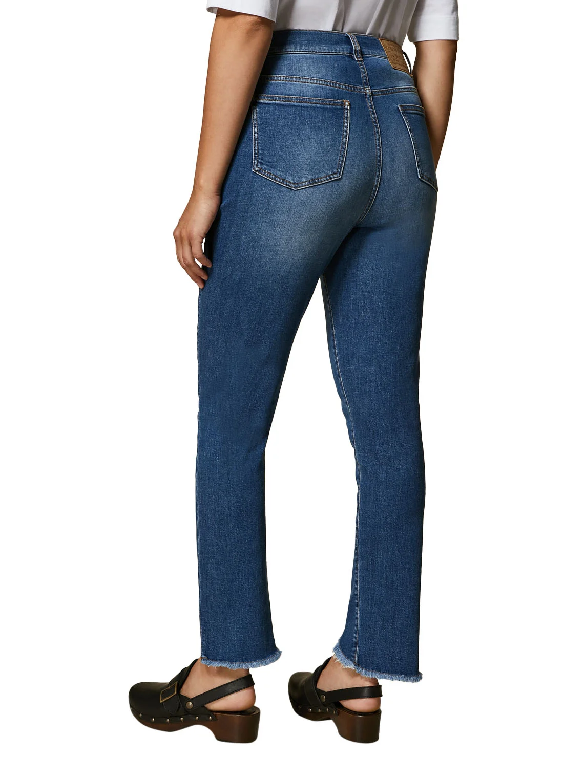 Синие джинсы Idaldo от бренда Marina Rinaldi изготовлены из хлопка и эластана. Модель выполнена в прямом крое. Имеет шлевки для ремня, скрытую застежку-молнию с пуговицей, прорезные боковые и накладные задние карманы. Дизайн дополняют асимметричные разрезы на подоле.