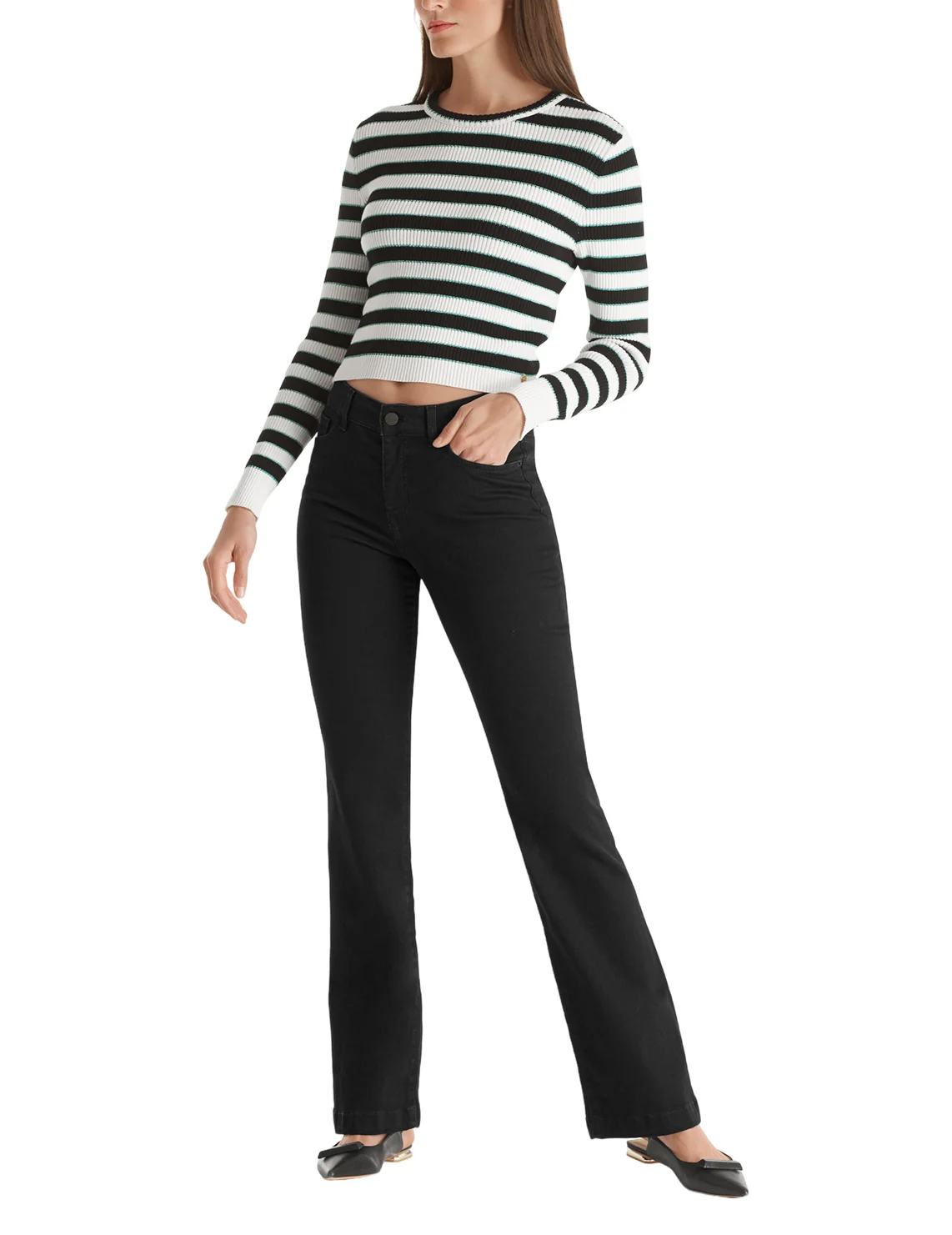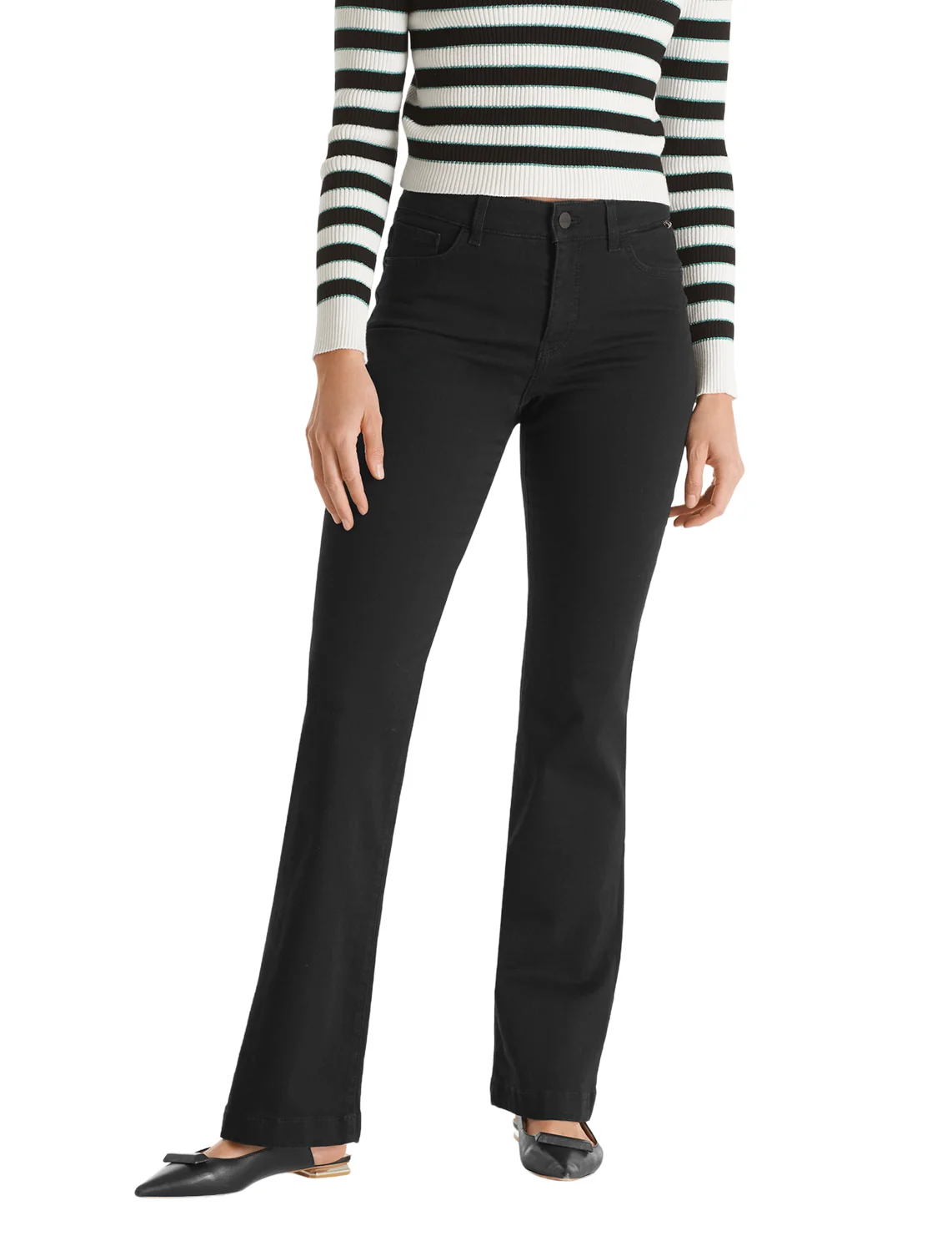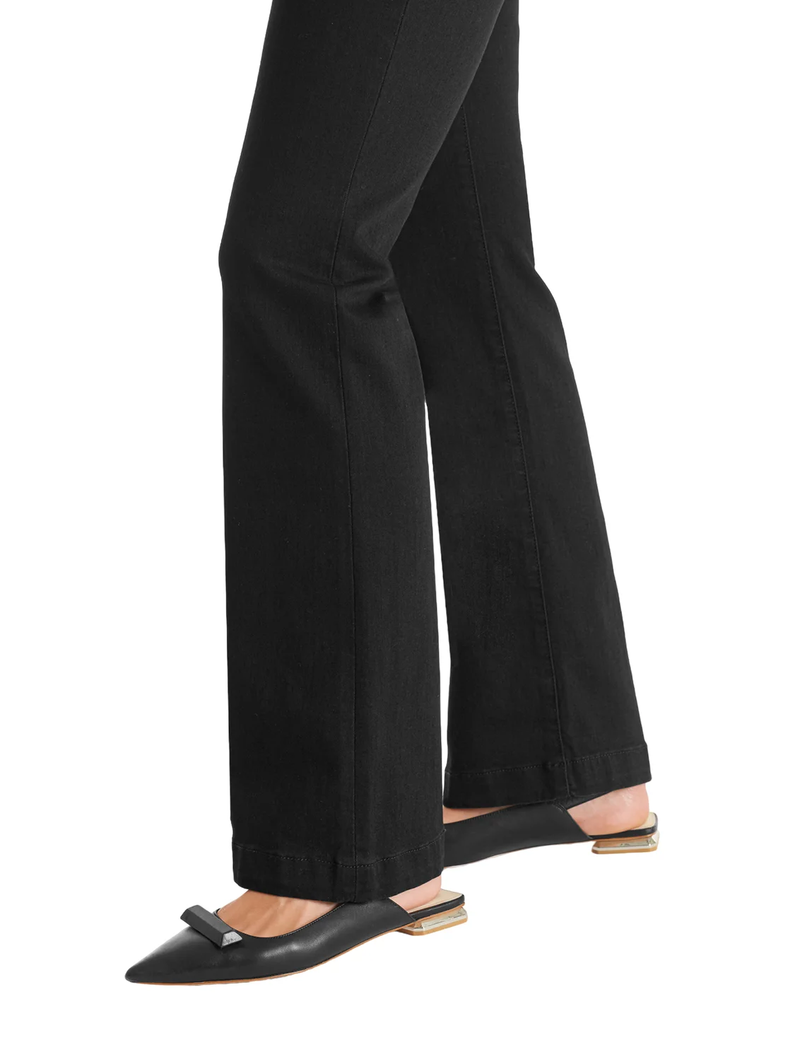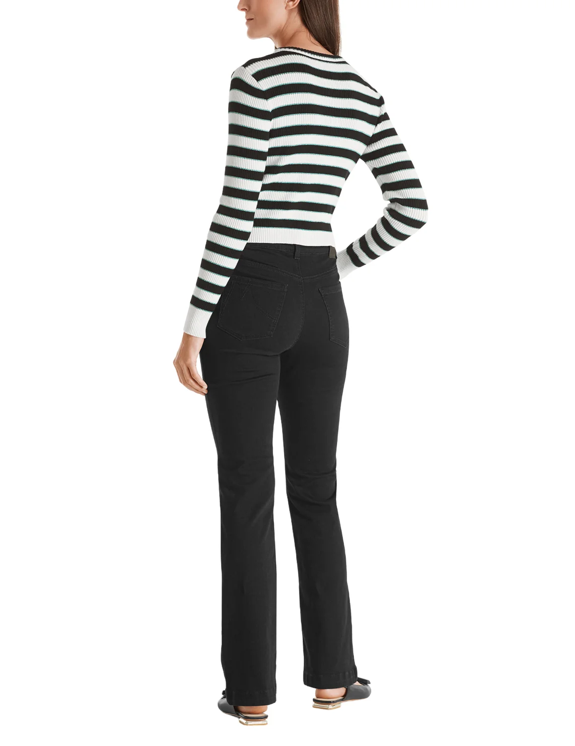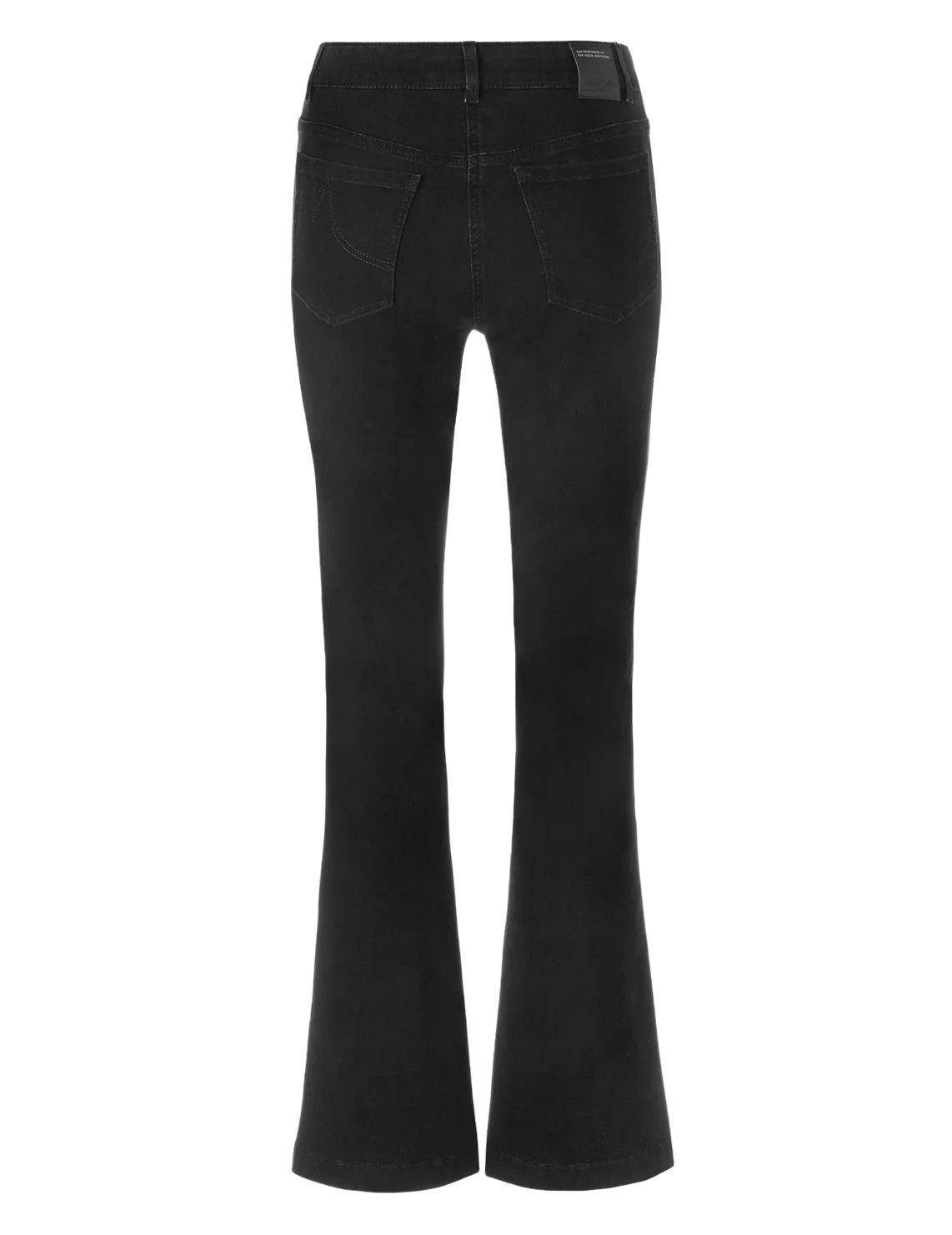 Джинсы от бренда Marc Cain изготовлены из хлопка, эластомультиэстера и эластана. Модель выполнена в расклешенном крое. Имеет петли для ремня, потайную застежку-молнию с пуговицей, прорезные боковые и накладные задние карманы.