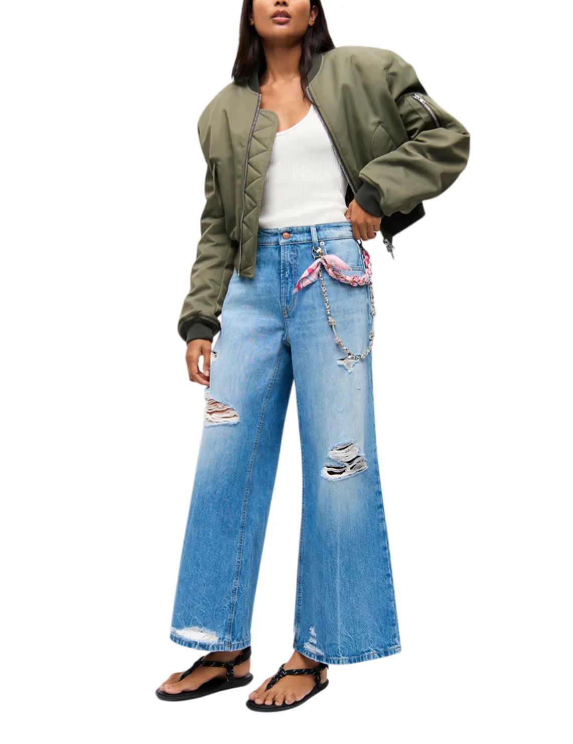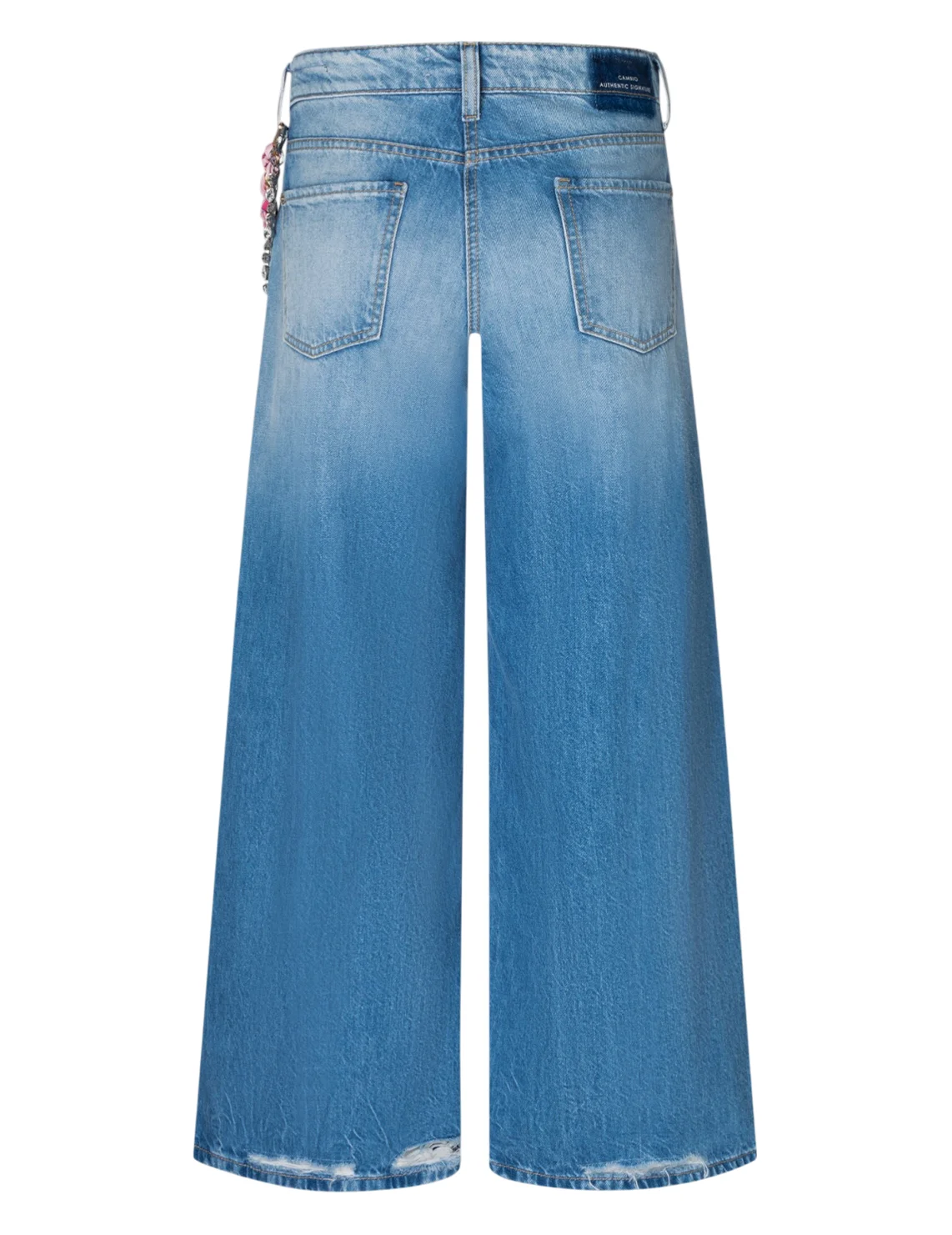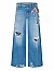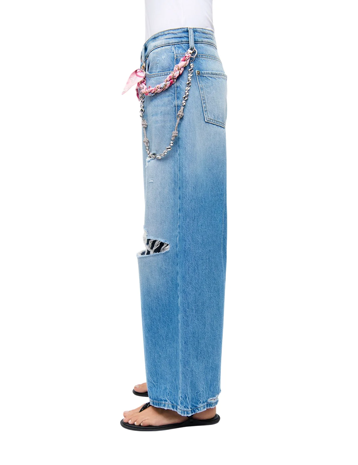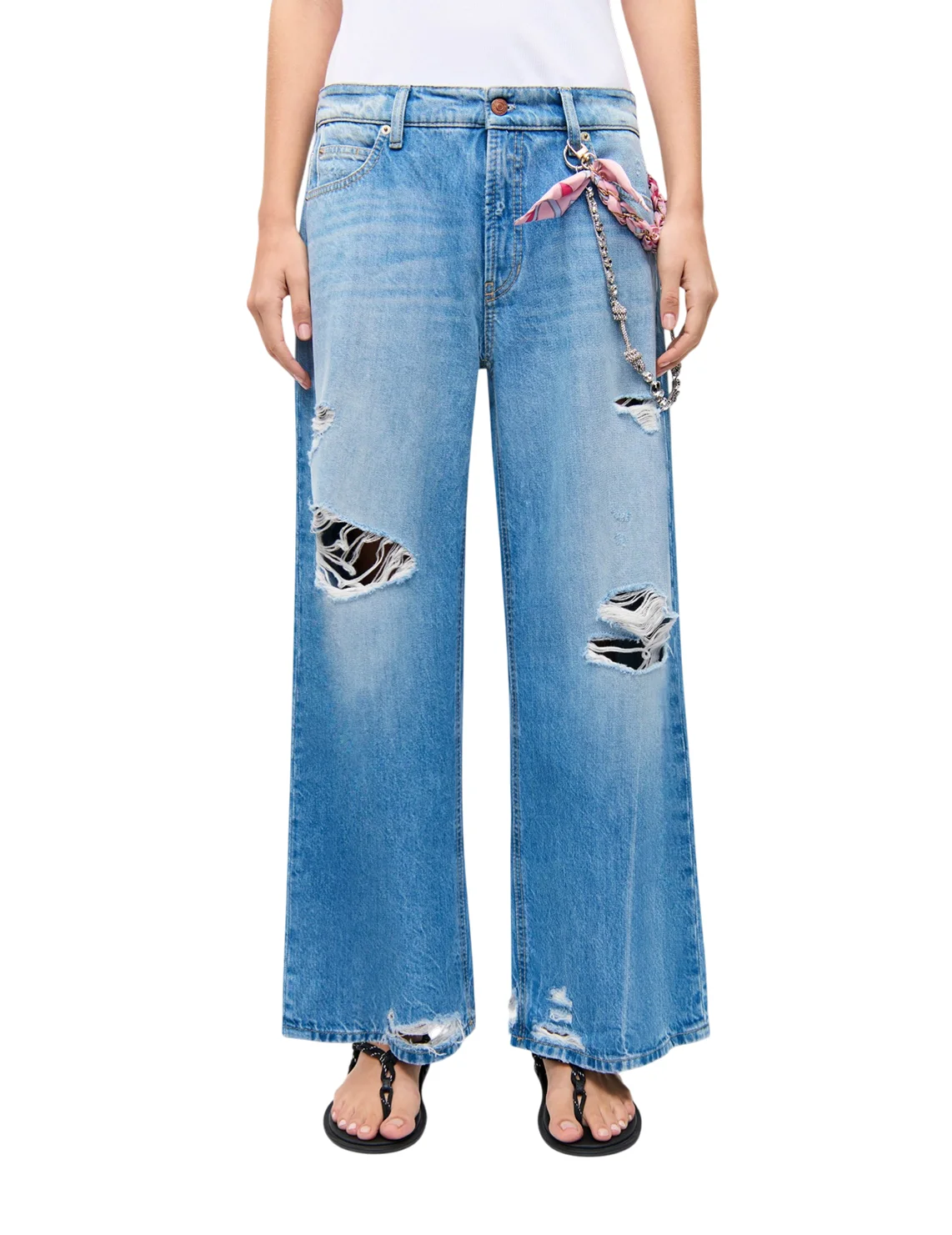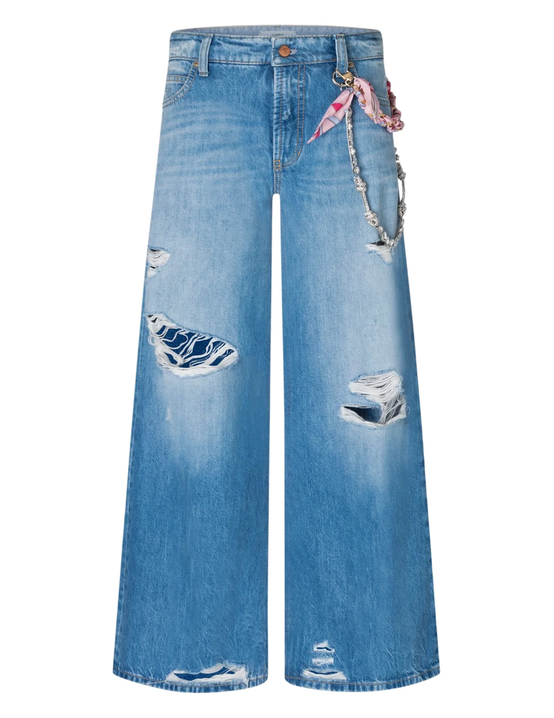 Джинсы с эффектом потертости изготовлены из 100% хлопка высокого качества. Модель выполнена в свободном крое. Имеет шлёвки для ремня, скрытую застежку-молнию с пуговицей, а также пару передних прорезных и пару задних накладных карманов. Декорированы цепочкой с шарфом и цепочкой со стразами.