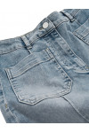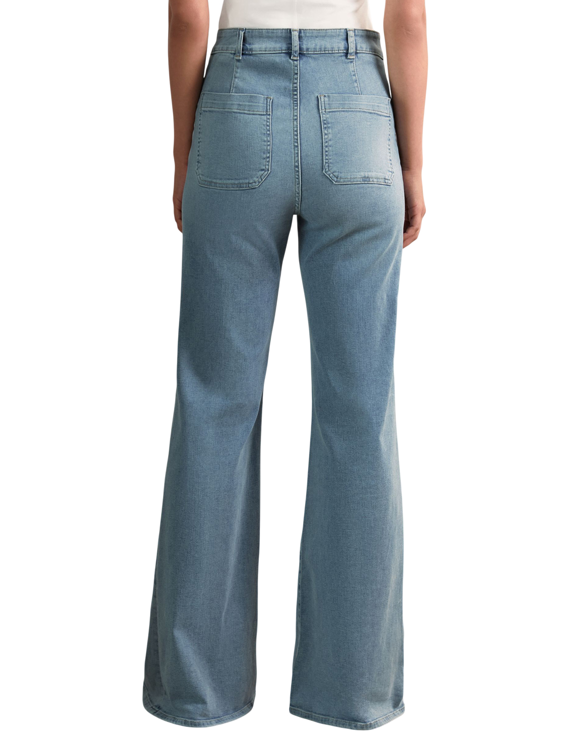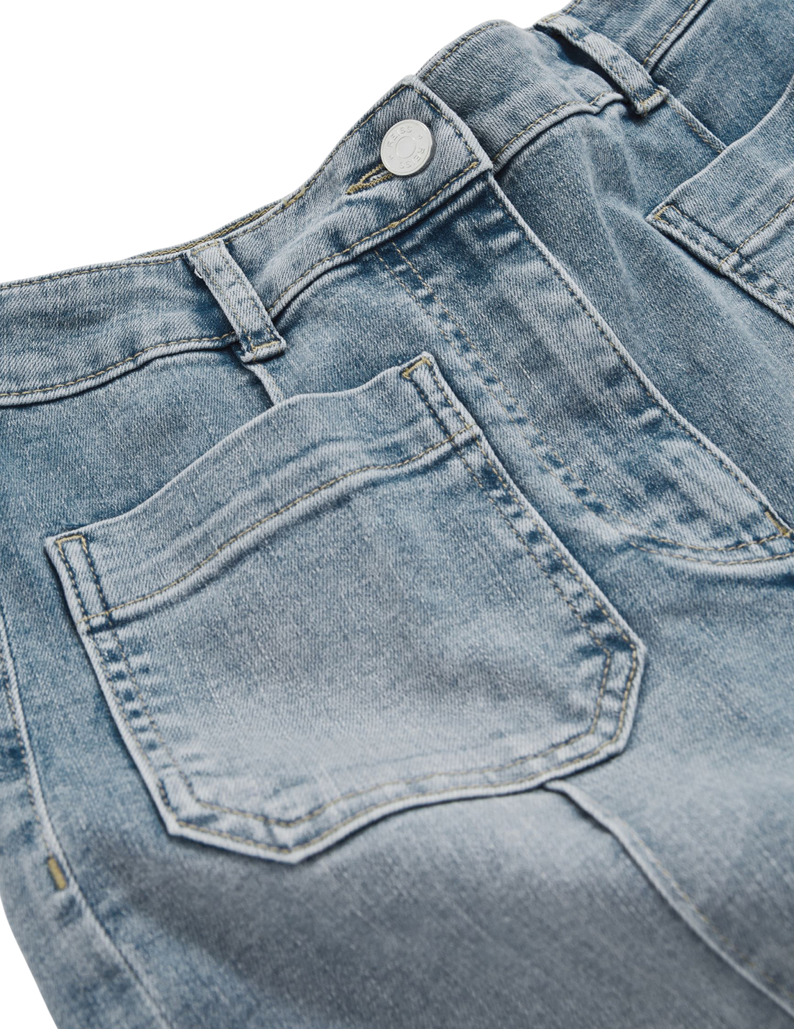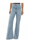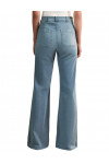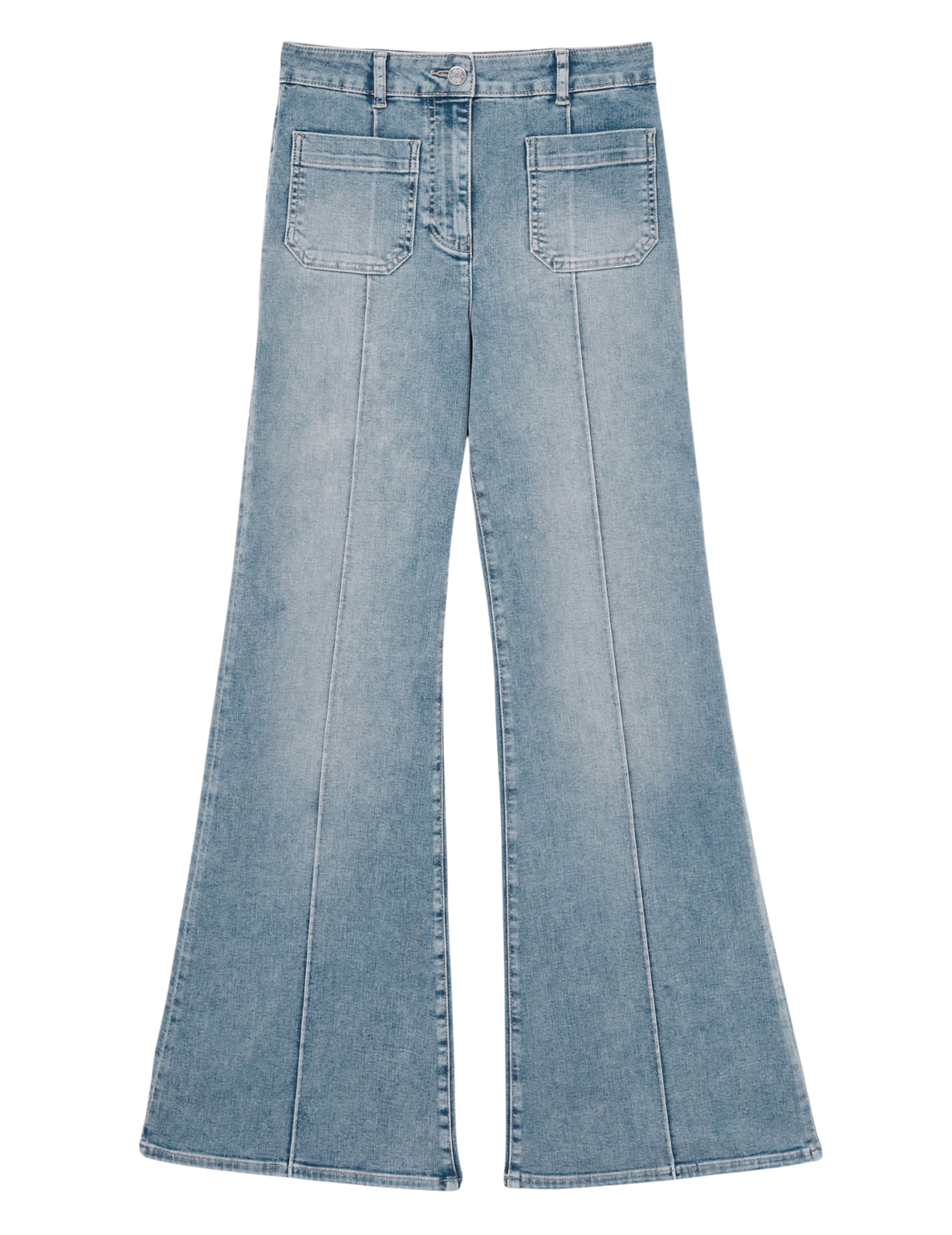 Джинсы изготовлены из хлопка, полиэстера, лиоцелла и эластана. Модель выполнена в расклешенном крое. Имеет шлёвки для ремня, скрытую застежку-молнию с пуговицей, простроченные стрелки, а также пару передних и пару задних накладных карманов.