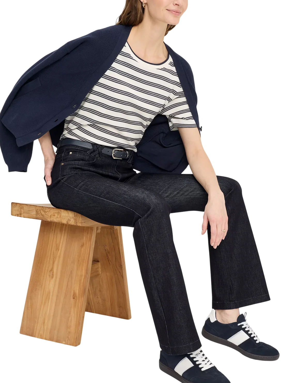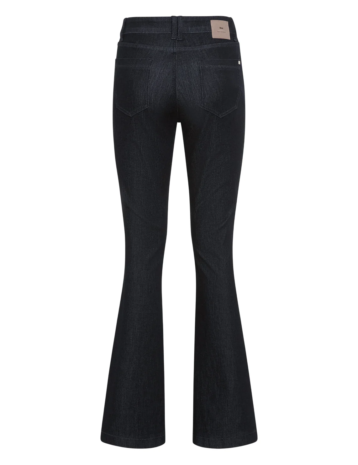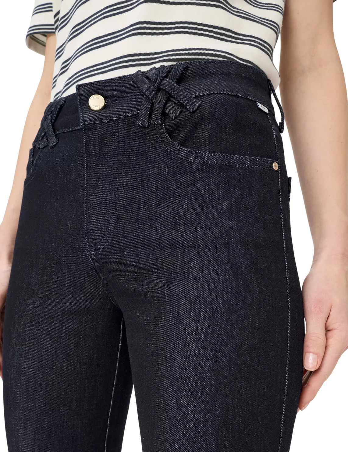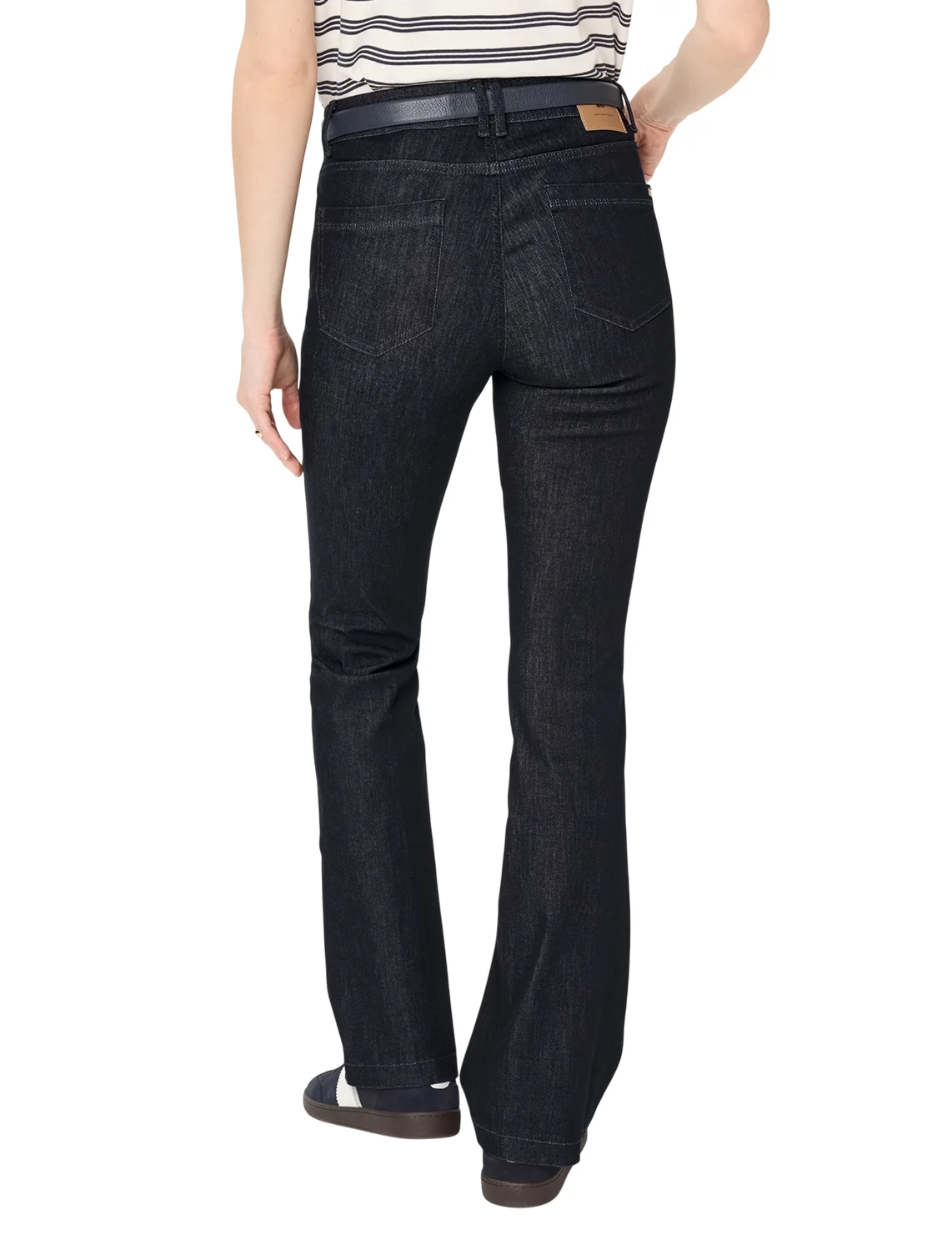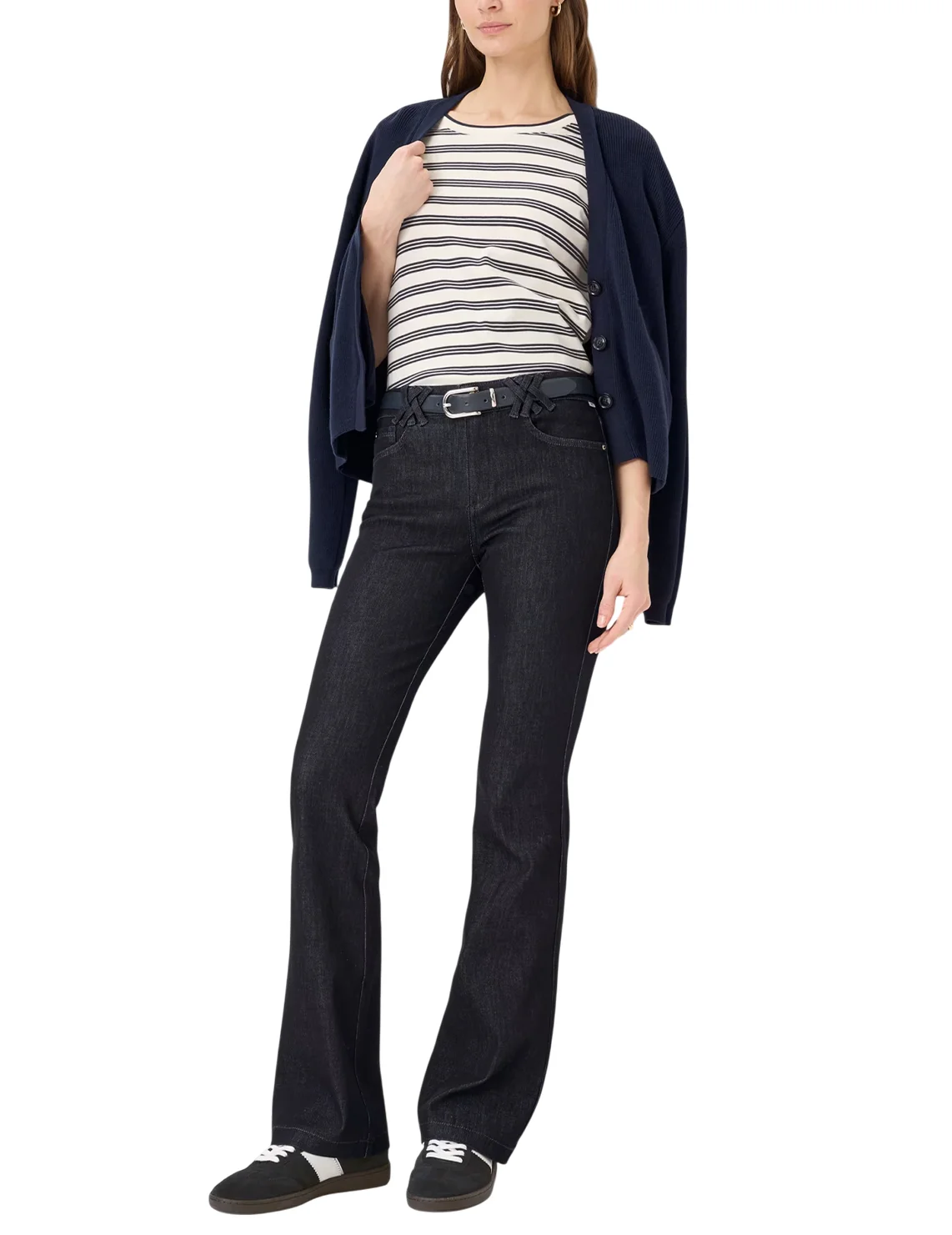 Джинсы изготовлены из хлопка, полиэстера, вискозы и эластана. Модель выполнена в расклешенном крое. Имеет петли для ремня, застежку-молнию с пуговицей, пару передних прорезных и пару задних накладных карманов.