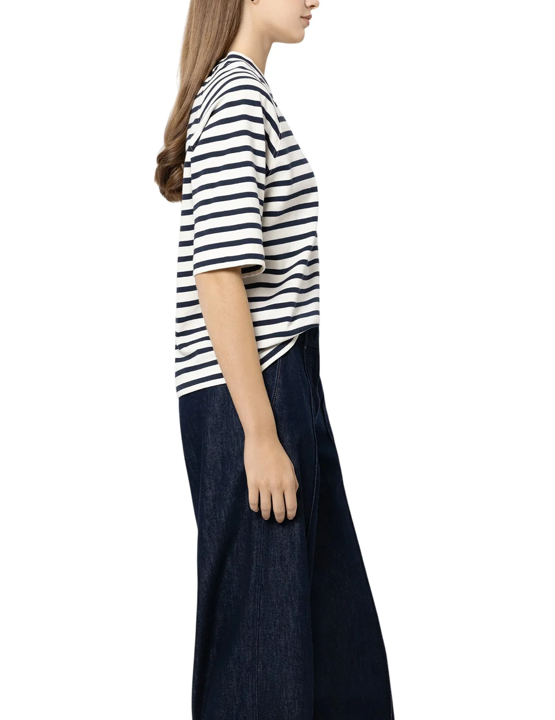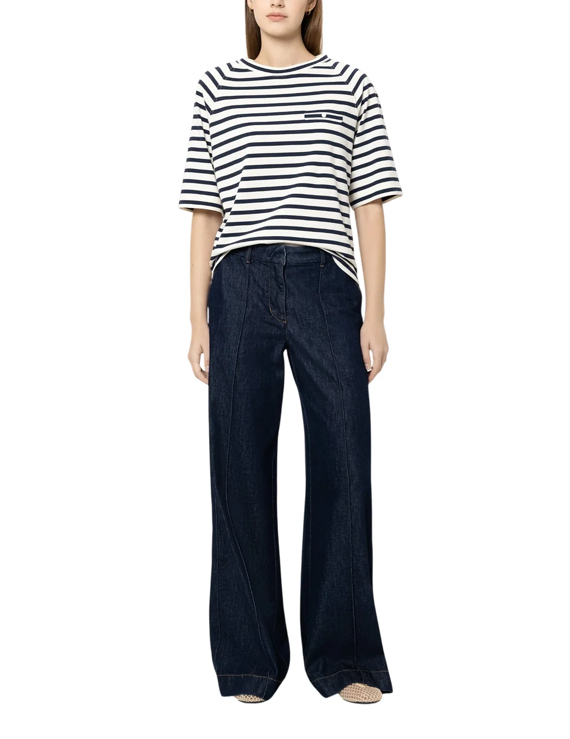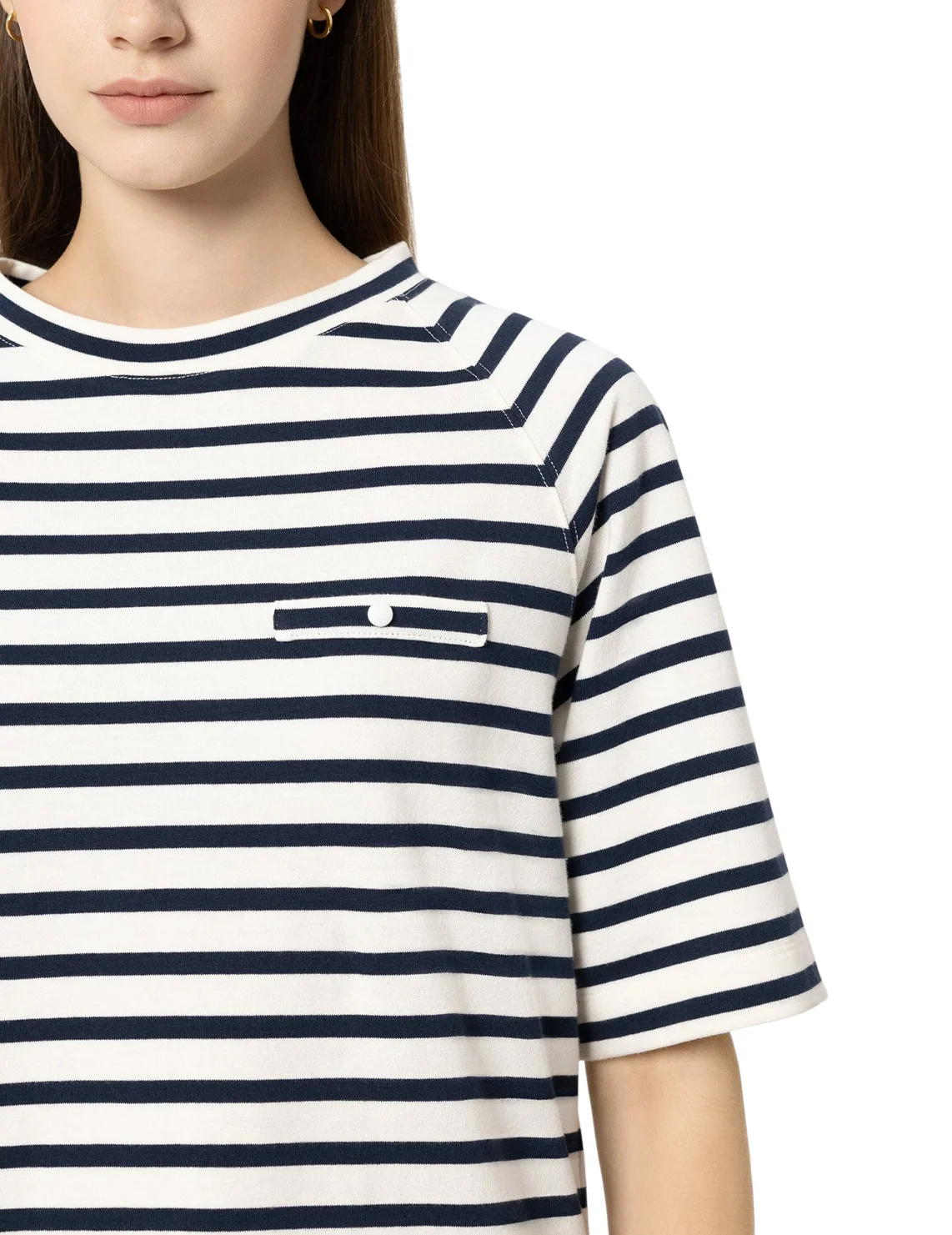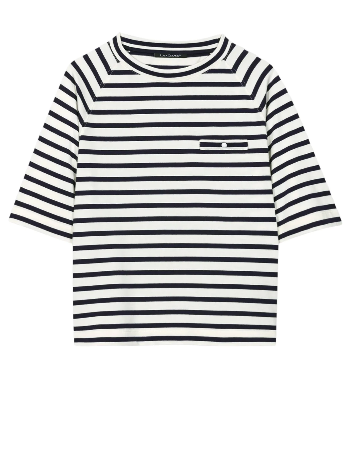 Футболка изготовлена из 100% хлопка высокого качества. Модель выполнена в прямом крое. Имеет круглый вырез горловины, боковые разрезы, декоративный карман и короткие рукава. Декорирована принтом в полоску.