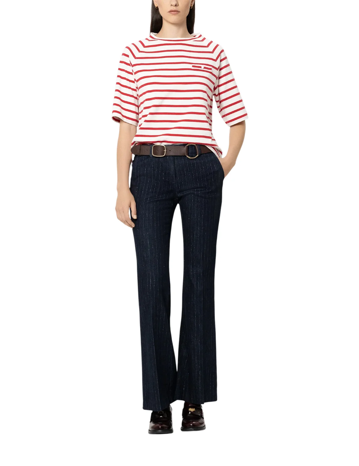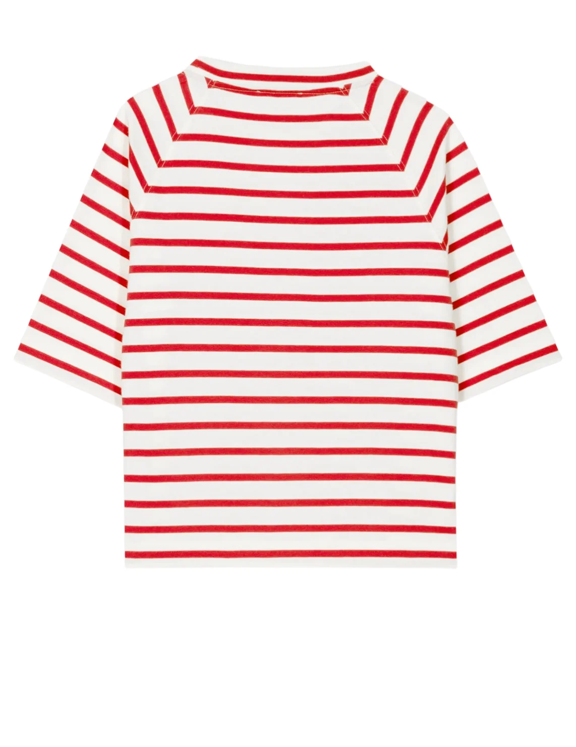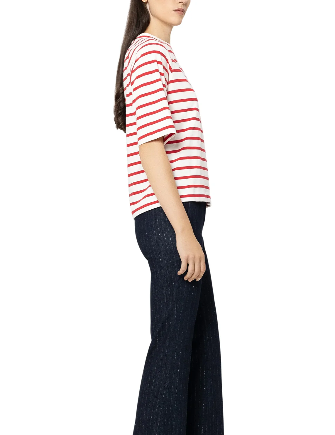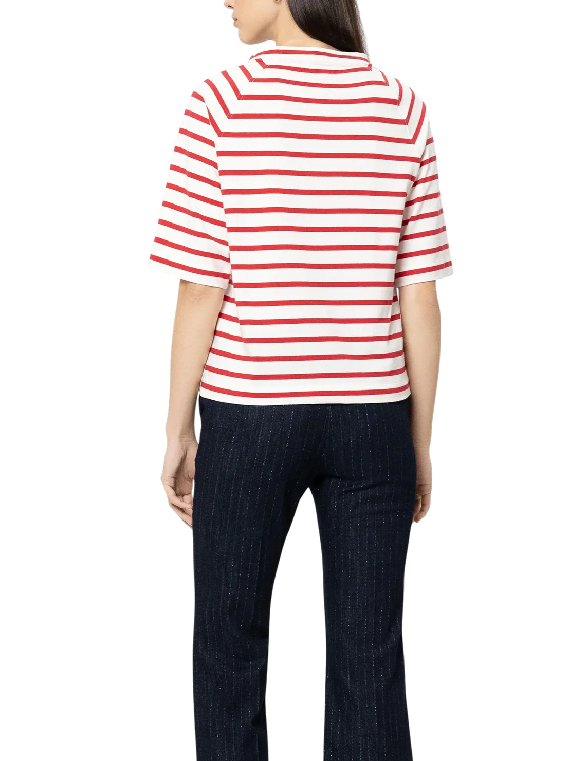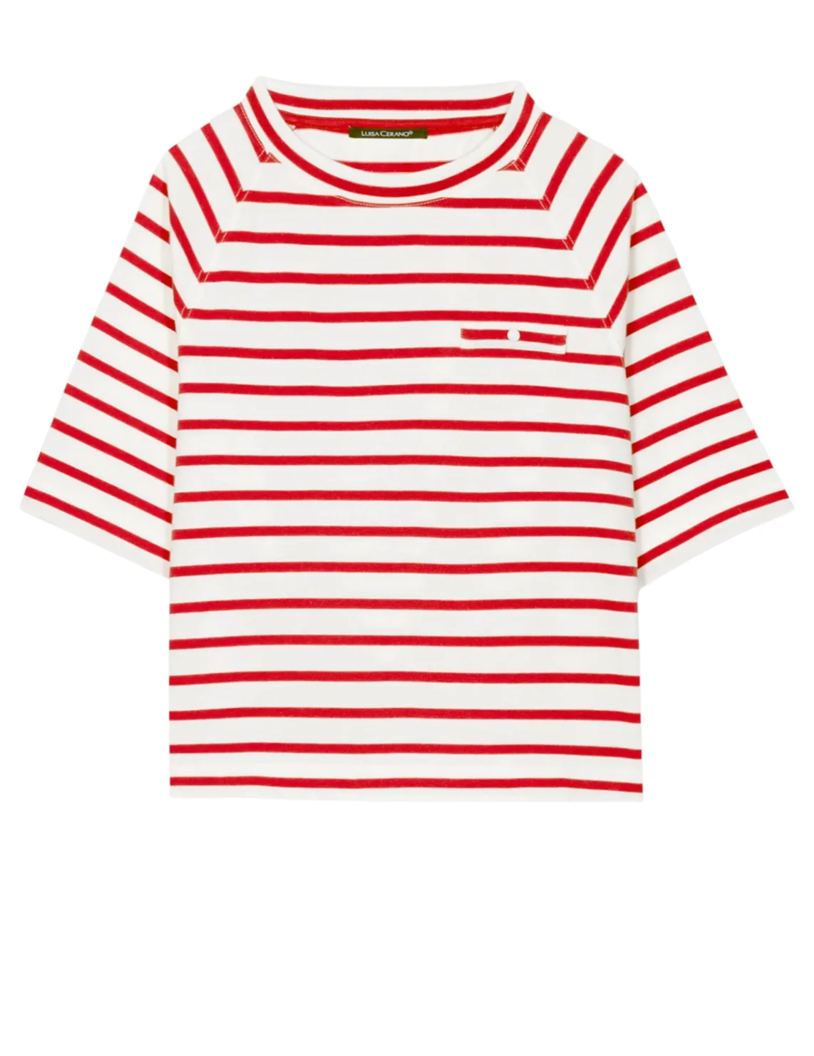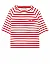 Футболка изготовлена из 100% хлопка высокого качества. Модель выполнена в прямом крое. Имеет круглый вырез горловины, боковые разрезы, декоративный карман и короткие рукава. Декорирована принтом в полоску.