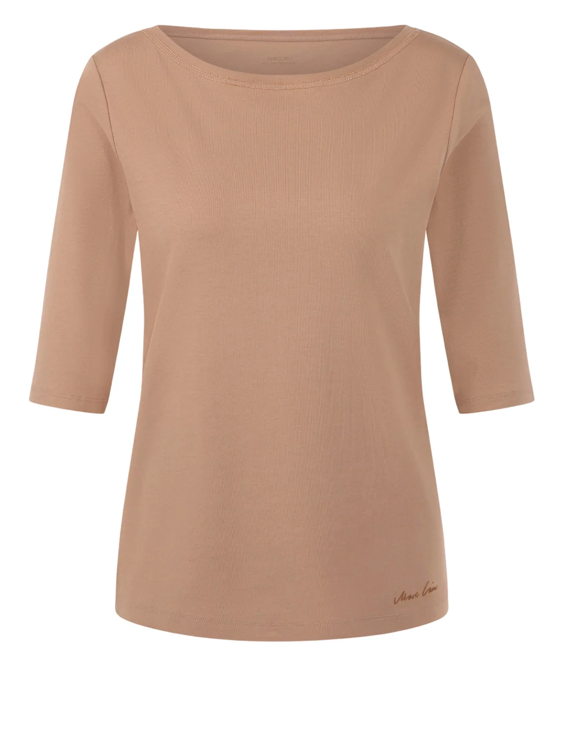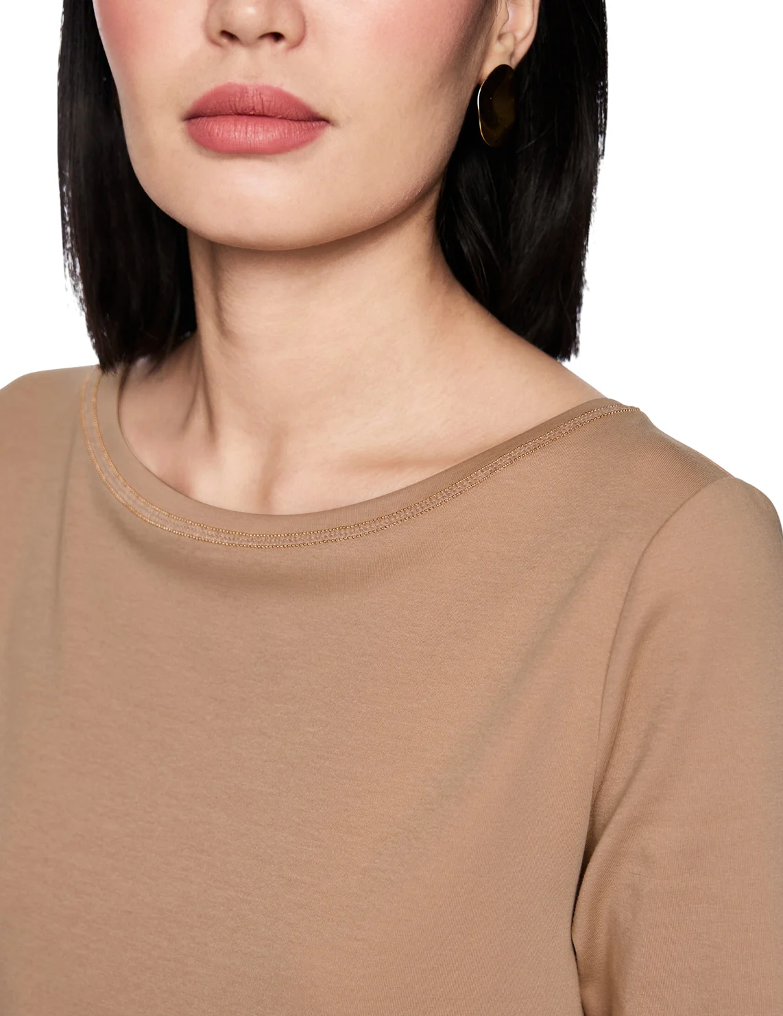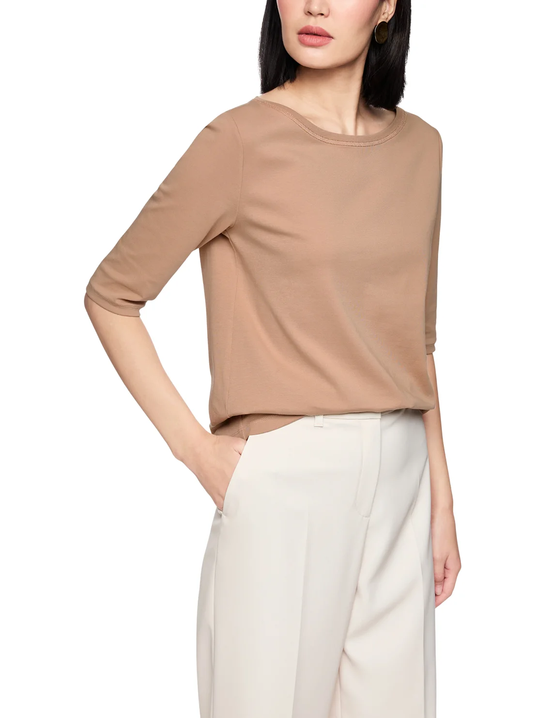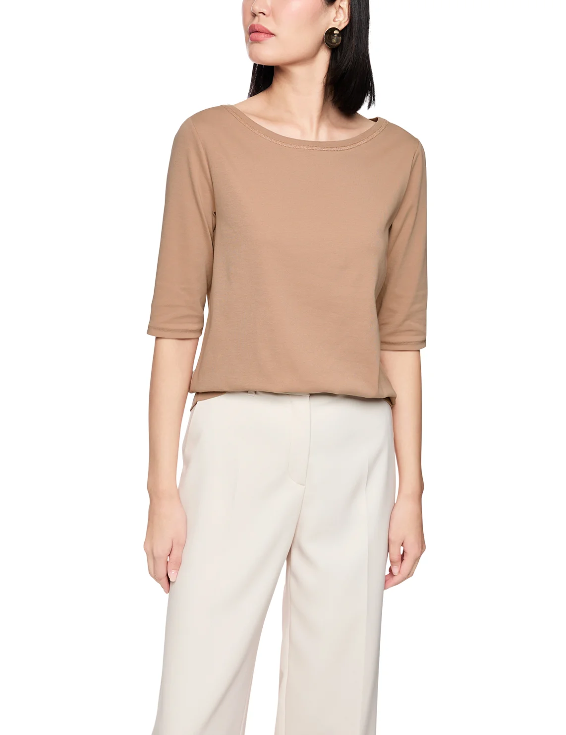 Футболка изготовлена из хлопка и эластана. Модель выполнена в прямом крое. Имеет круглый вырез горловины, принт с логотипом бренда и рукава длиной 3/4. Вырез горловины украшен декоративной лентой.