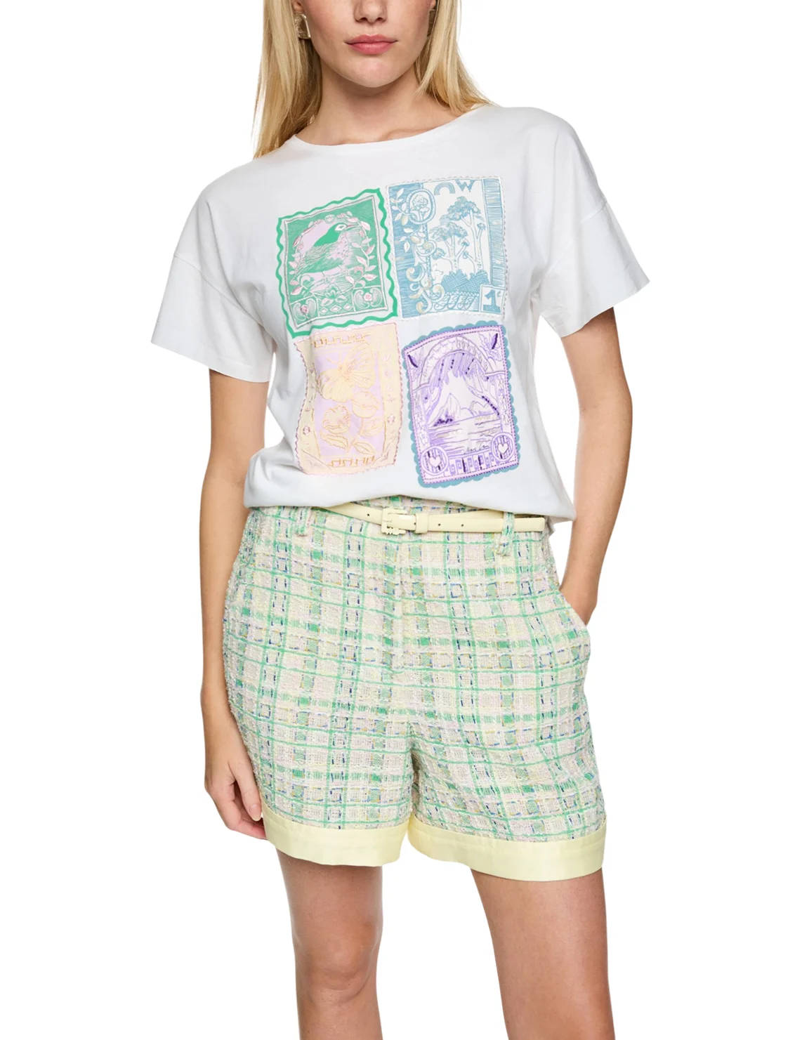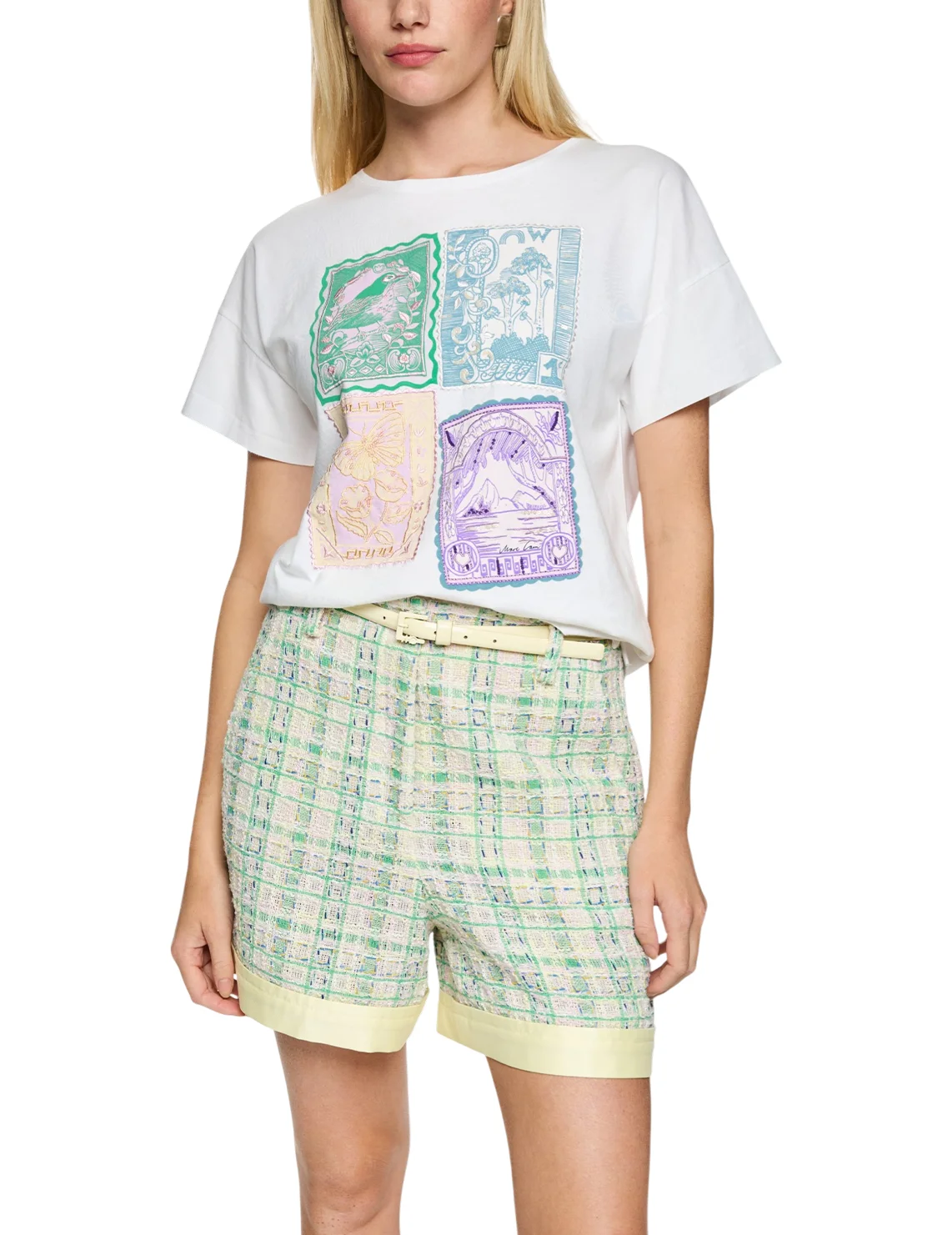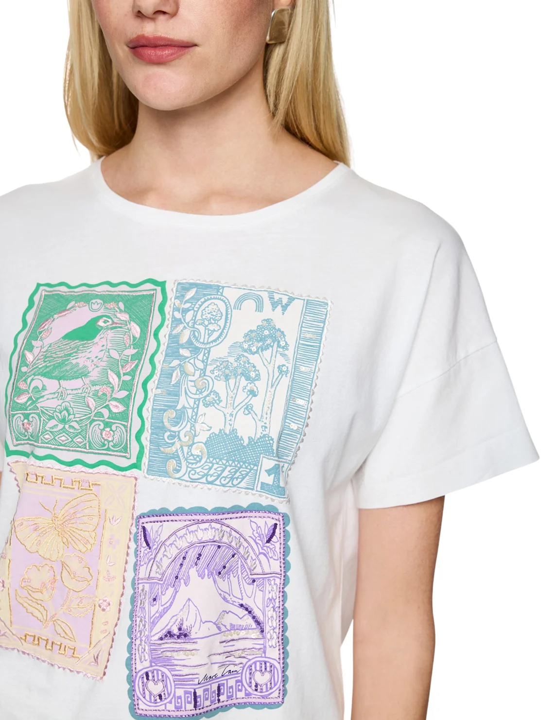 Футболка изготовлена из 100% хлопка. Модель выполнена в свободном крое. Имеет круглый вырез горловины и короткие рукава. Декорирована оригинальным принтом, пайетками и вышивкой.