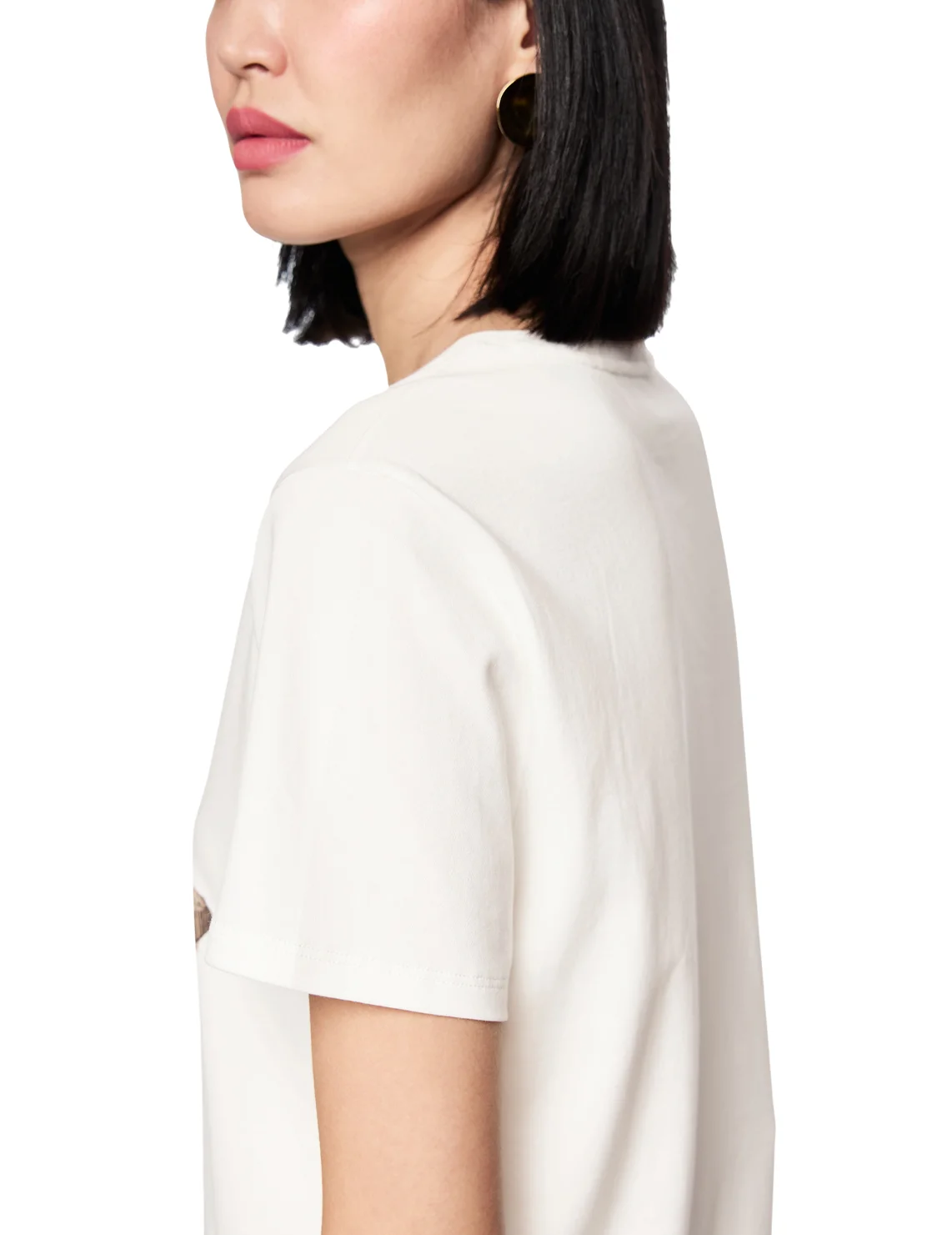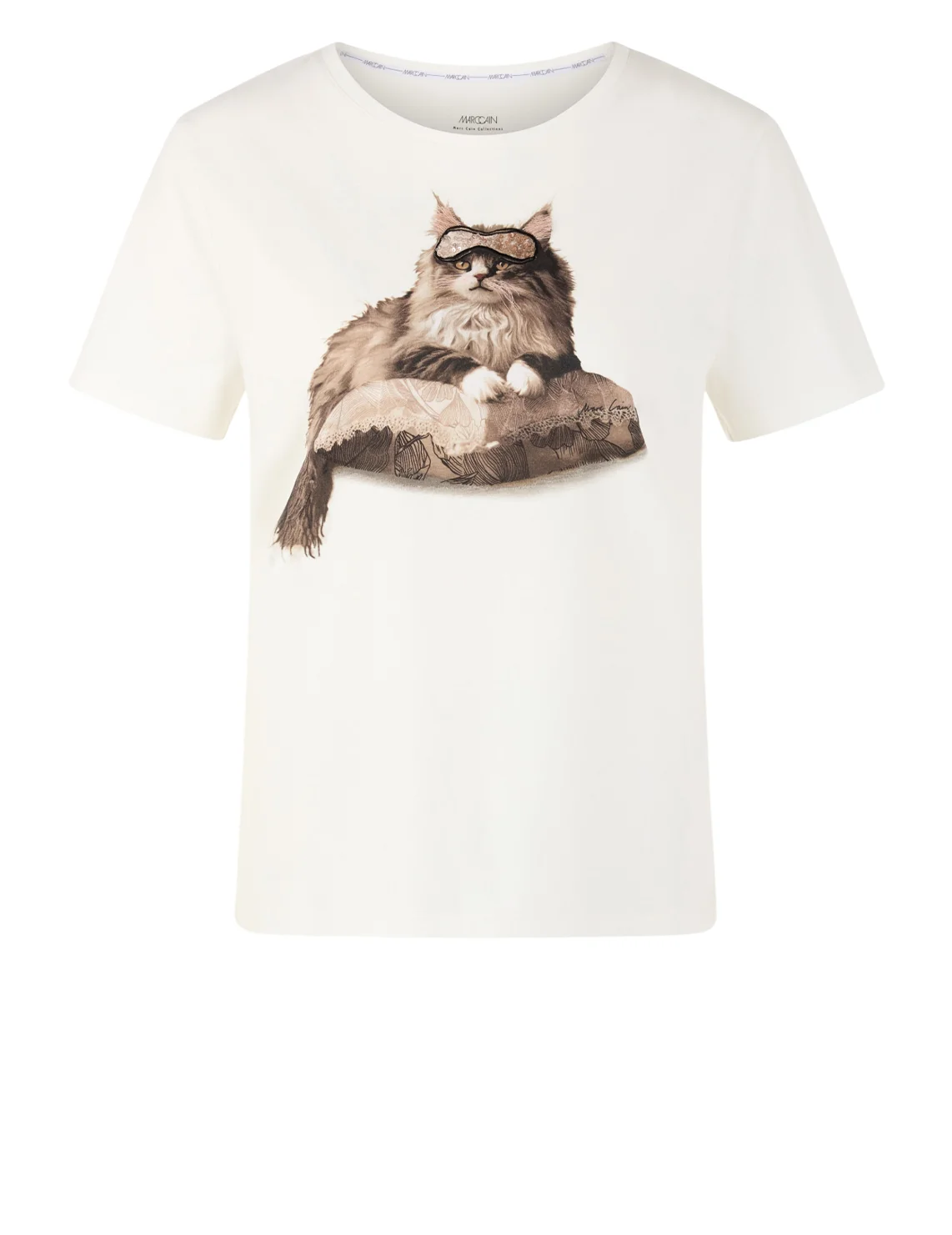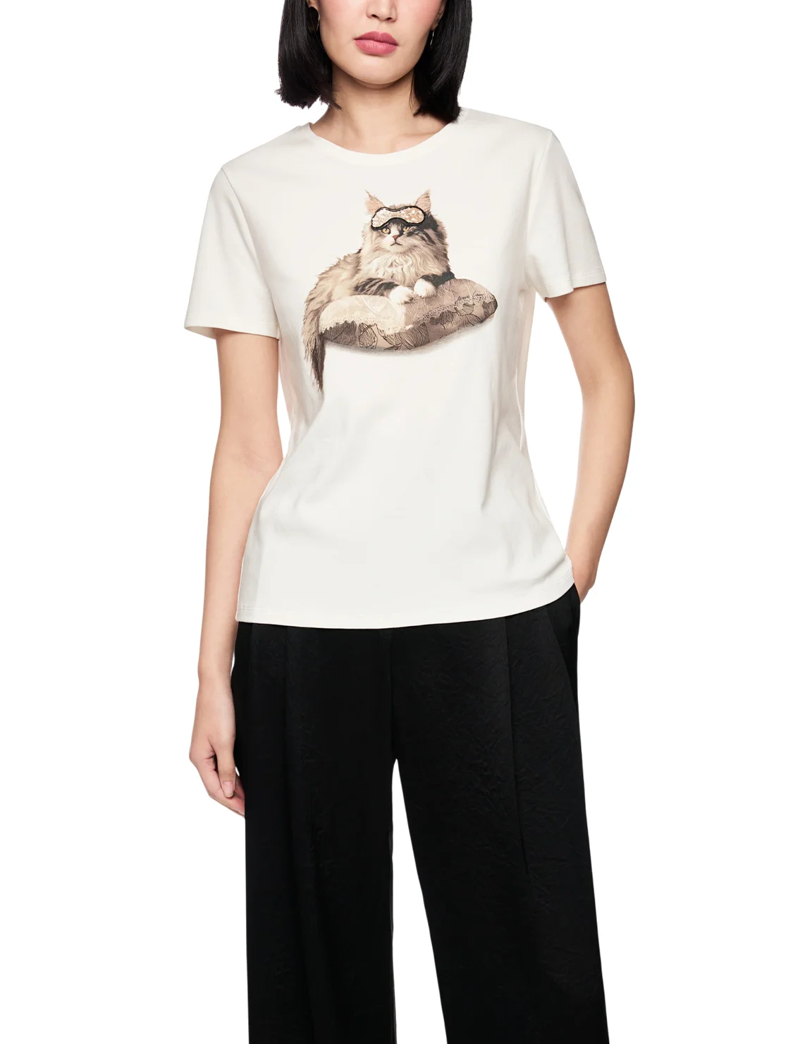 Футболка изготовлена из хлопка высокого качества. Модель выполнена в прямом крое. Имеет круглый вырез горловины и короткие рукава. Декорирована оригинальным принтом и аппликацией из пайеток.