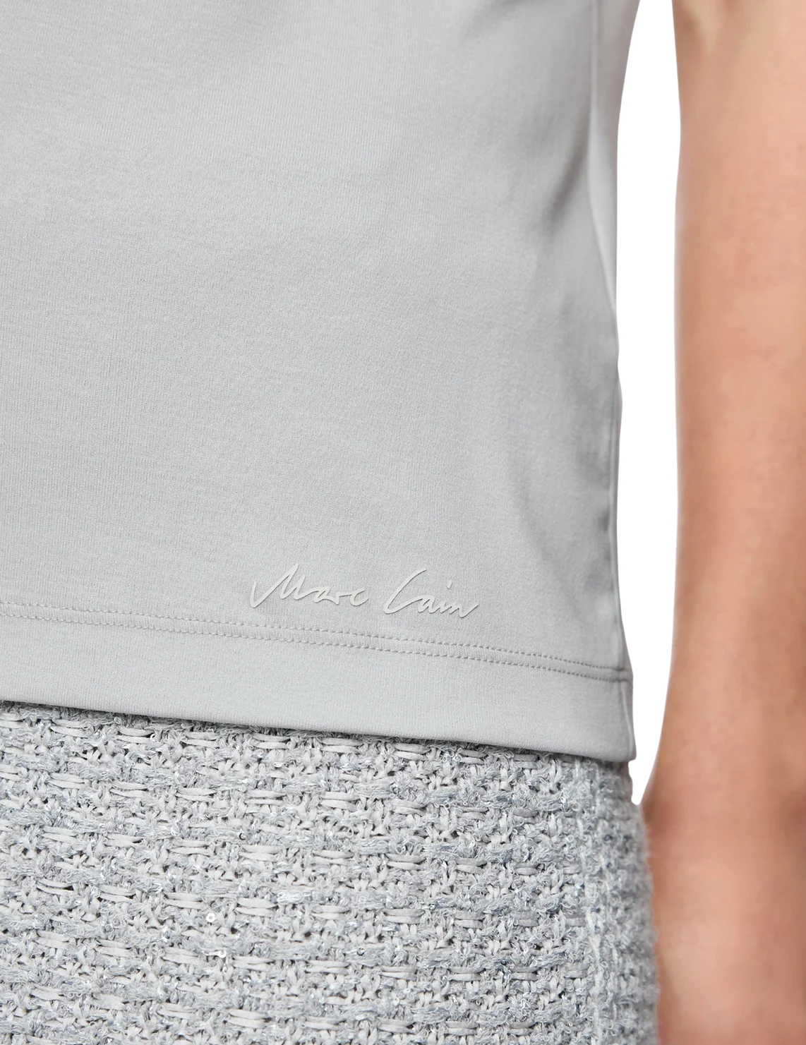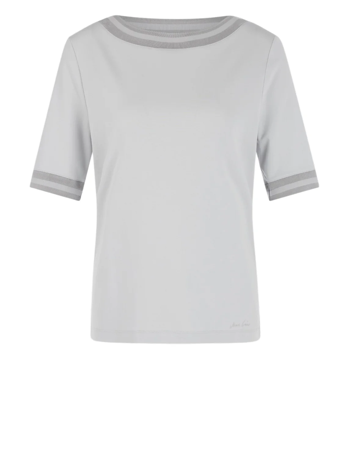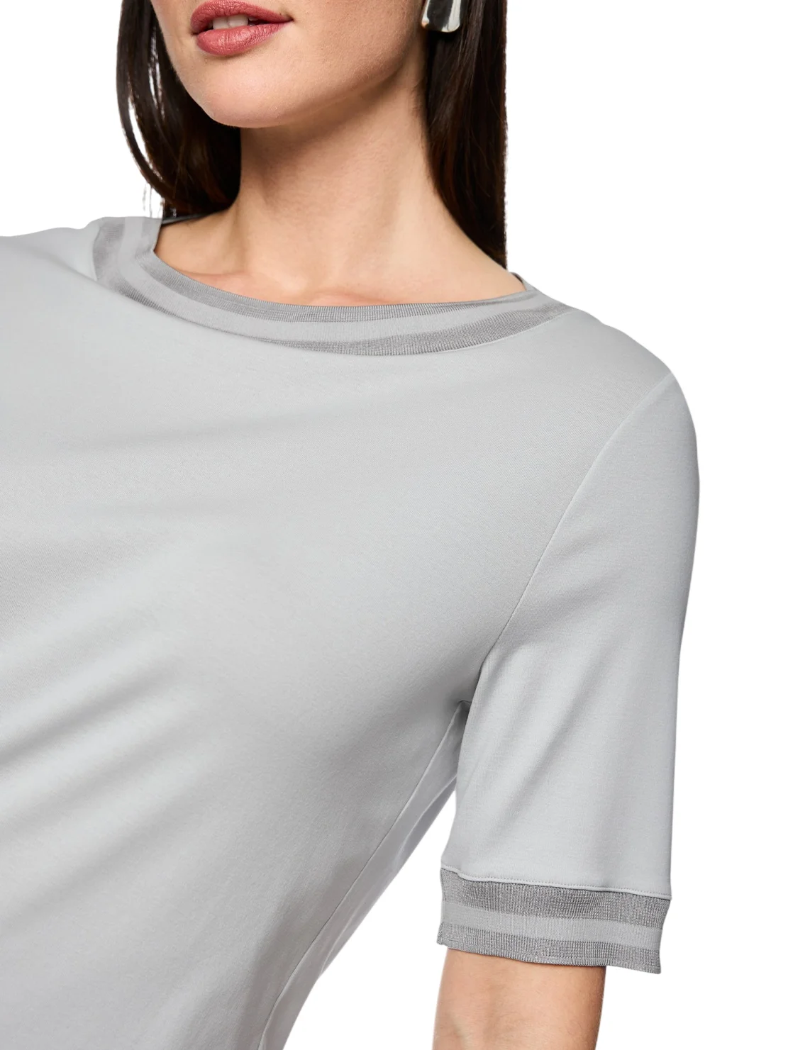 Футболка изготовлена из хлопка и эластана. Модель выполнена в прямом крое. Имеет круглый вырез горловины и короткие рукава с манжетами. Декорирована принтом в полоску.