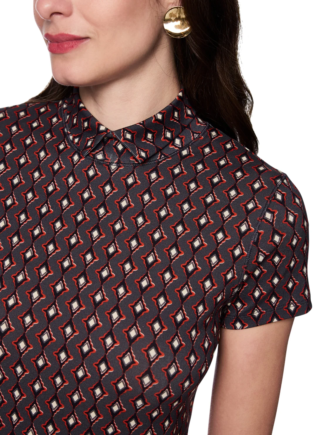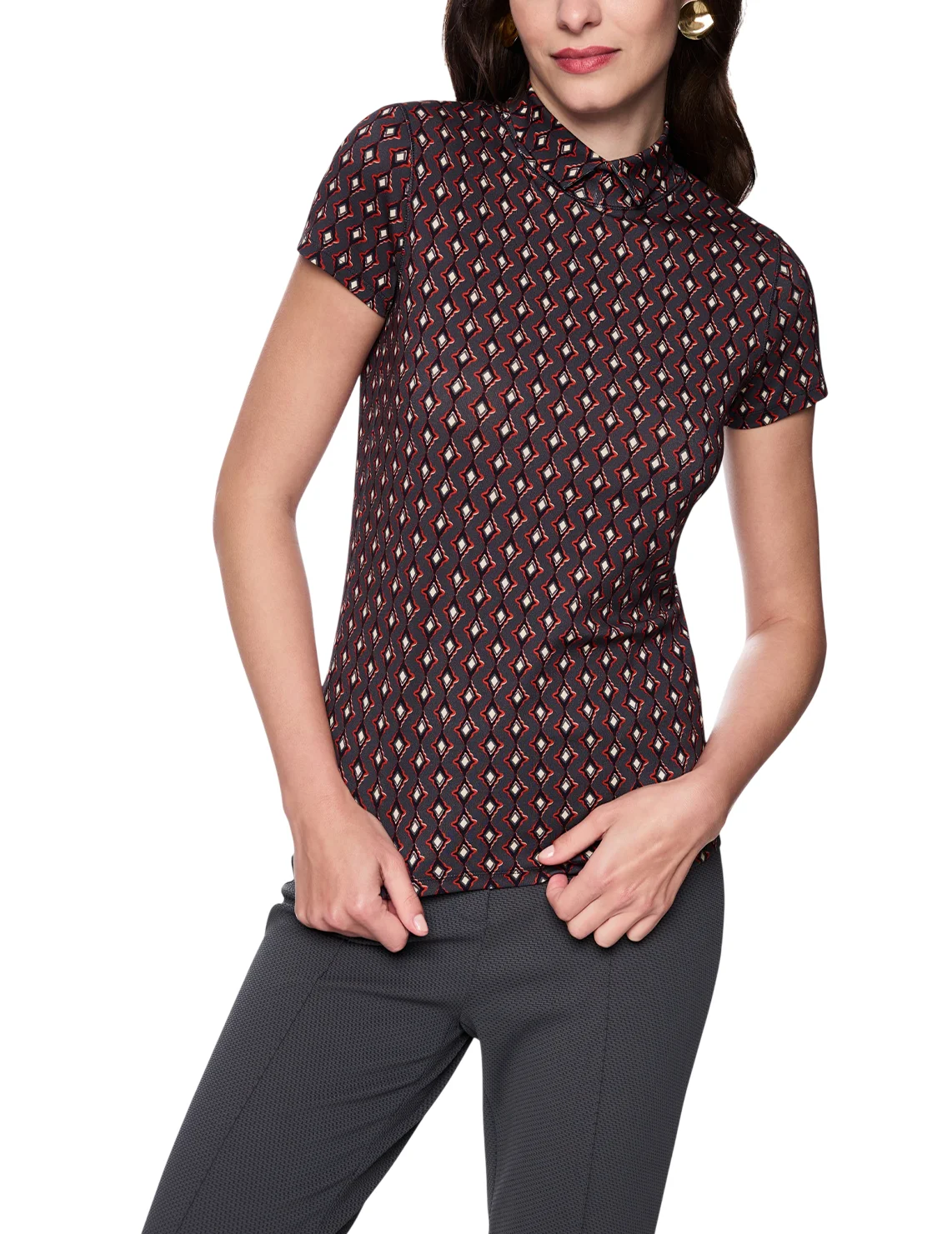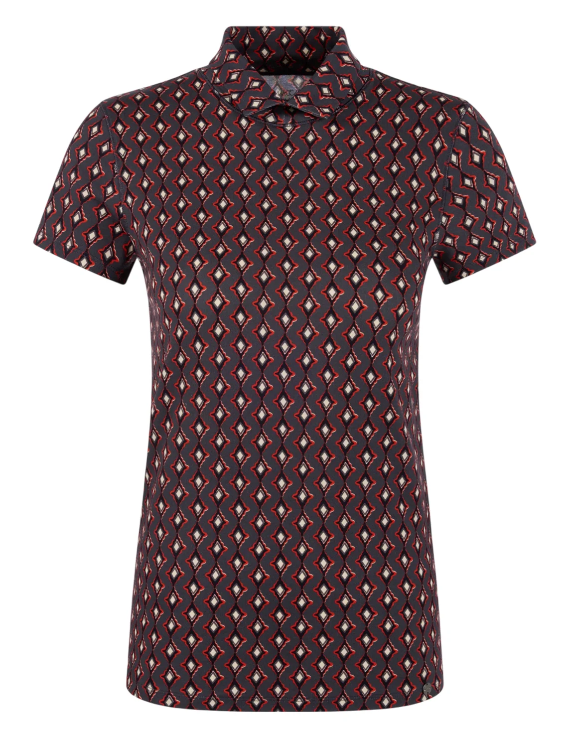 Футболка изготовлена из хлопка и эластана. Модель выполнена в приталенном крое. Имеет отложной воротник и короткие рукава. Декорирована орнаментным принтом.