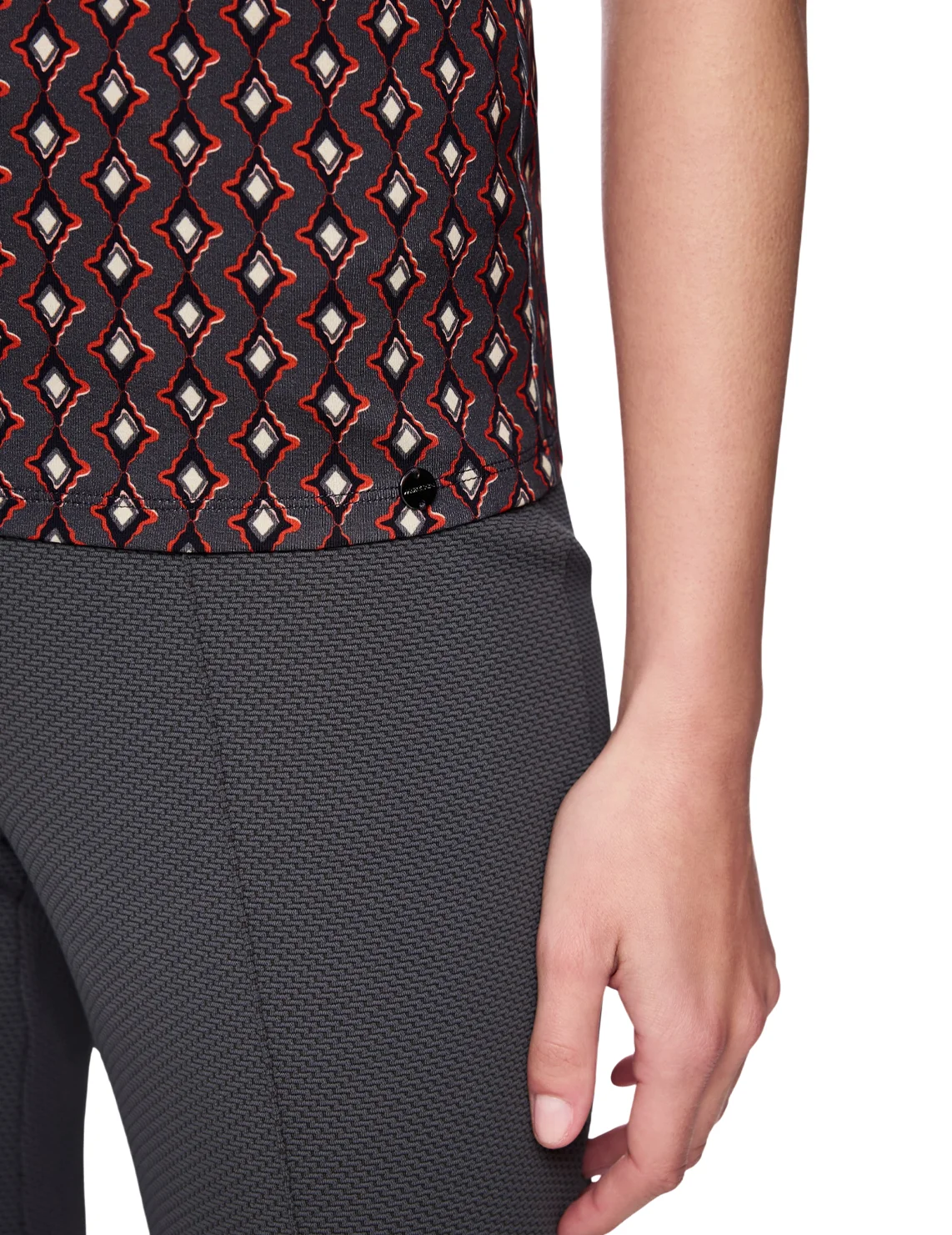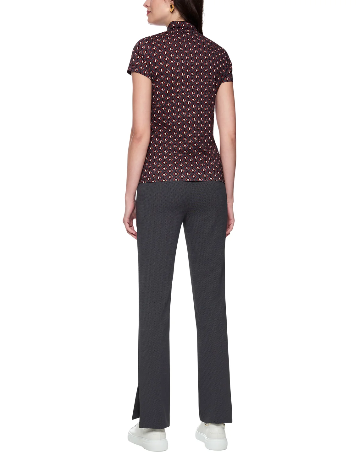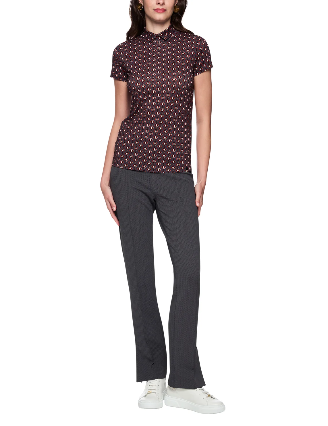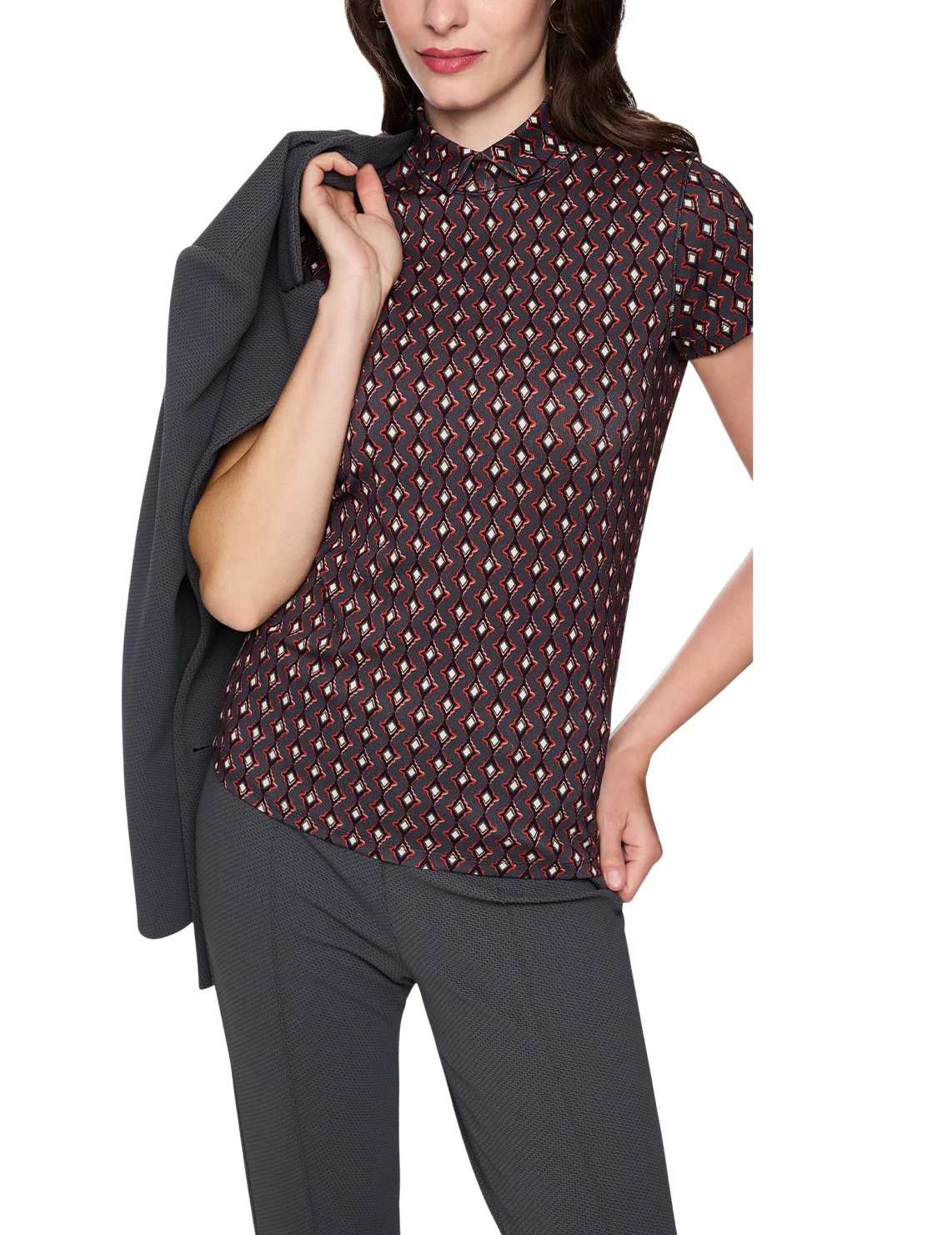 Футболка изготовлена из хлопка и эластана. Модель выполнена в приталенном крое. Имеет отложной воротник и короткие рукава. Декорирована орнаментным принтом.