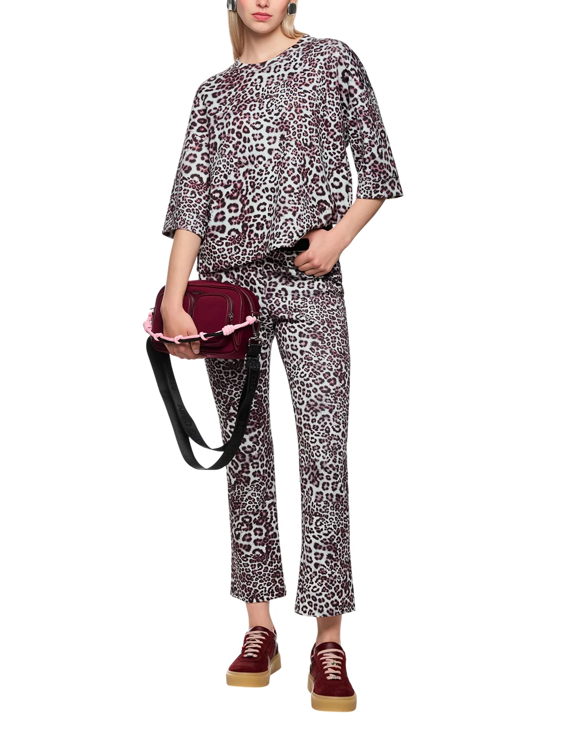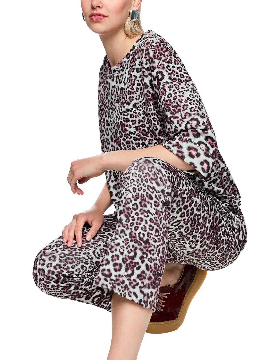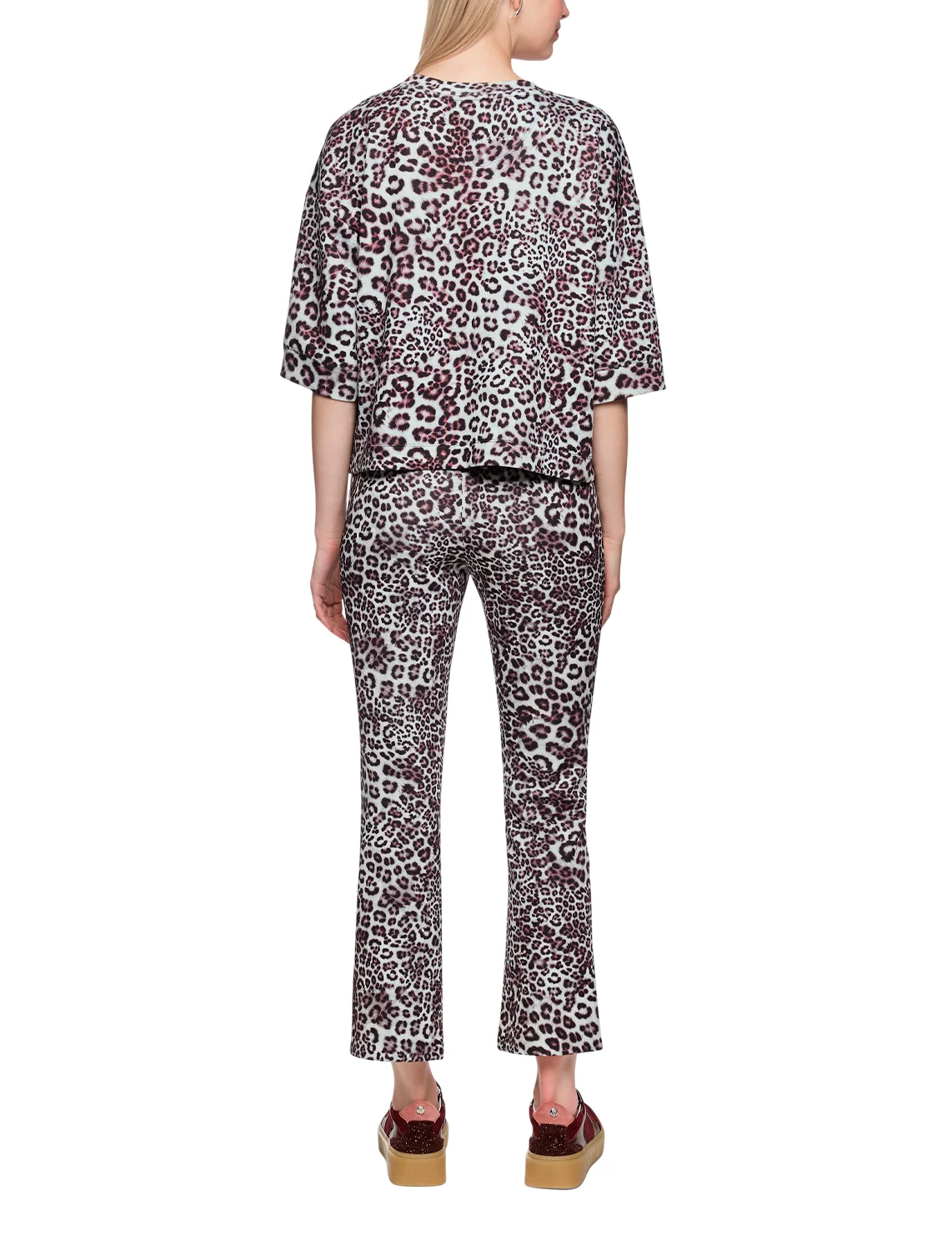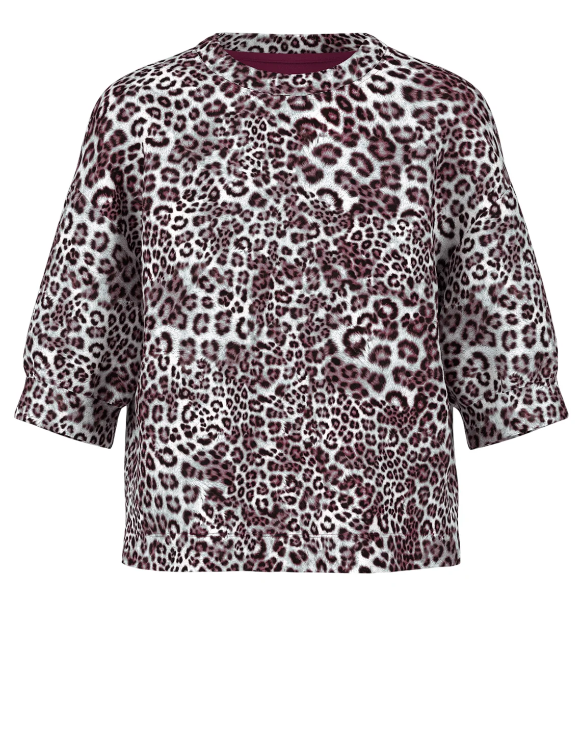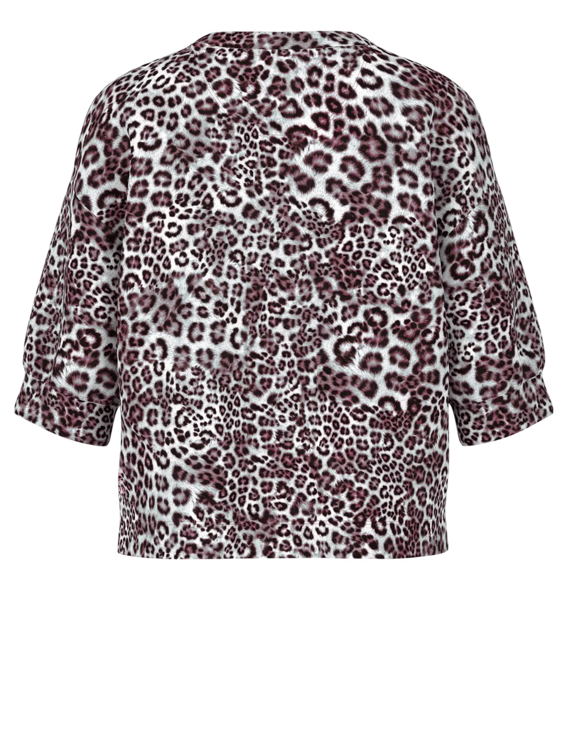 Футболка изготовлена из полиэстера, вискозы и эластана. Модель выполнена в свободном крое. Имеет круглый вырез горловины, боковые разрезы и рукава длиной 3/4 с манжетами. Декорирована анималистичным принтом.