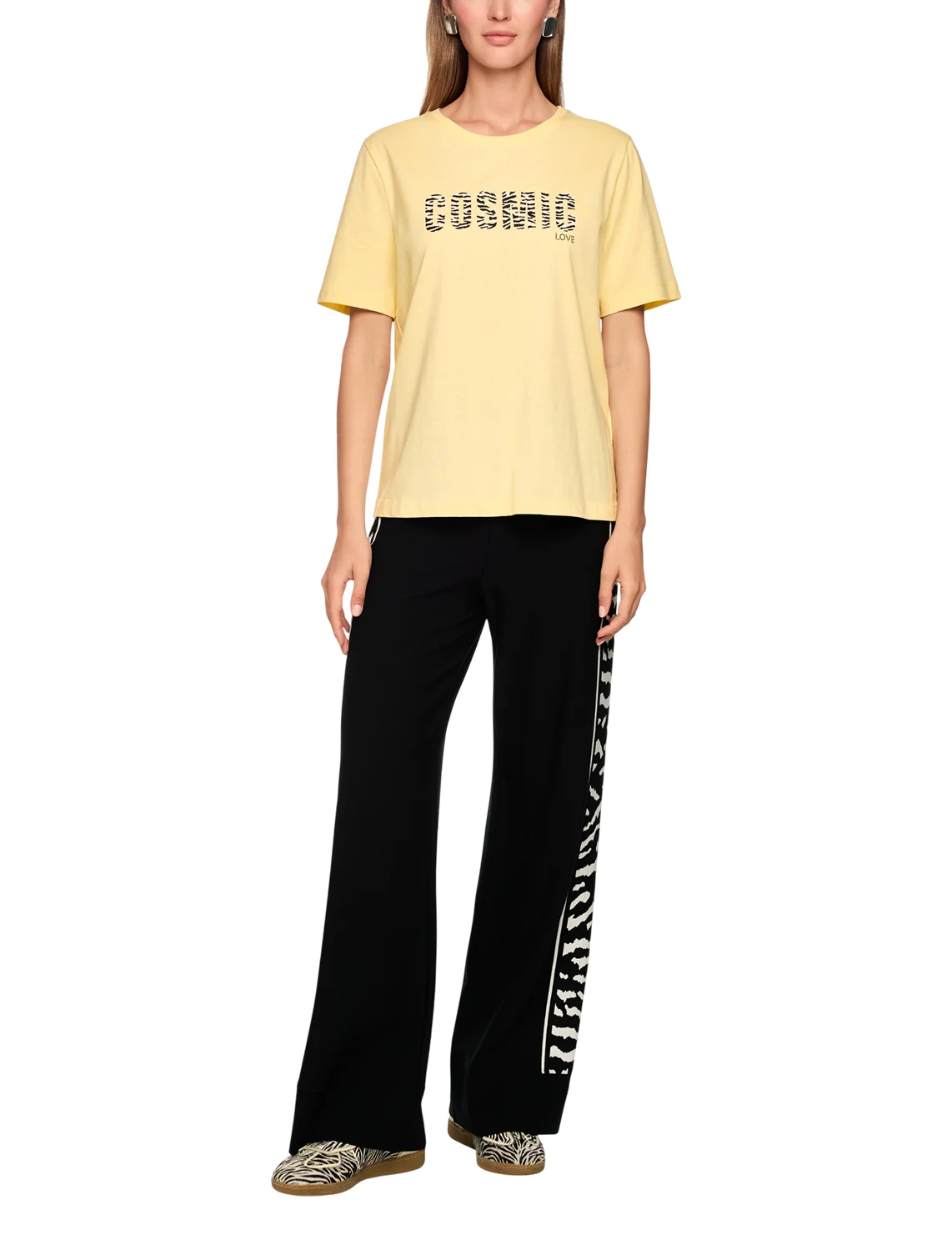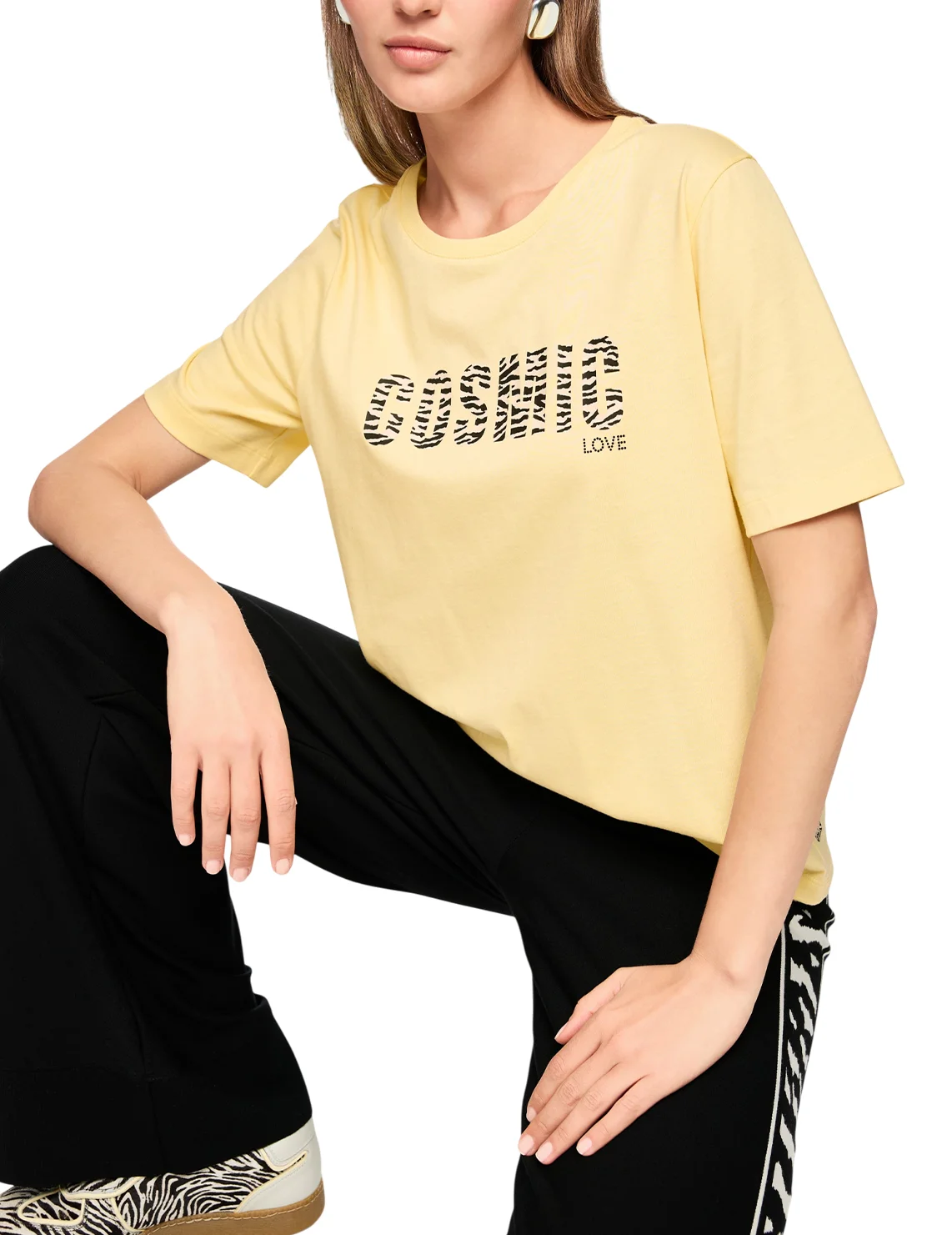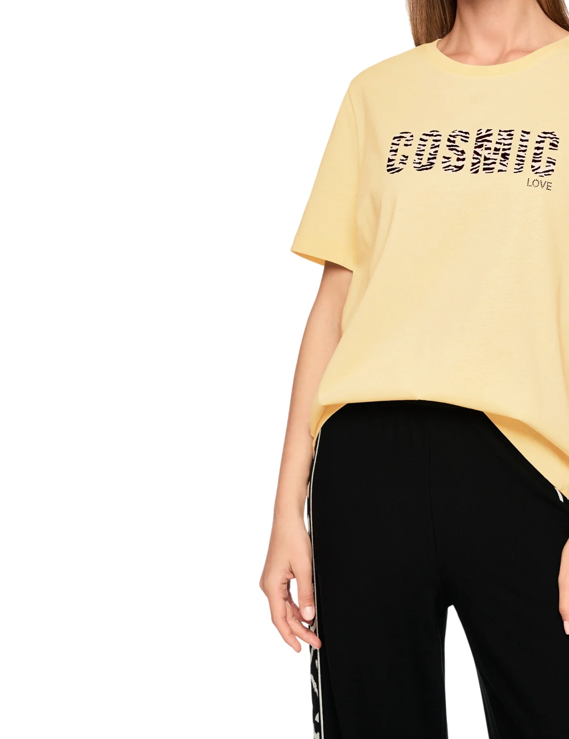 Футболка изготовлена из хлопка высокого качества. Модель выполнена в прямом крое. Имеет круглый вырез горловины и короткие рукава. Декорирована оригинальным принтом и стразами.
