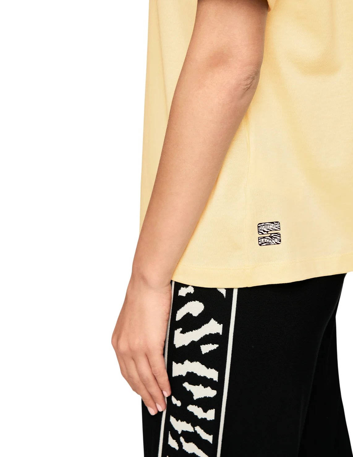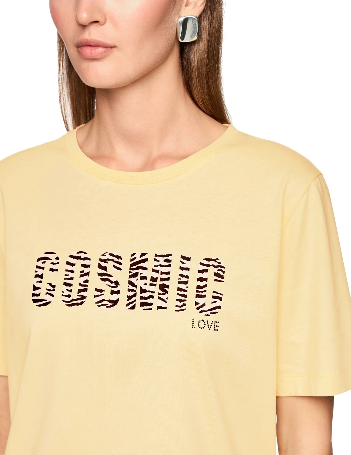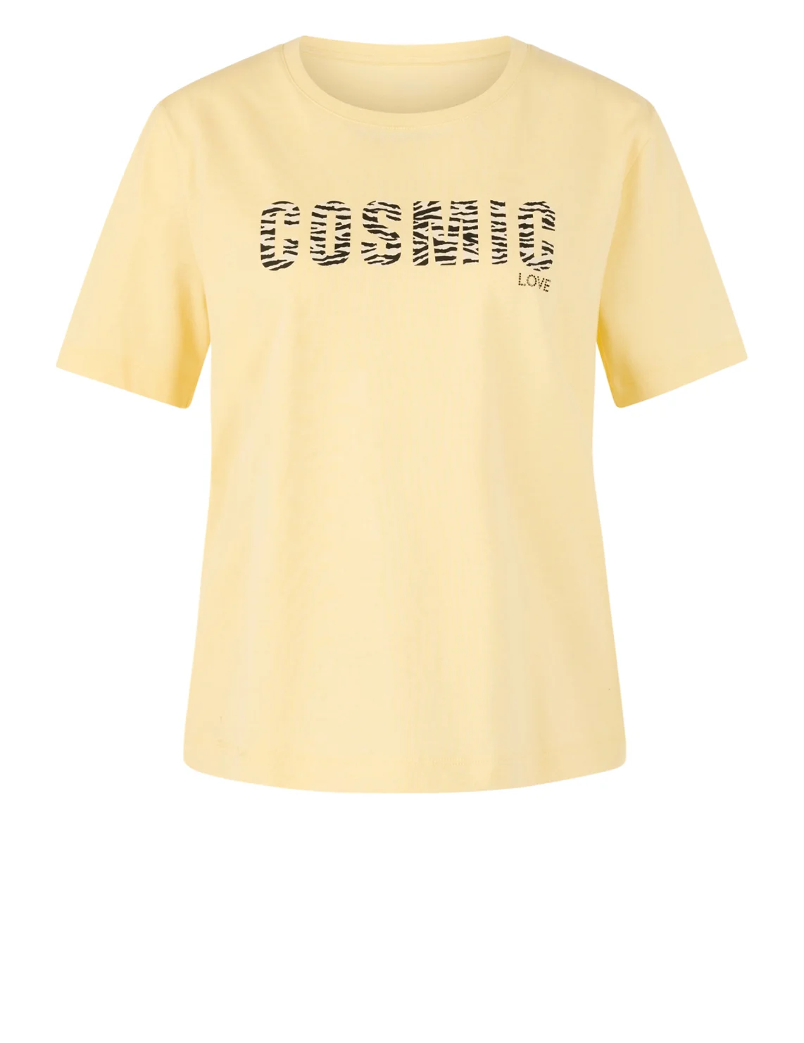 Футболка изготовлена из хлопка высокого качества. Модель выполнена в прямом крое. Имеет круглый вырез горловины и короткие рукава. Декорирована оригинальным принтом и стразами.