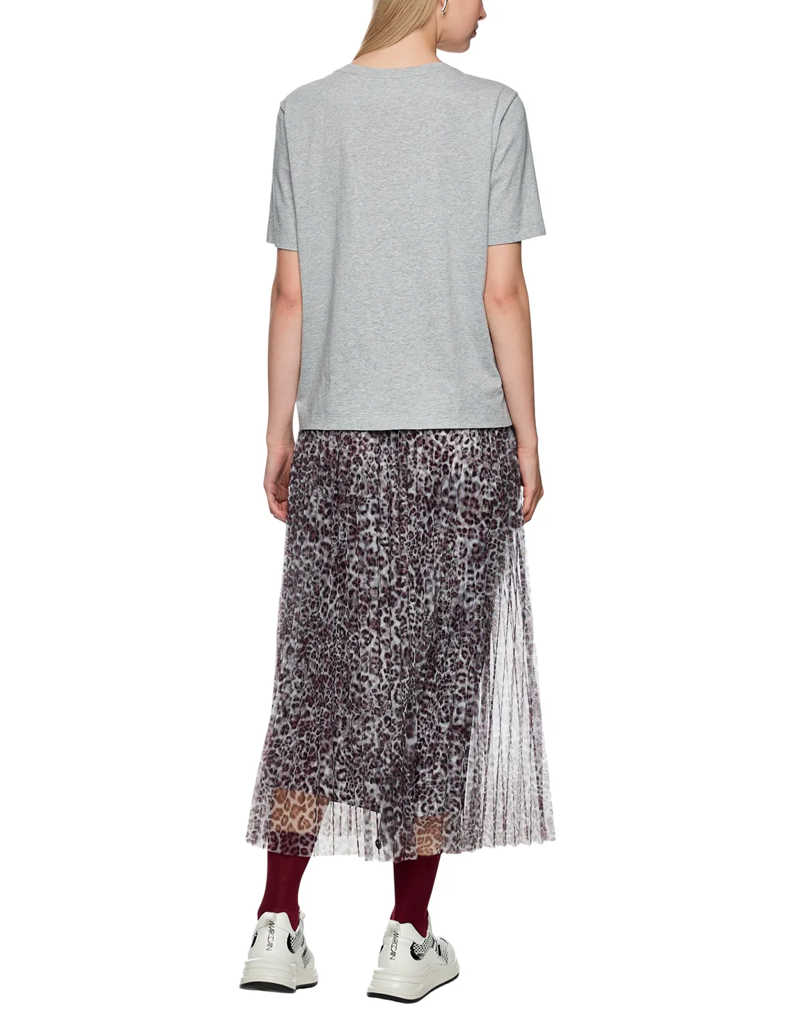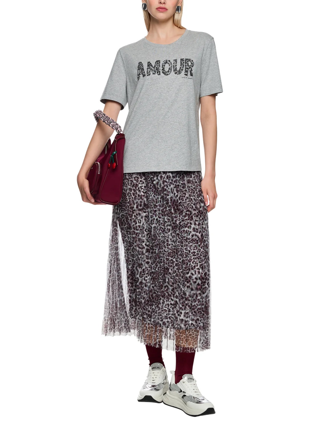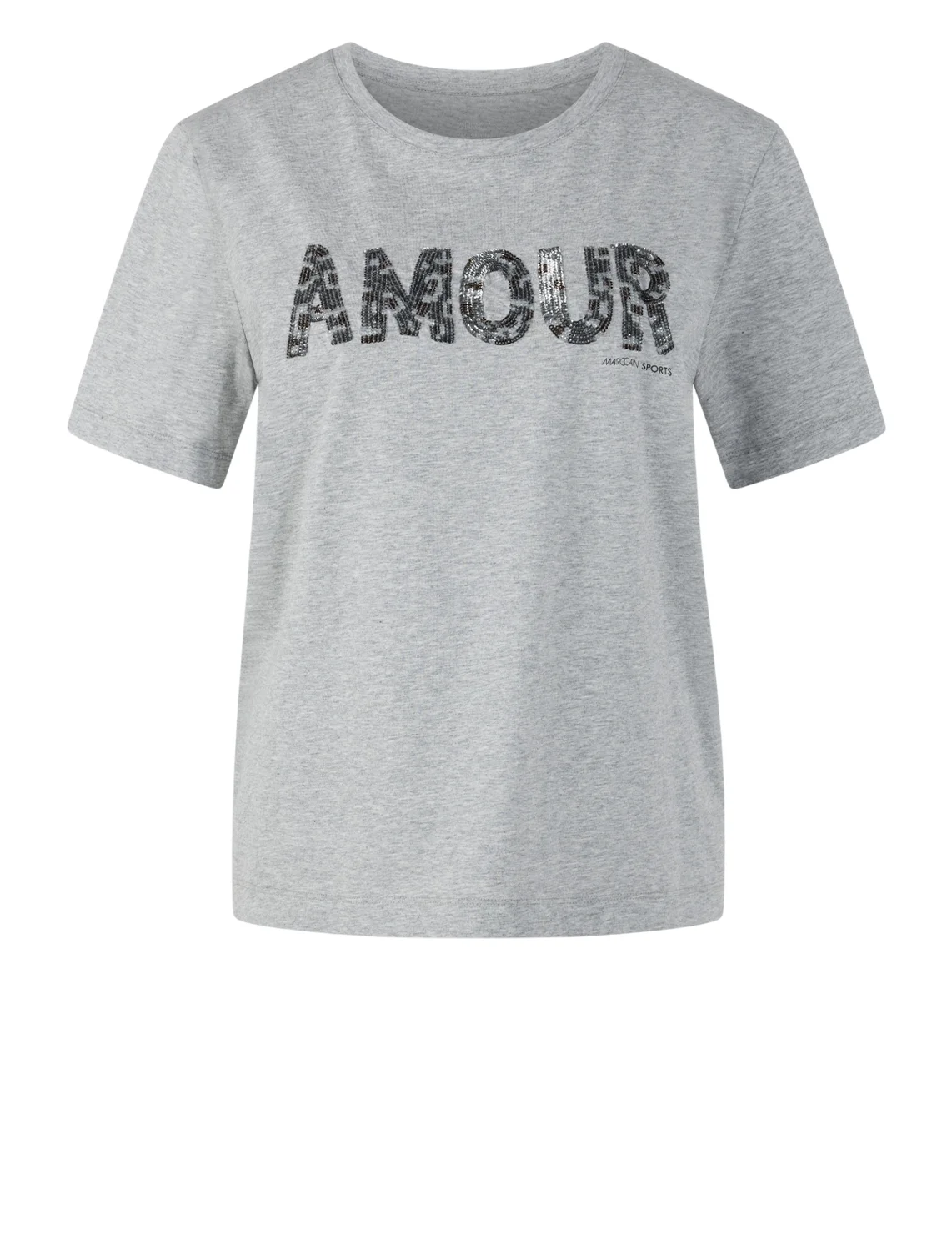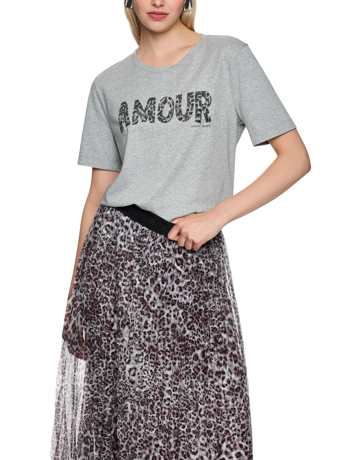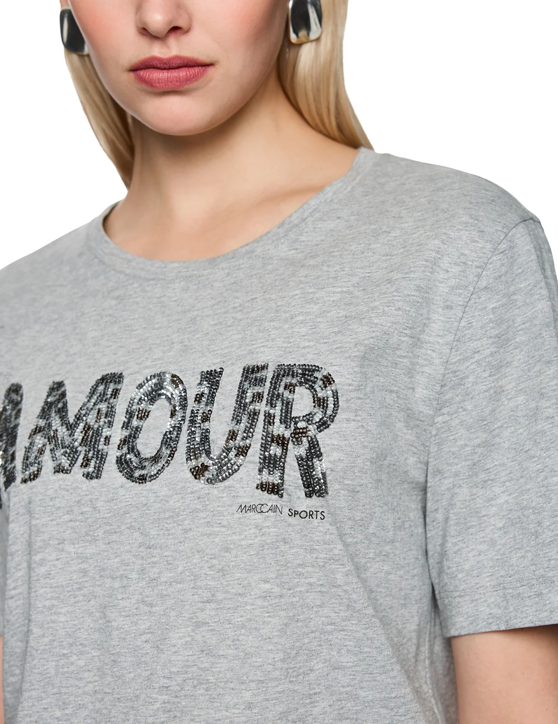 Футболка изготовлена из хлопка высокого качества. Модель выполнена в прямом крое. Имеет круглый вырез горловины и короткие рукава. Декорирована надписью из пайеток и принтом с логотипом бренда.