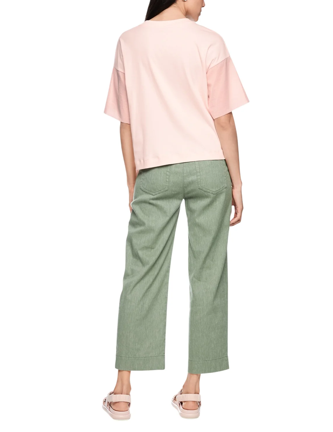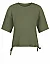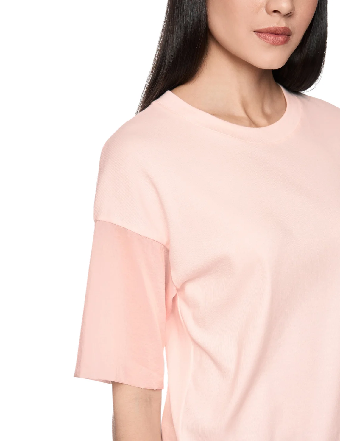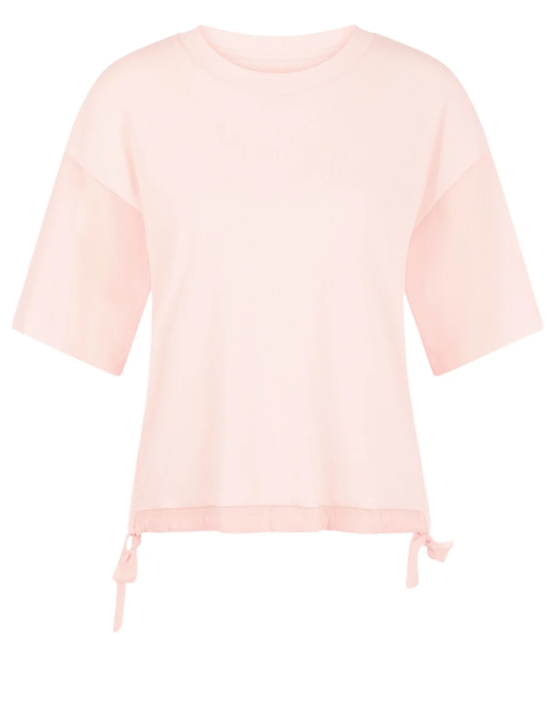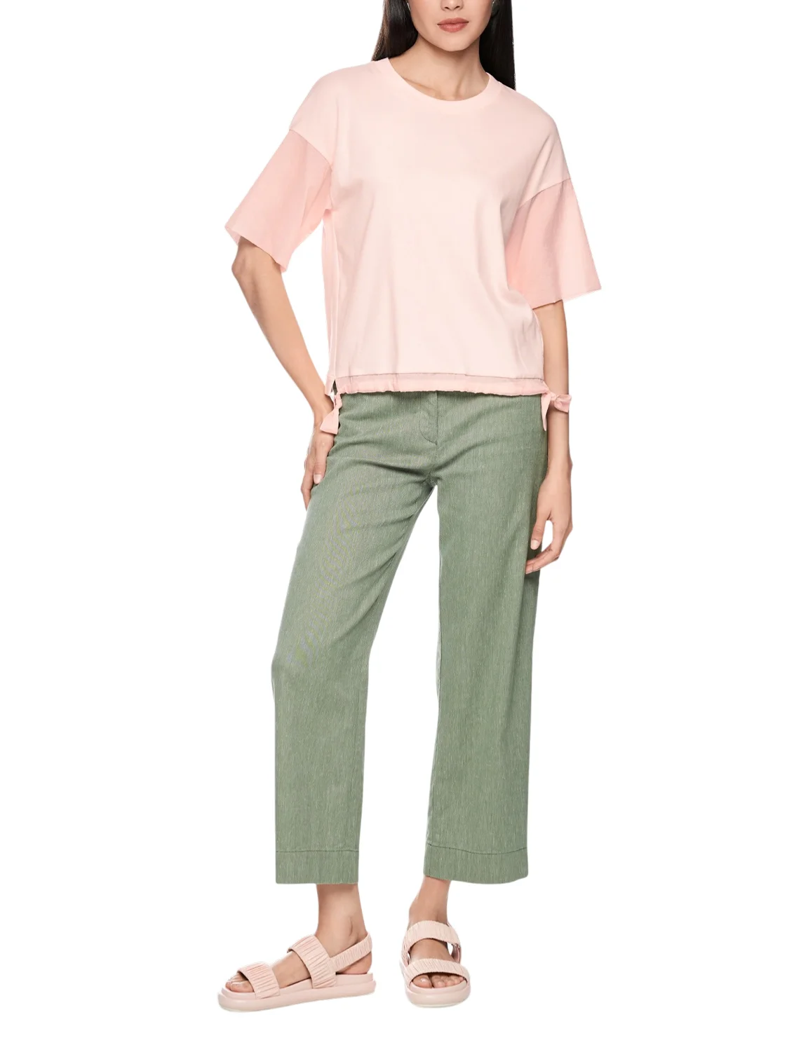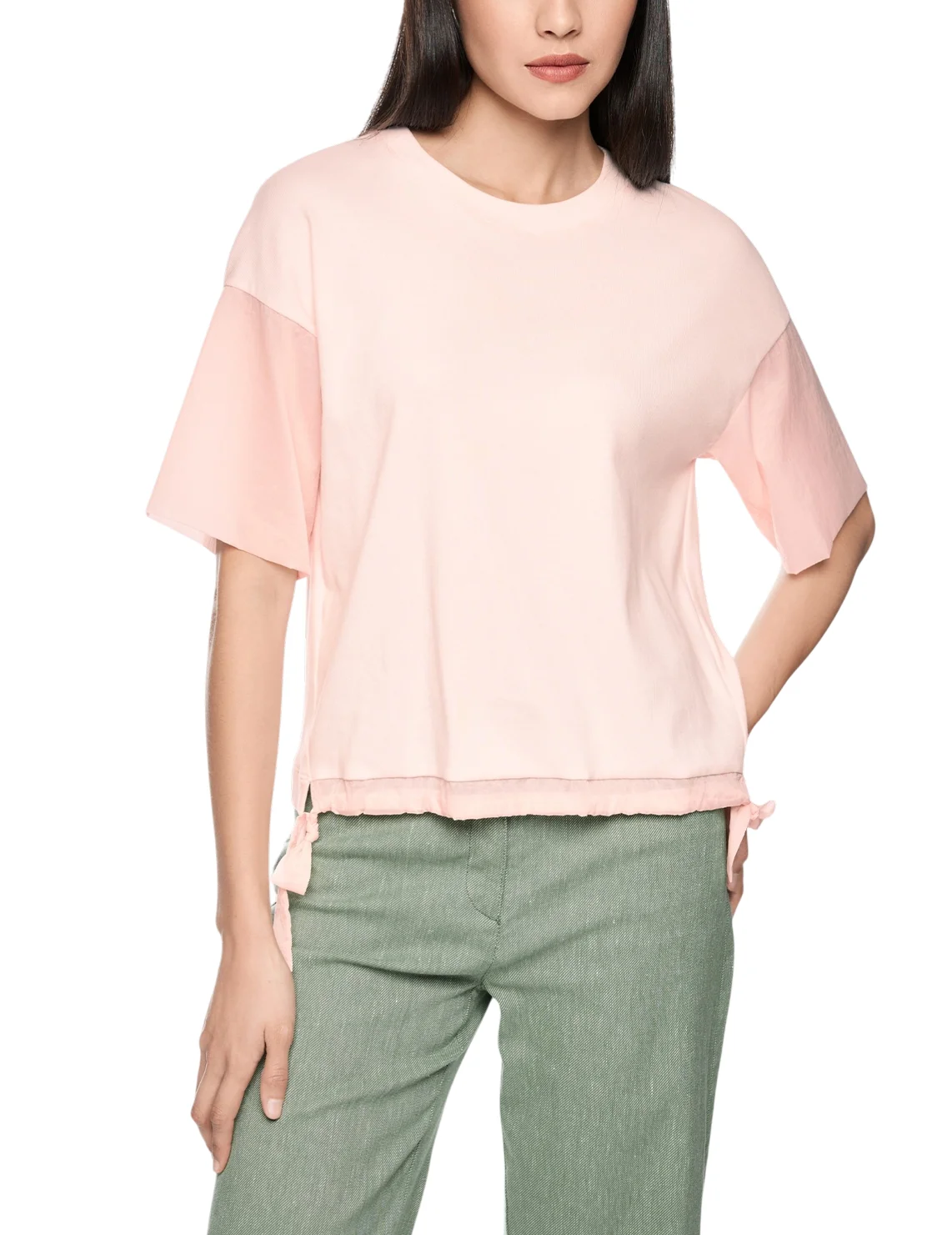 Футболка изготовлена из хлопка и эластана. Модель выполнена в свободном крое. Имеет круглый вырез горловины, заниженную плечевую линию, боковые разрезы, завязки и короткие рукава.