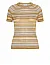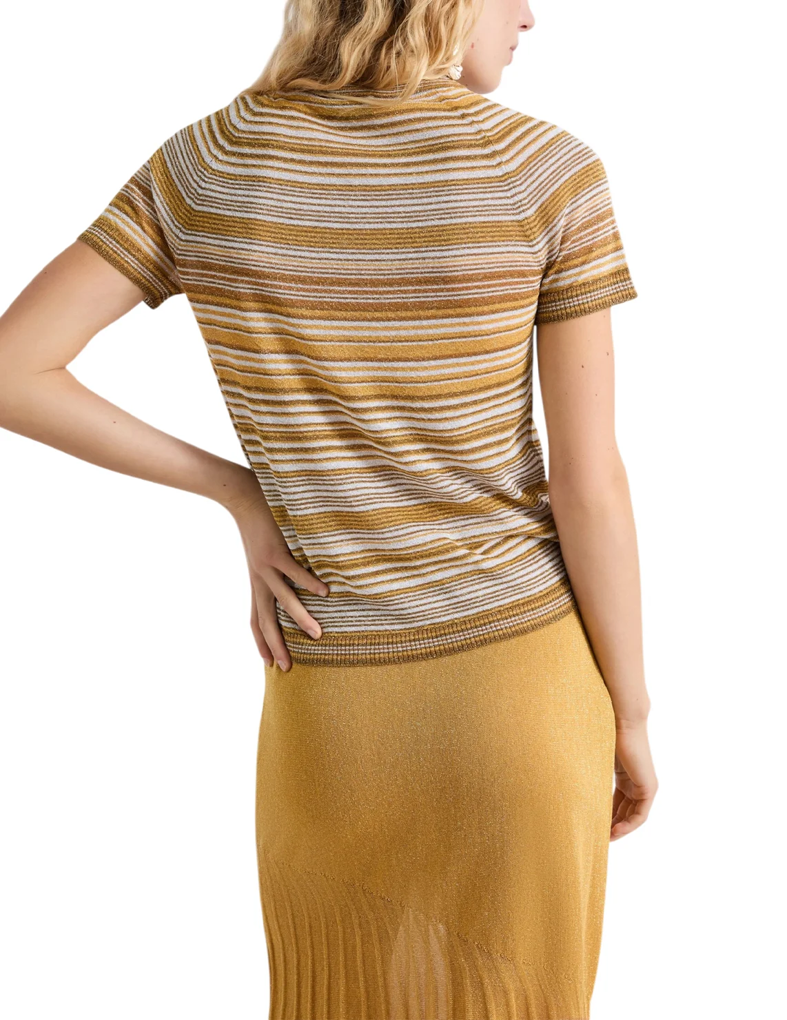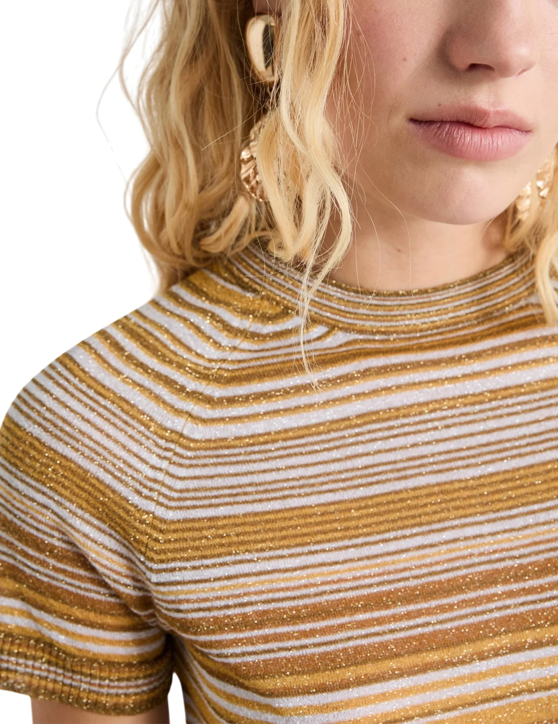 Футболка изготовлена из вискозы, полиамида с использованием металлической нити. Модель изготовлена в приталенном крое. Имеет круглый вырез горловины, короткие рукава и принт в полоску с блестками.