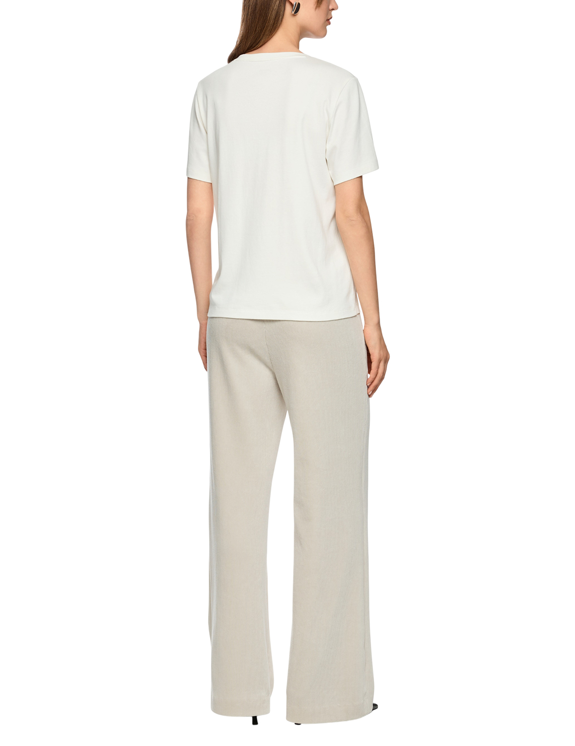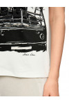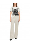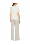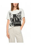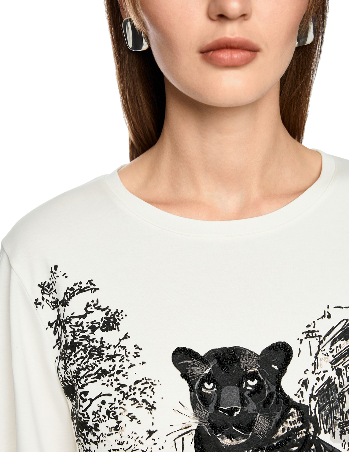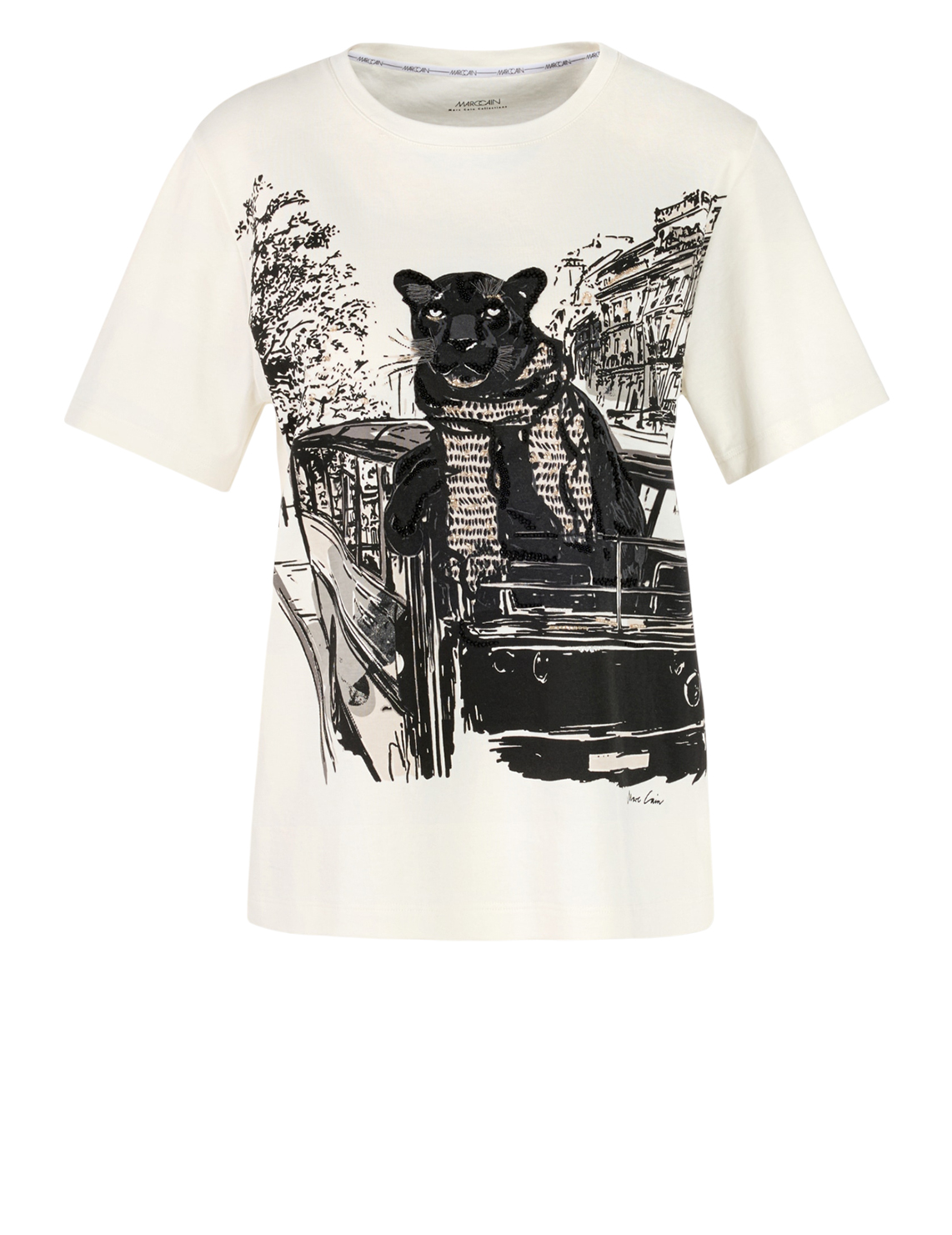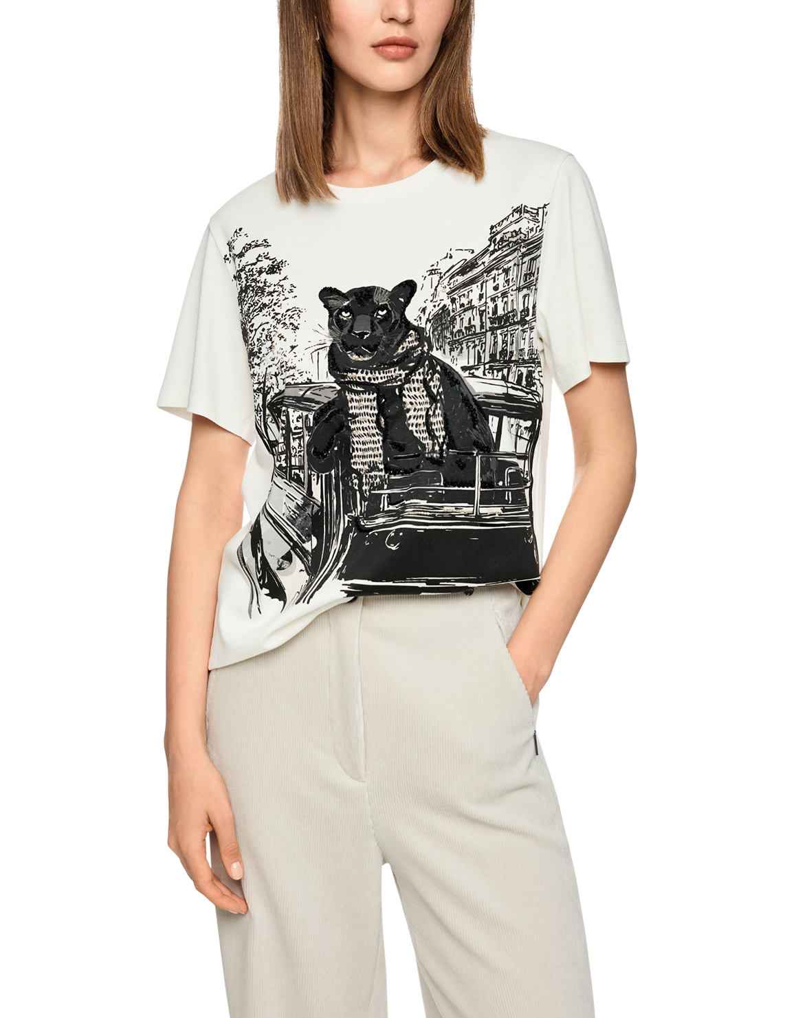 Футболка изготовлена из 100% хлопка высокого качества. Модель выполнена в свободном крое. Имеет круглый вырез горловины и короткие рукава. Декорирована оригинальным принтом и бусинами.