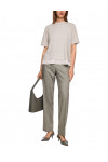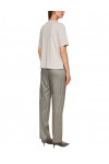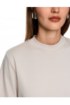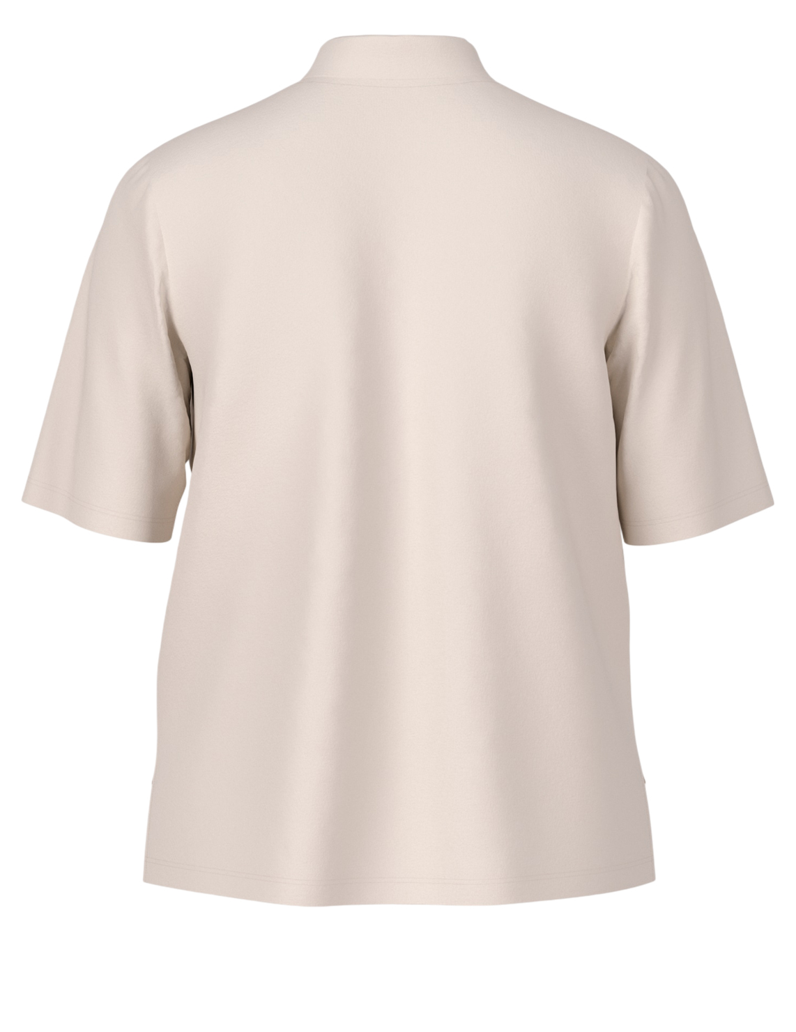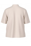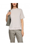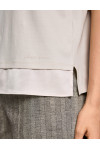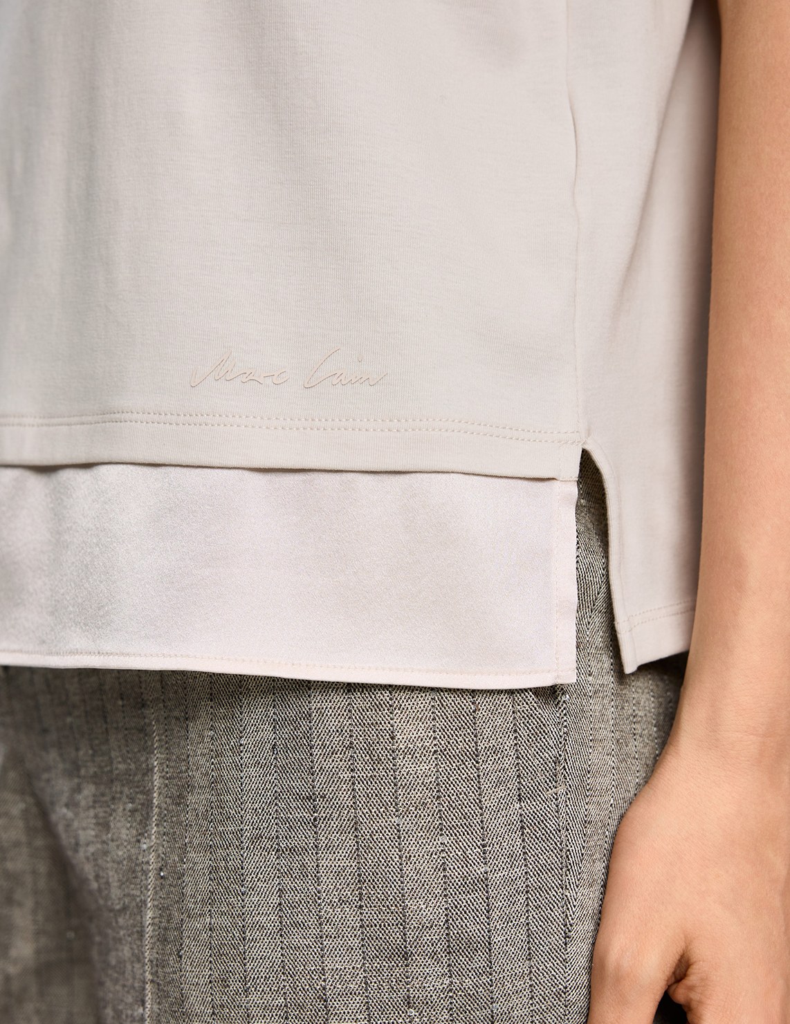 Футболка изготовлена из хлопка и эластана, вставка из шелка и эластана. Модель выполнена в свободном крое. Имеет воротник-стойку, боковые разрезы, шелковую вставку и короткие рукава. Декорирована логотипом бренда на подоле.