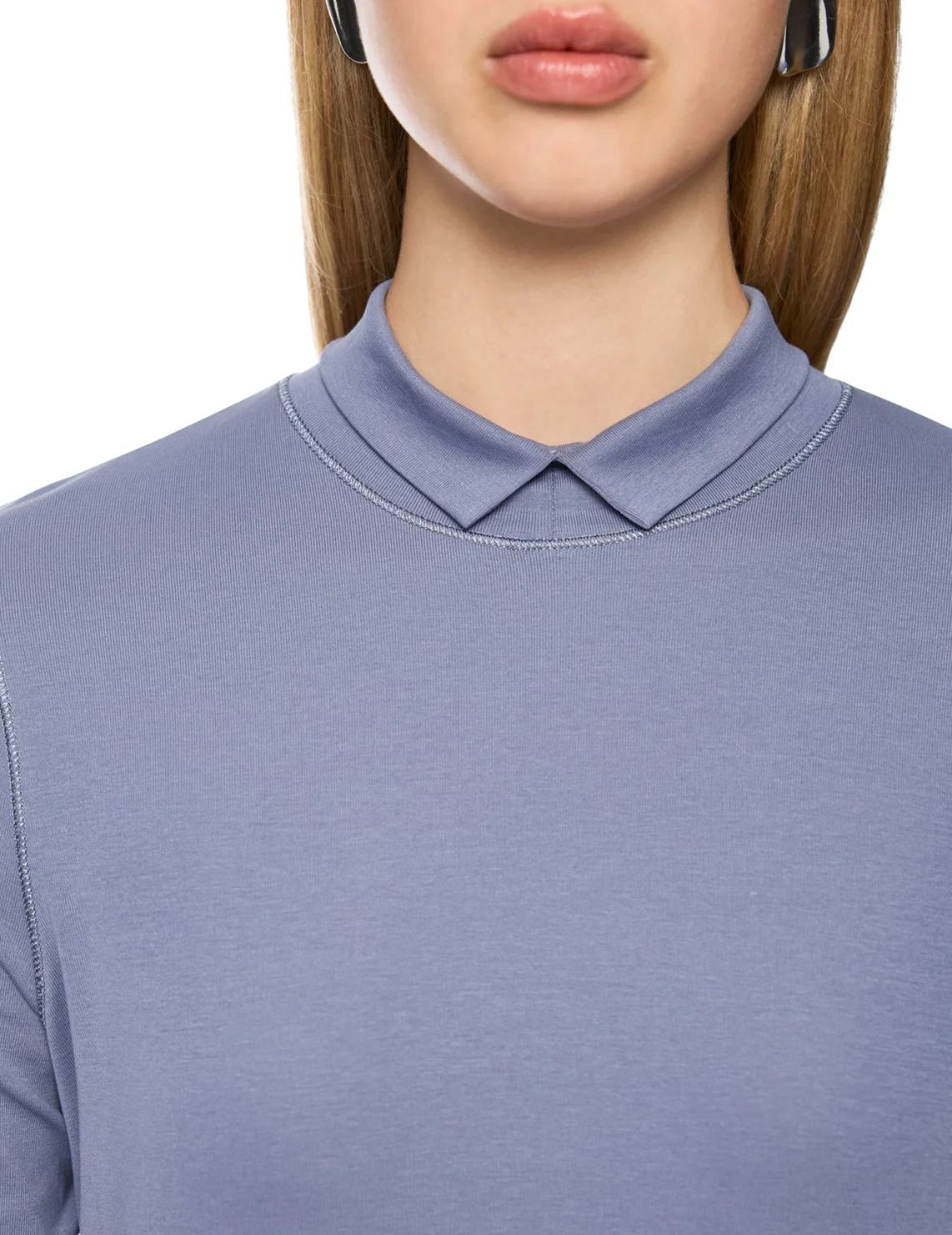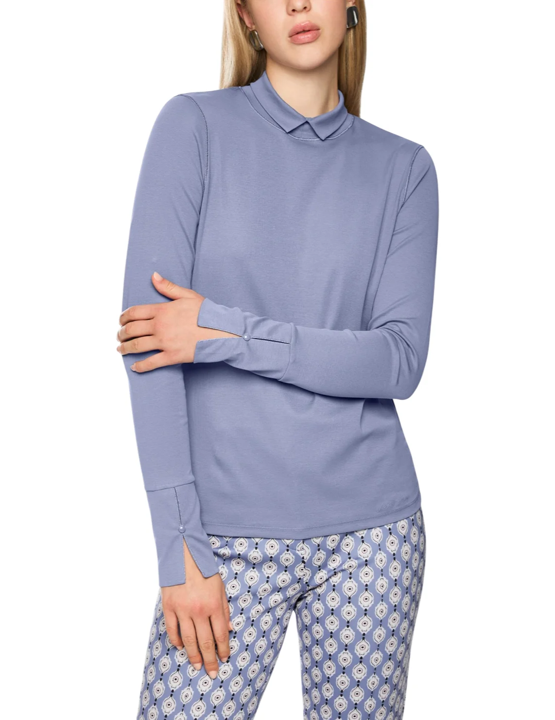 Гольф изготовлен из хлопка и эластана. Модель выполнена в приталенном крое. Имеет воротник-стойку с V-образным вырезом и длинные рукава с застежкой на пуговицы.