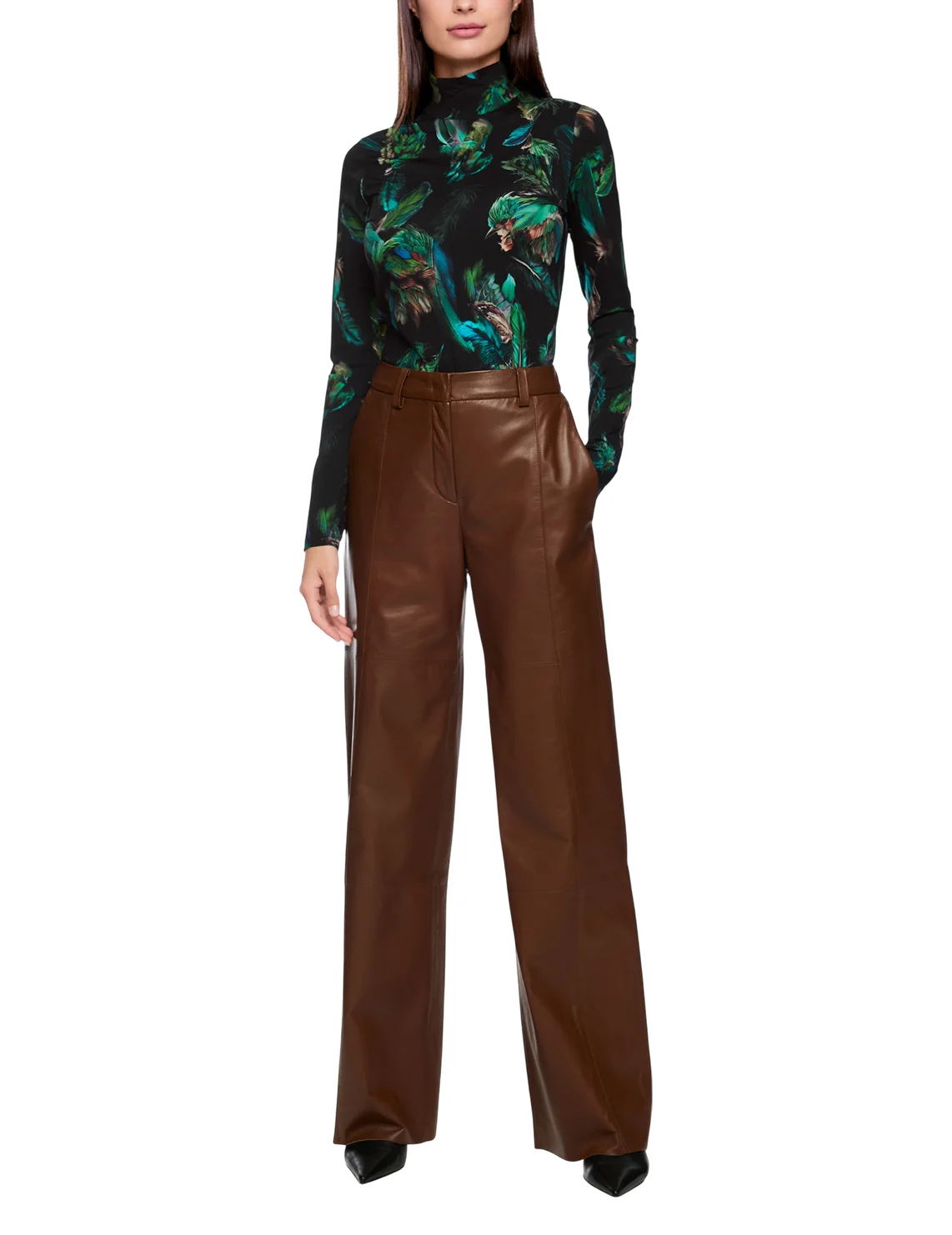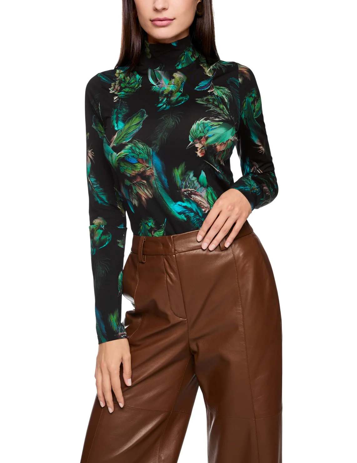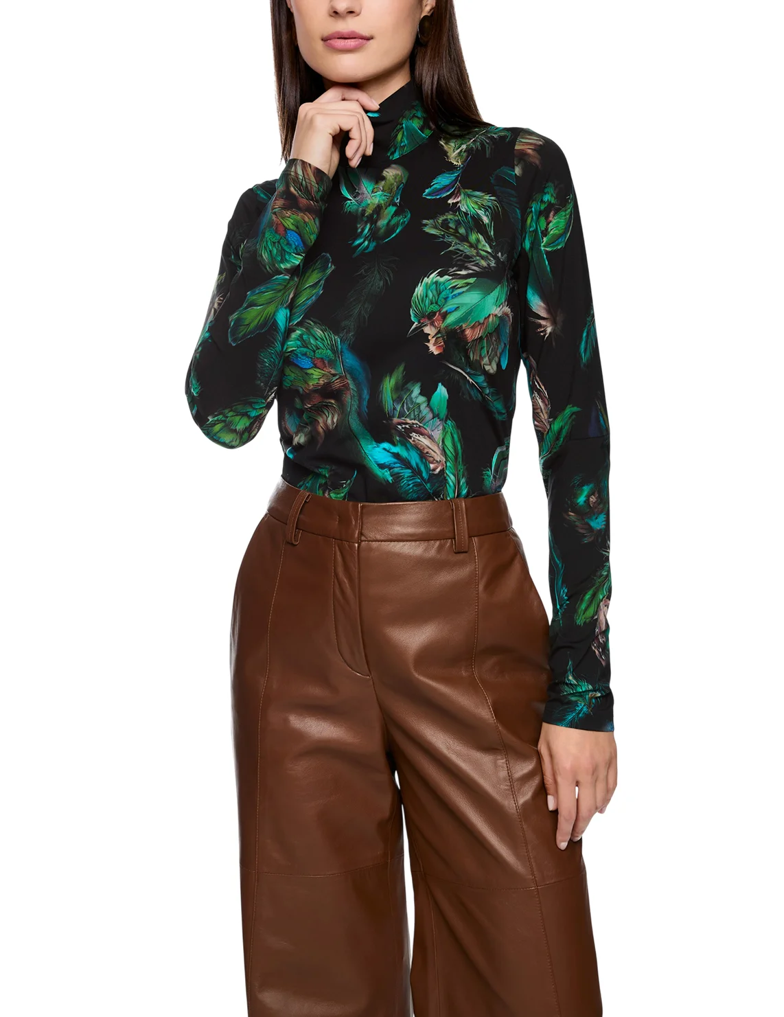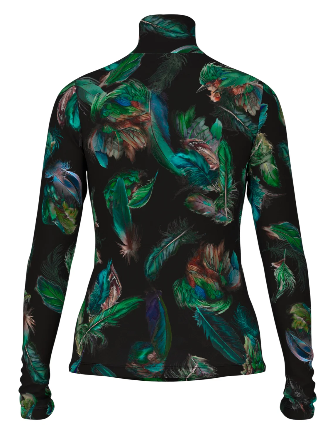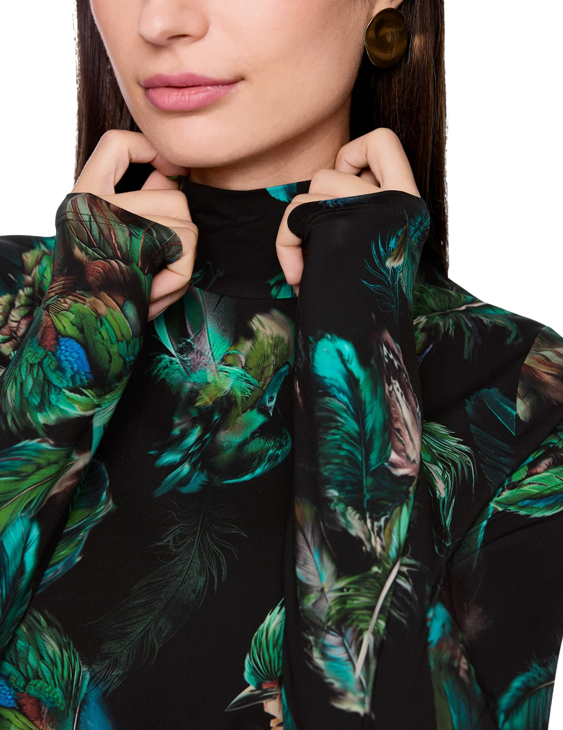 Гольф изготовлен из полиамида и эластана. Модель выполнена в приталенном крое. Имеет воротник-стойку и длинные рукава. Декорирован оригинальным принтом.