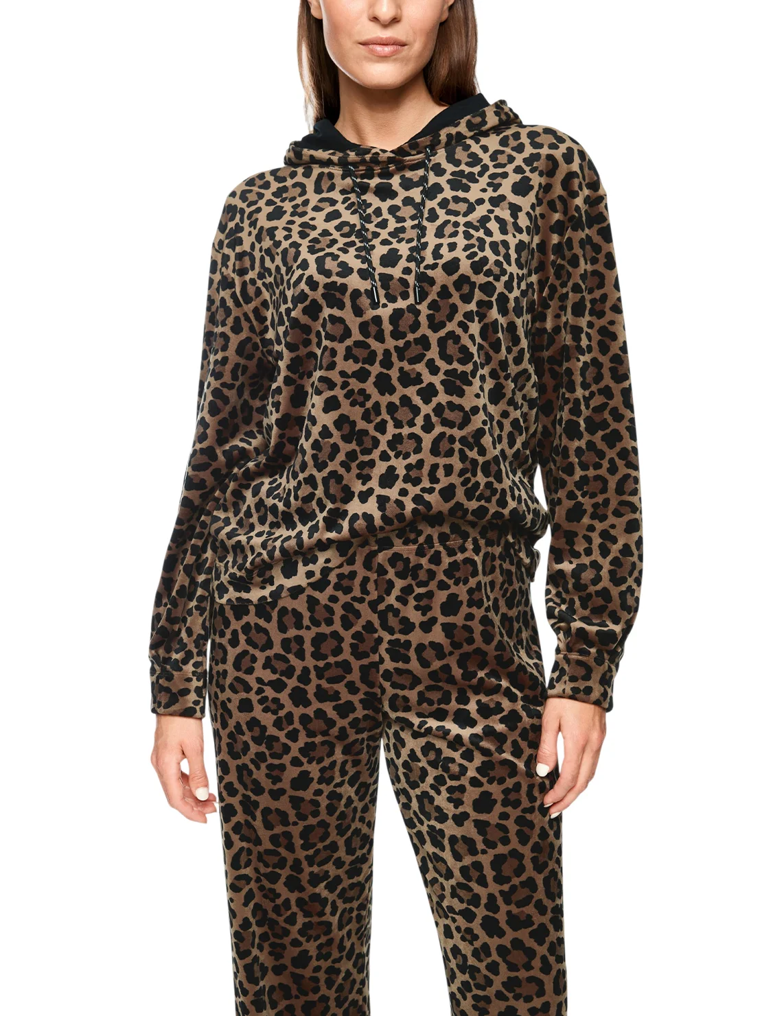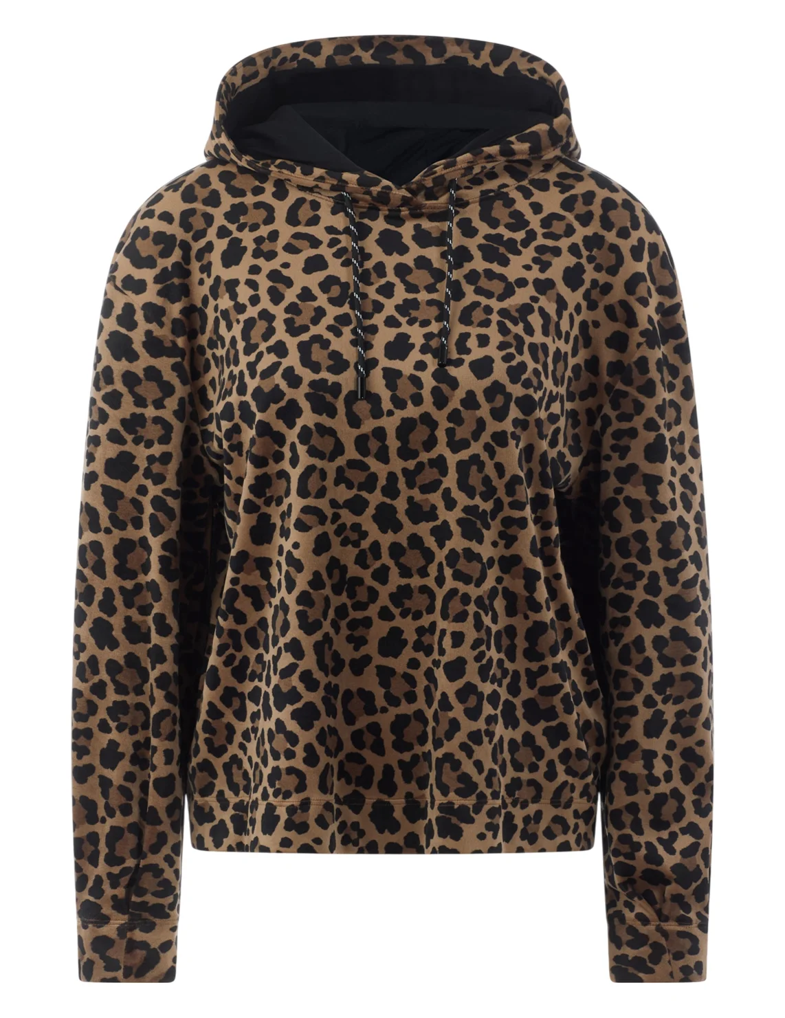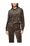 Худи изготовлено из полиэстера и эластана. Модель выполнена в свободном крое. Имеет капюшон с кулиской и длинные рукава с манжетами. Декорировано анималистичным принтом.