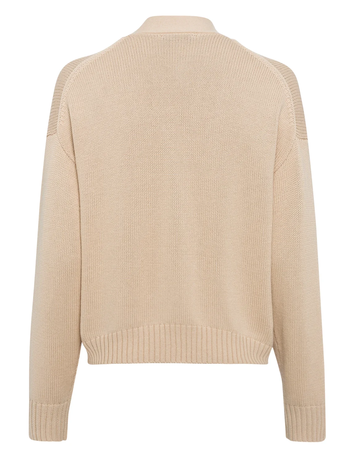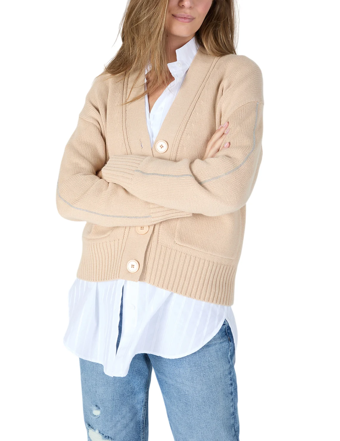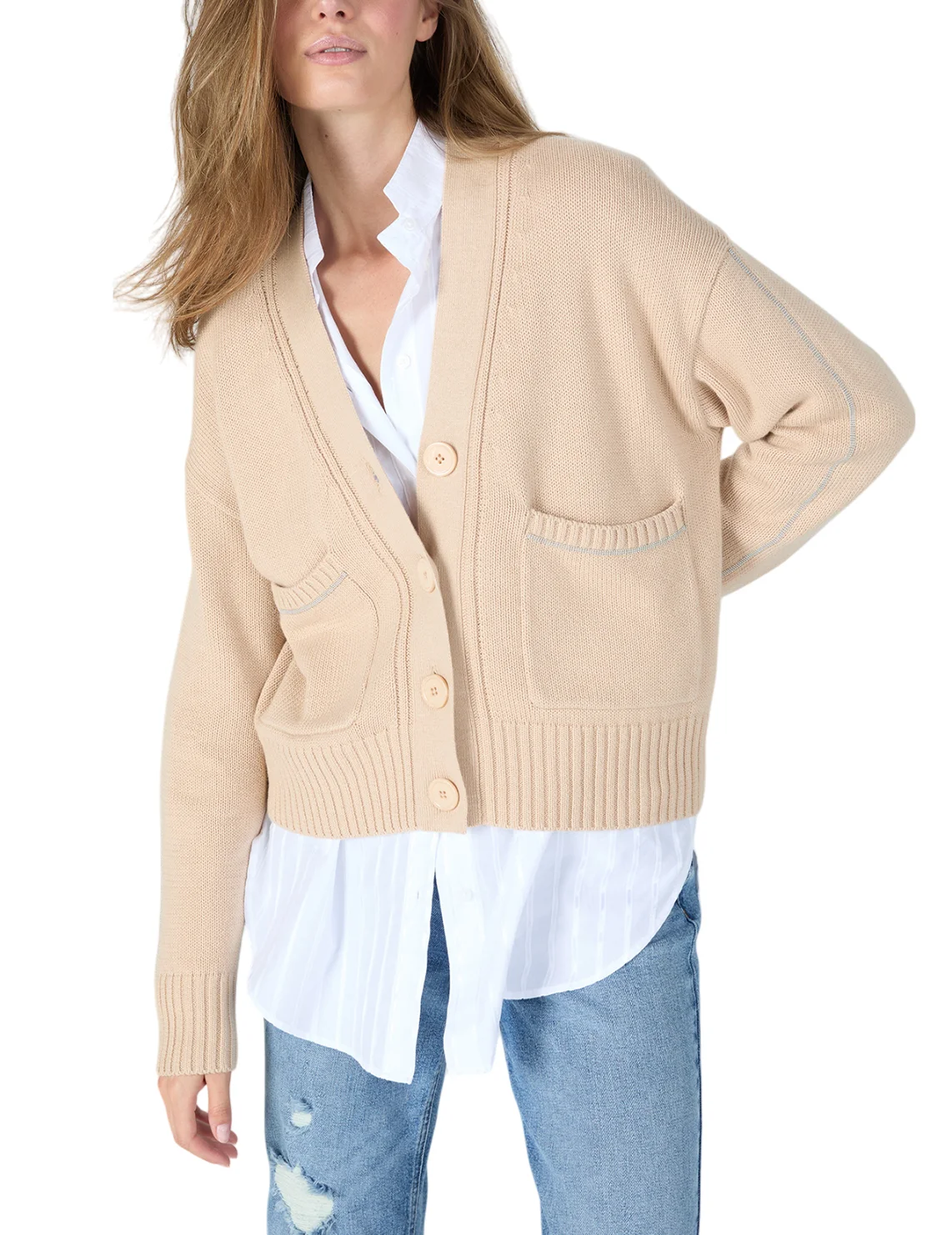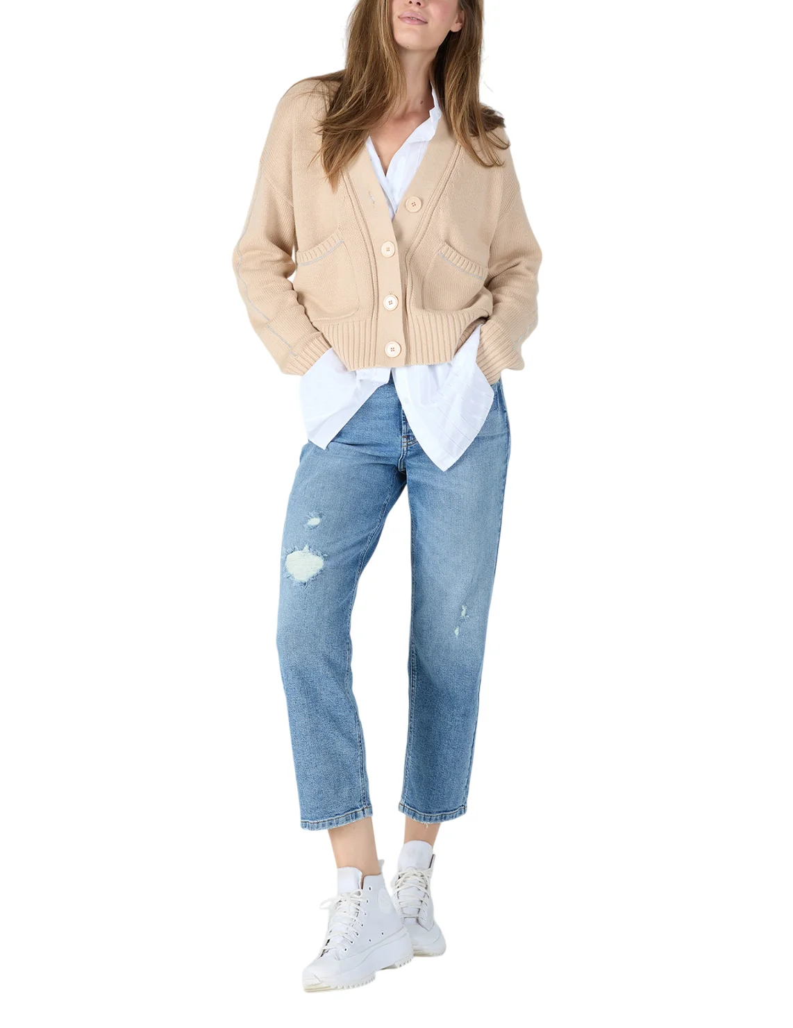 Кардиган изготовлен из хлопка и кашемира. Модель выполнена в свободном крое. Имеет V-образный вырез горловины, застежку на пуговицы, накладные карманы спереди и длинные рукава с манжетами в рубчик.